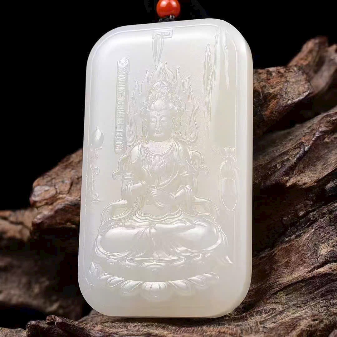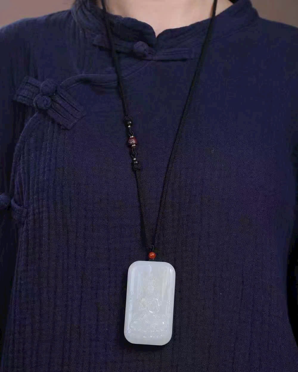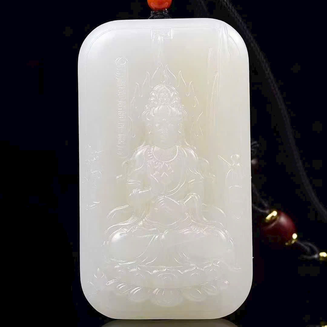 Mặt dây dày dặn, sang trọng, ngọc mịn màng, ấm nhuận, sắc ngọc dịu dàng. Tác phẩm danh sư chế tác thuần thủ công, khắc hai mặt Quan Âm, thể hiện sự bồ đề cứu độ chúng sinh. Quan Âm cầm hoa sen, từ hòa – trang nghiêm, an tọa trên tòa sen, hiện tướng cát tường, chờ đợi người hữu duyên.