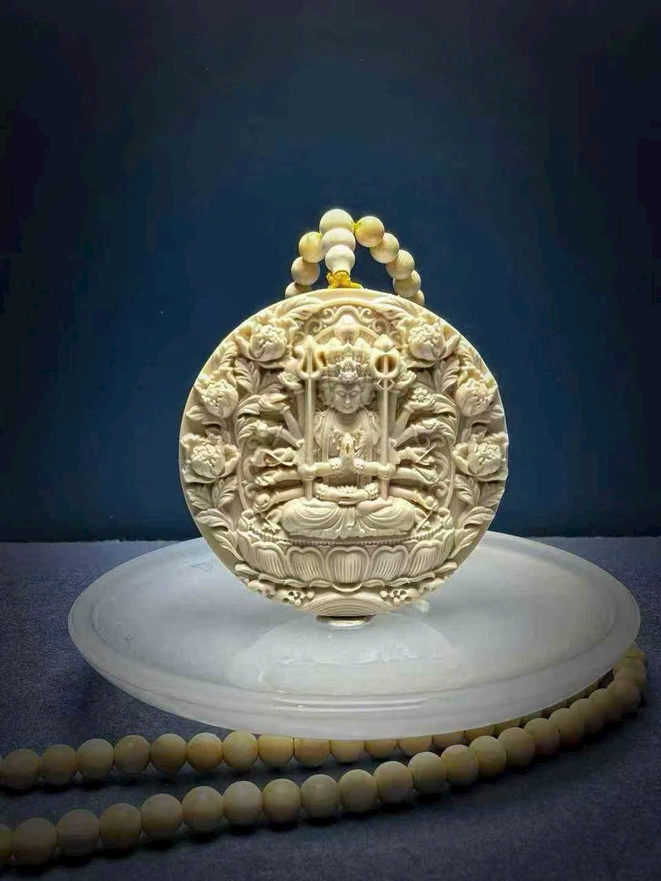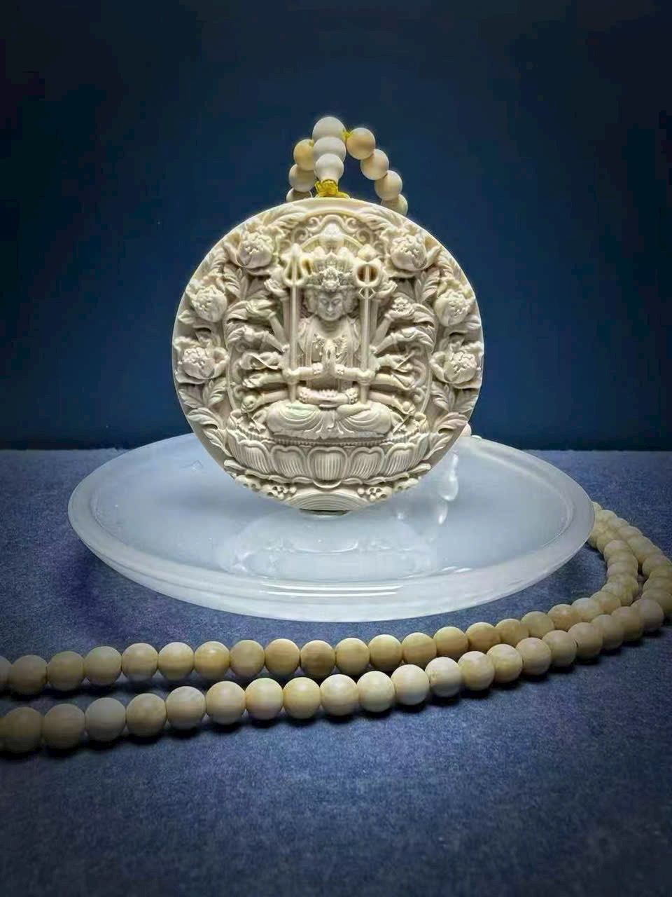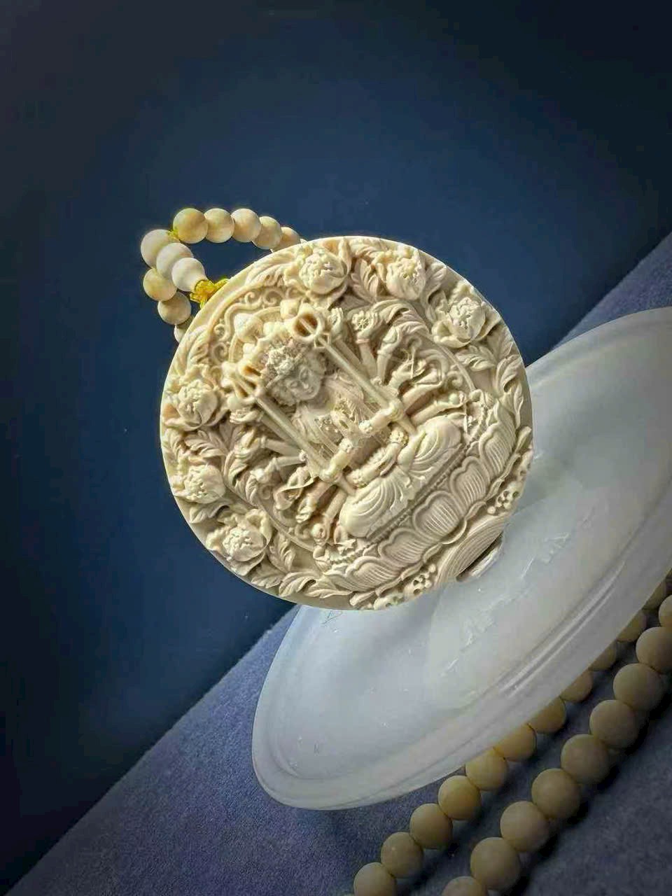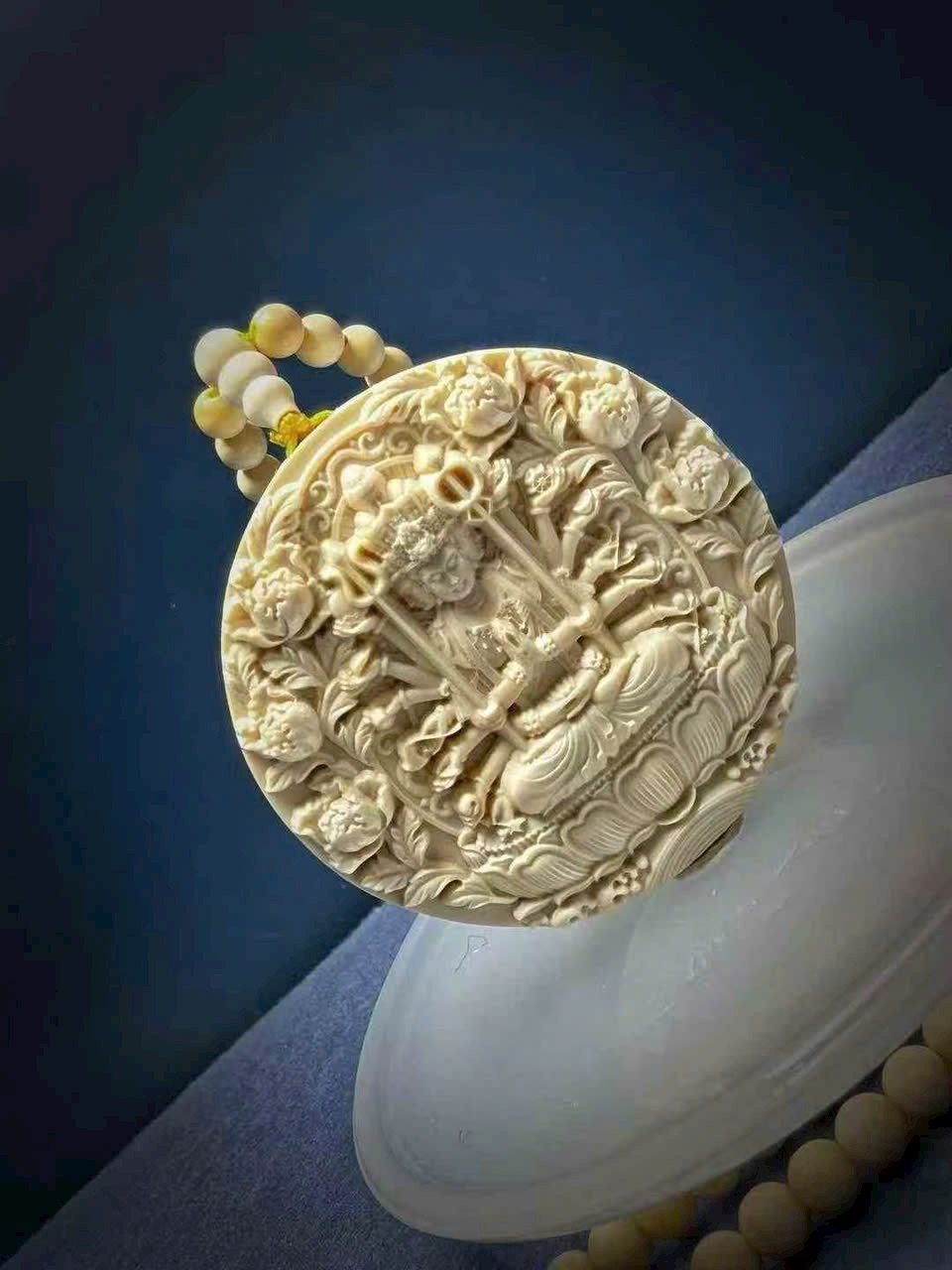 Mặt tròn thủ công, chạm khắc tinh xảo; là vị hộ thân thần của người tuổi Tý. Tác phẩm được tuyển chọn từ tâm ngà trong suốt như thạch, chất liệu mịn, vân đầy đẹp mắt. Tạo hình kinh điển, thần thái sinh động, đường đao sắc nét – xứng đáng là món quý phẩm sưu tầm.
