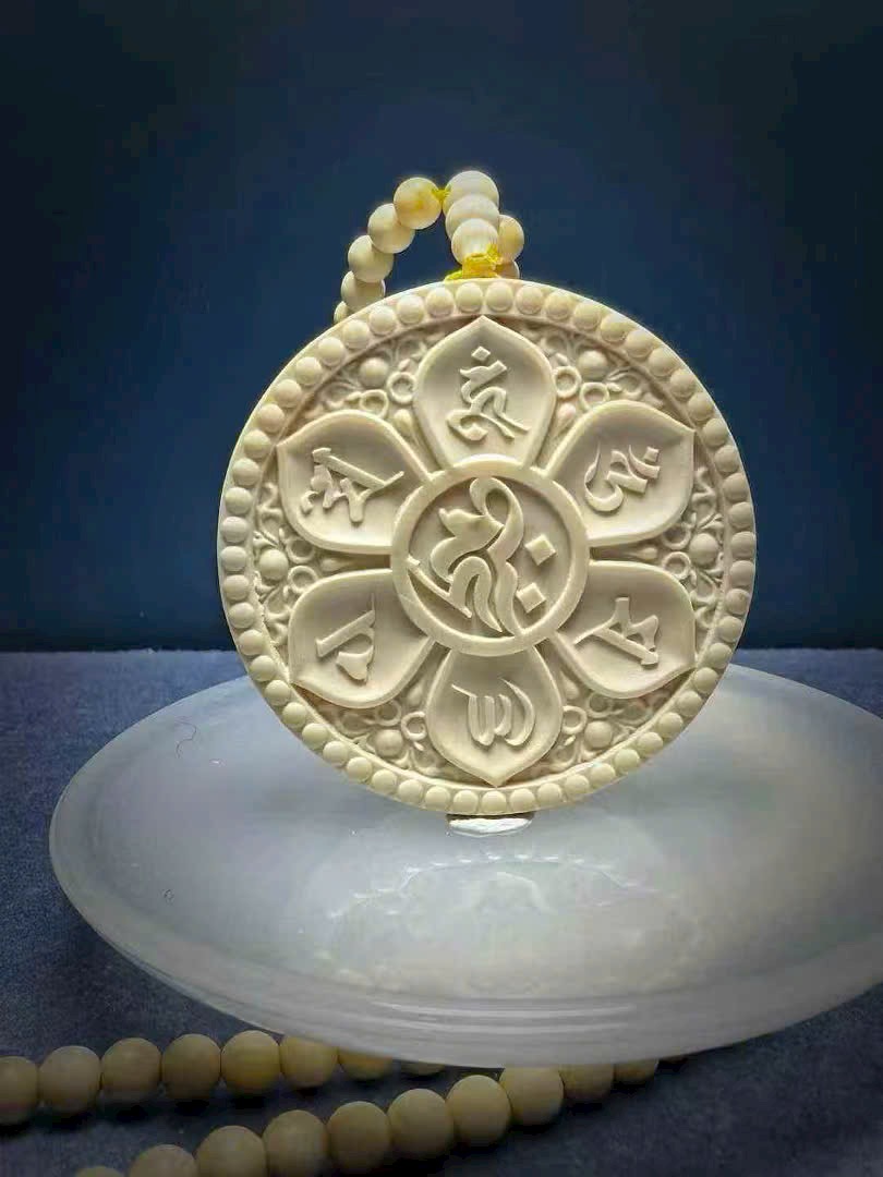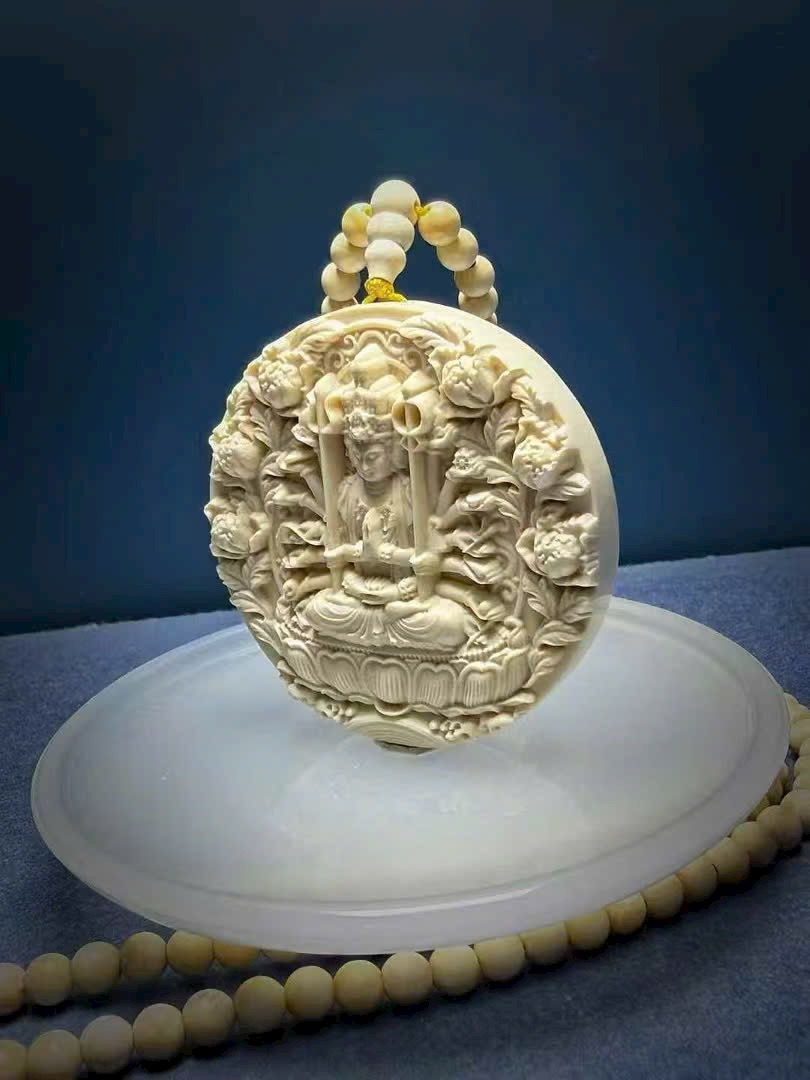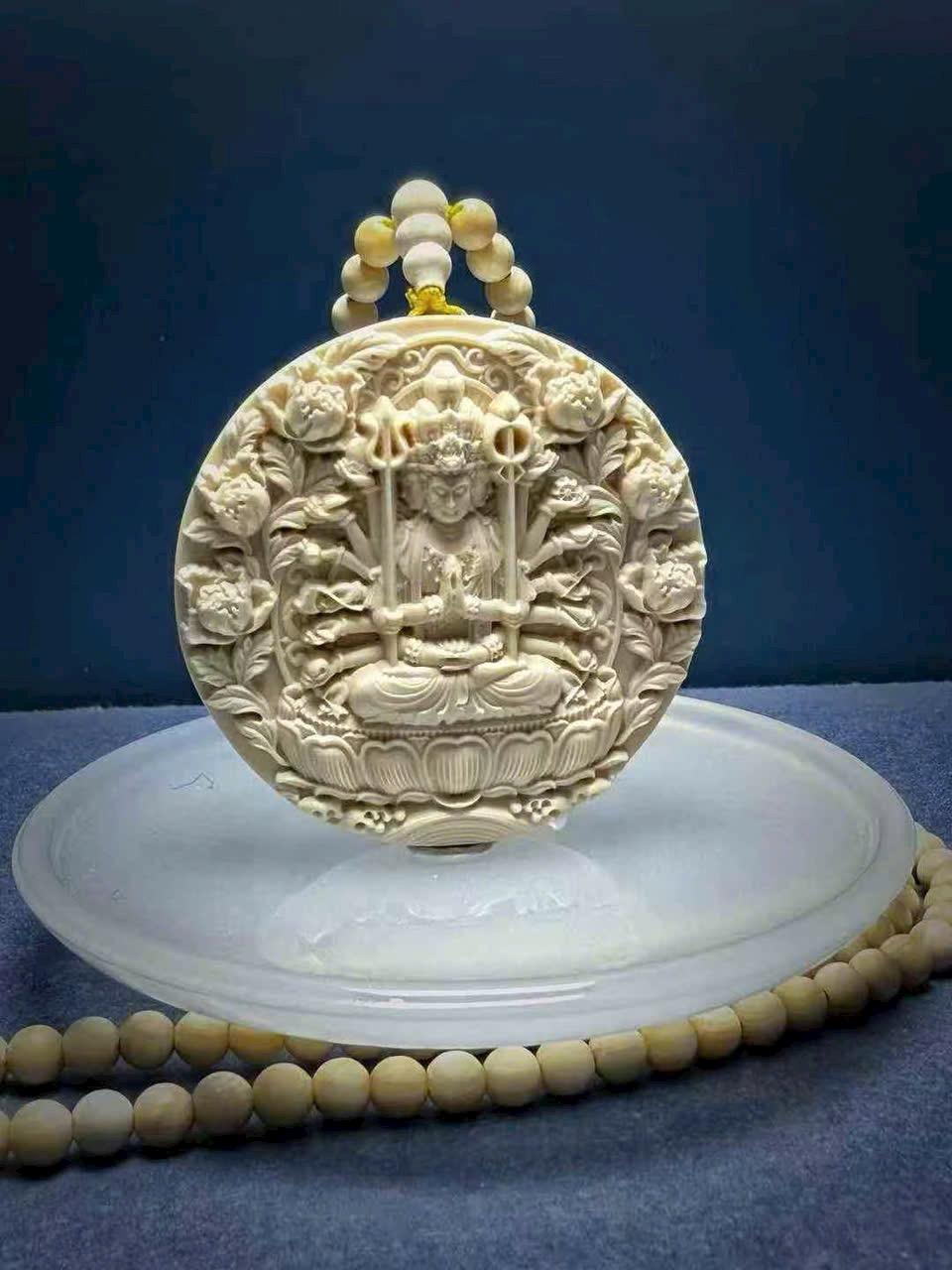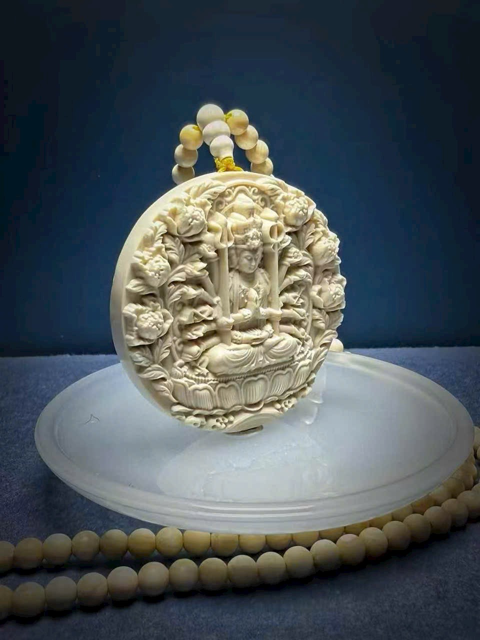 Mặt tròn thủ công, chạm khắc tinh xảo; là vị hộ thân thần của người tuổi Tý. Tác phẩm được tuyển chọn từ tâm ngà trong suốt như thạch, chất liệu mịn, vân đầy đẹp mắt. Tạo hình kinh điển, thần thái sinh động, đường đao sắc nét – xứng đáng là món quý phẩm sưu tầm.