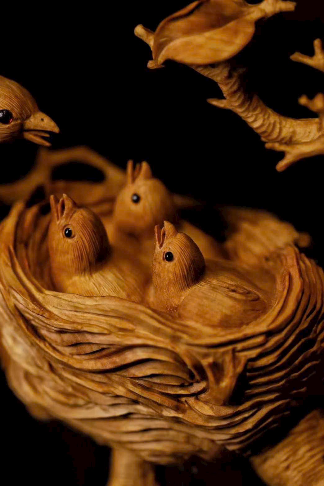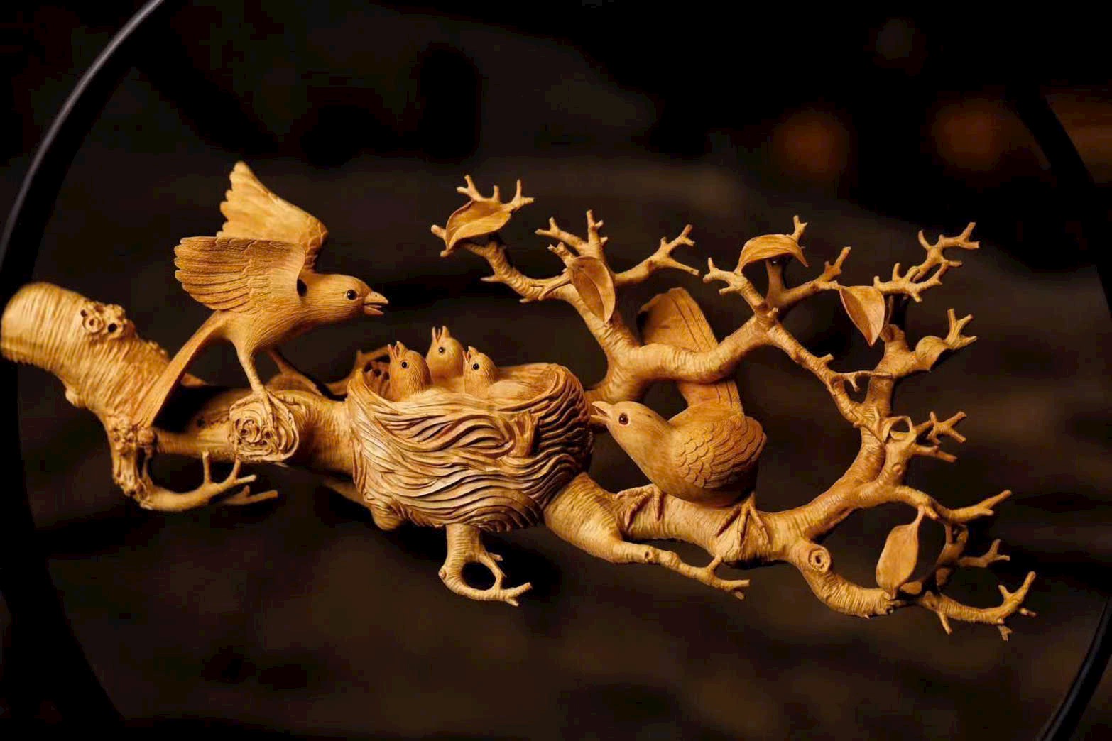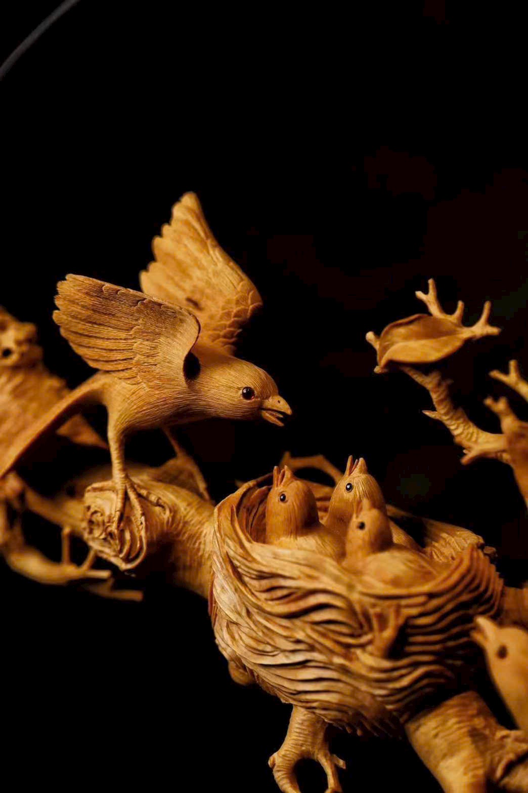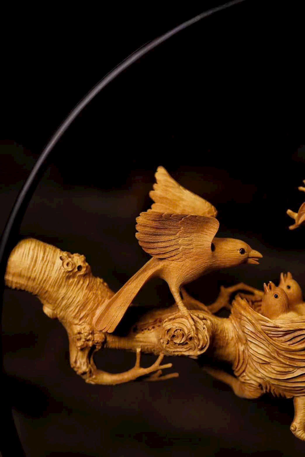 Tác phẩm chạm khắc tinh xảo từ gỗ hoàng dương, đặt trên nền trăng tròn bằng gỗ tử đàn, khắc họa cảnh chim mẹ che chở con non. Gỗ hoàng dương ấm áp, trăng tròn tượng trưng cho sự viên mãn, truyền tải trọn vẹn tình thân đậm sâu trong văn hóa Trung Hoa.