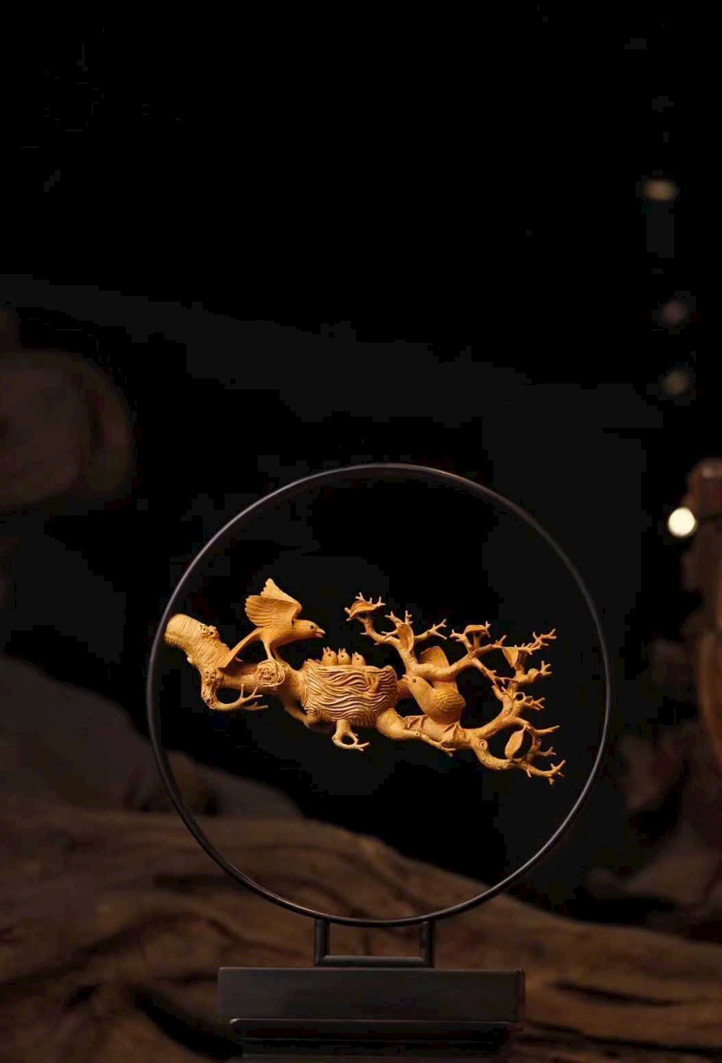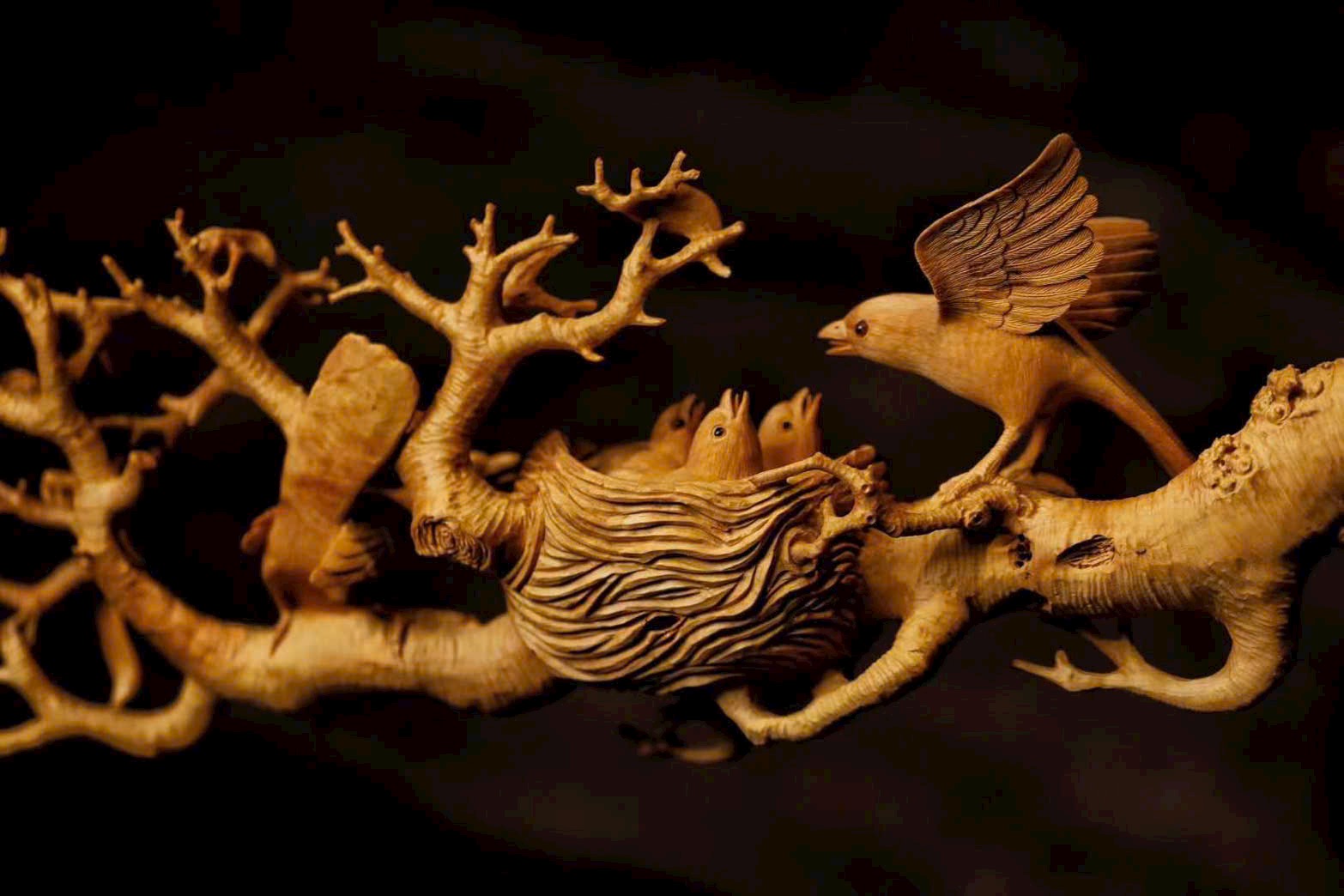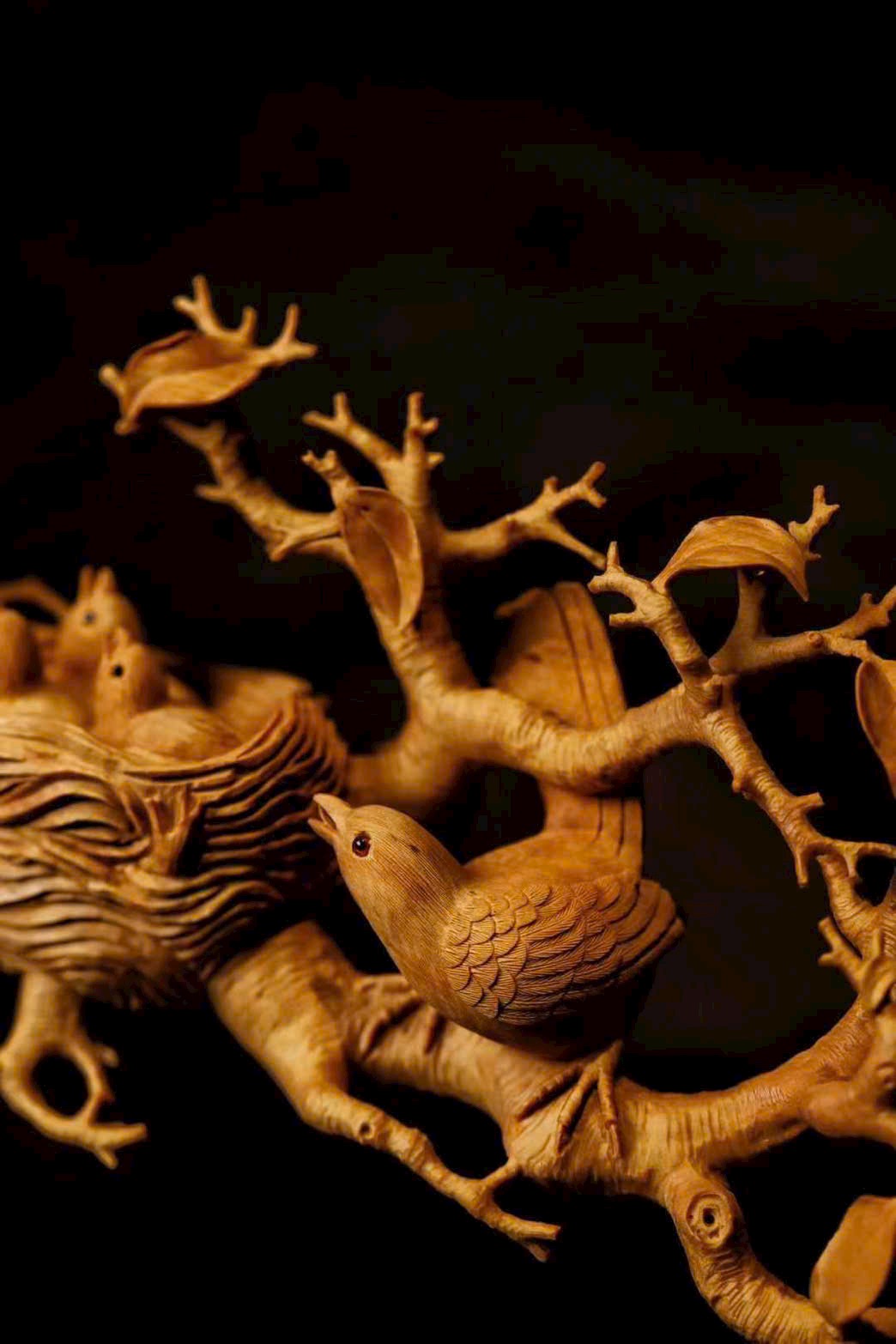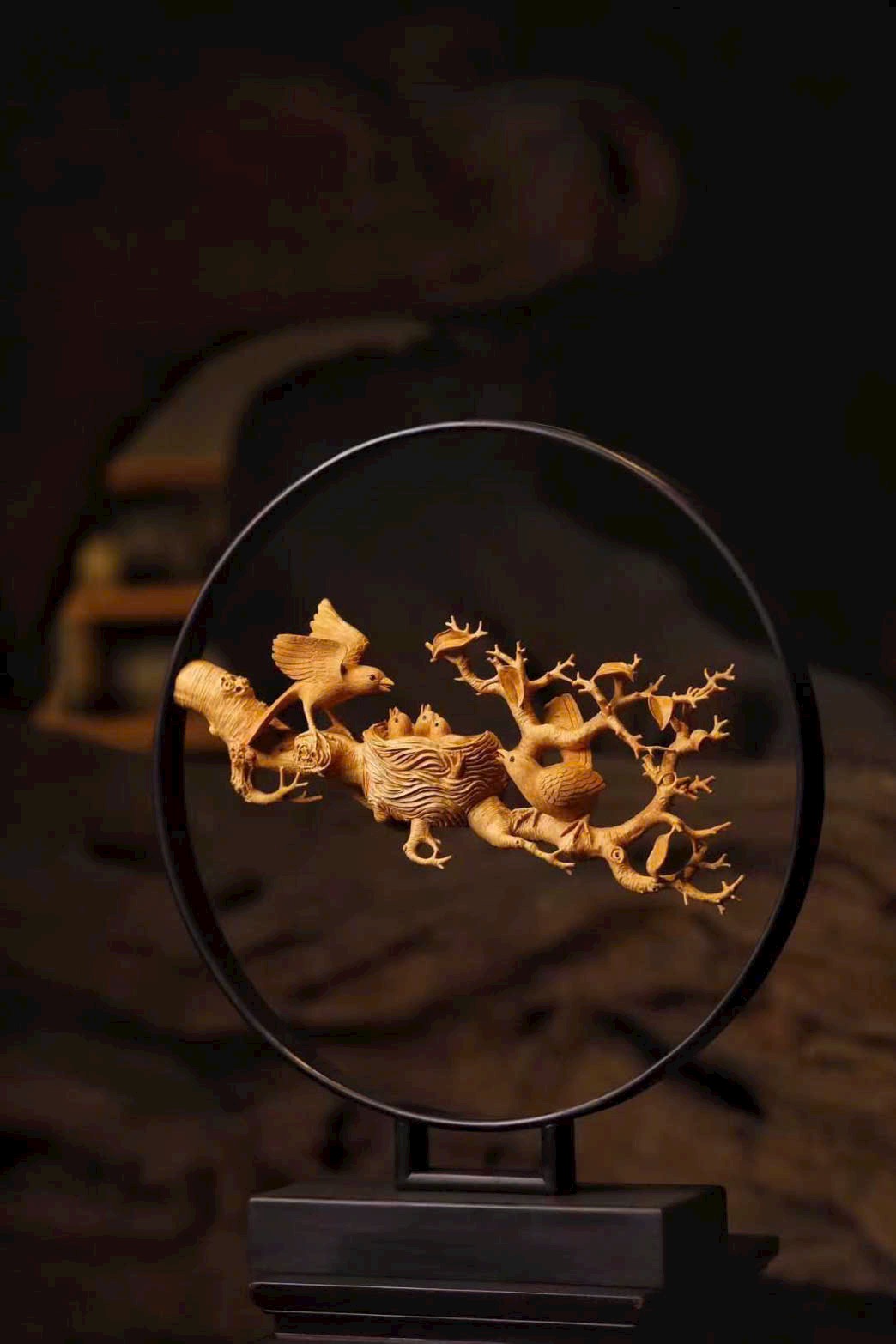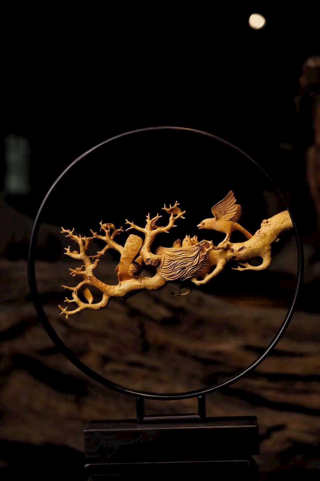 Tác phẩm chạm khắc tinh xảo từ gỗ hoàng dương, đặt trên nền trăng tròn bằng gỗ tử đàn, khắc họa cảnh chim mẹ che chở con non. Gỗ hoàng dương ấm áp, trăng tròn tượng trưng cho sự viên mãn, truyền tải trọn vẹn tình thân đậm sâu trong văn hóa Trung Hoa.