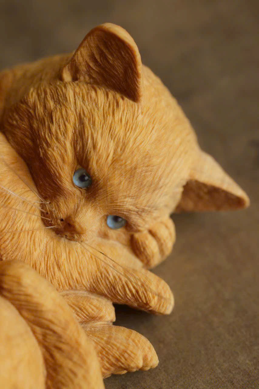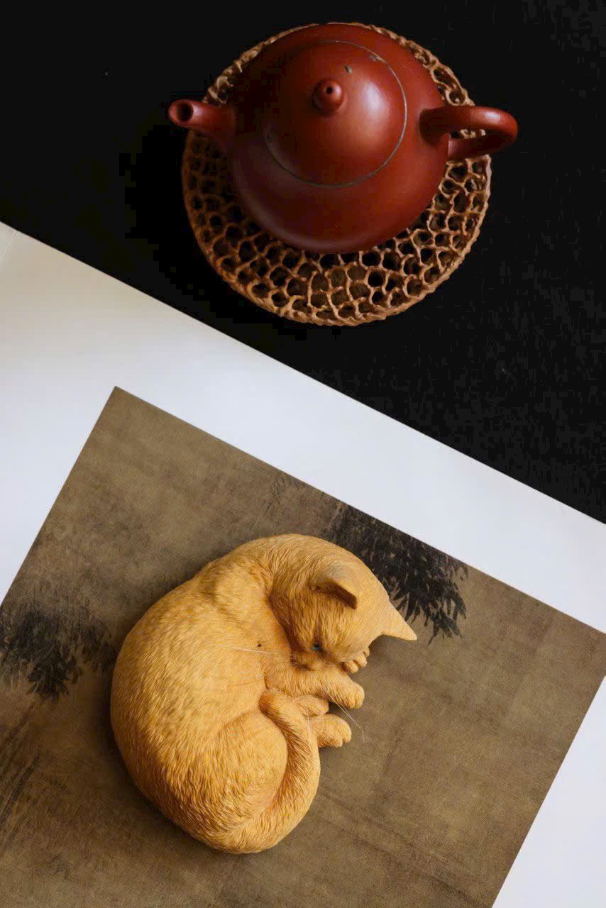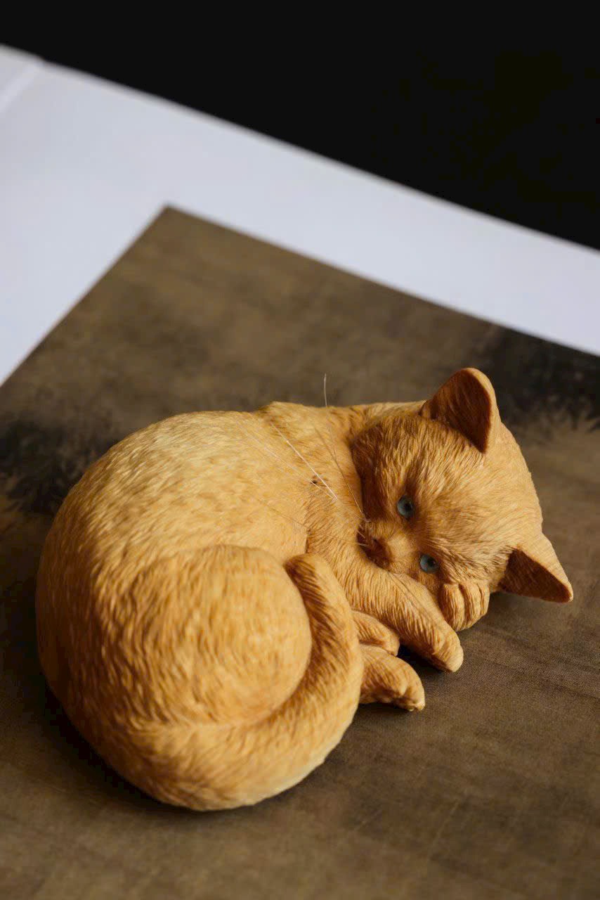 Điêu khắc gỗ hoàng dương, vân gỗ mịn dày, thân hình tròn trịa dễ thương, thần thái sinh động ngộ nghĩnh.