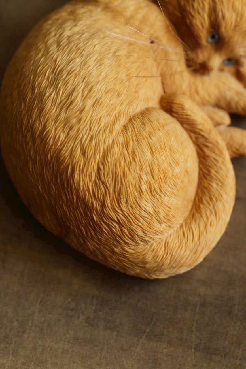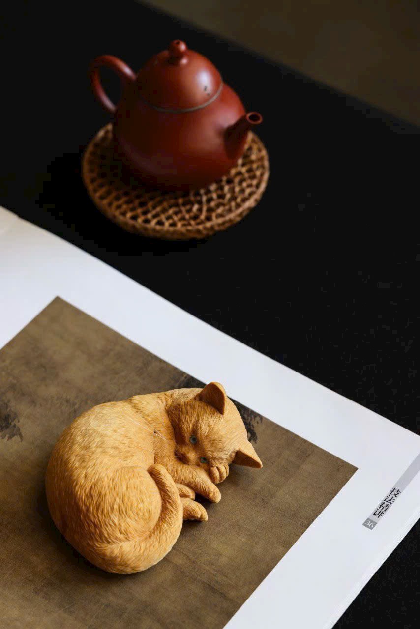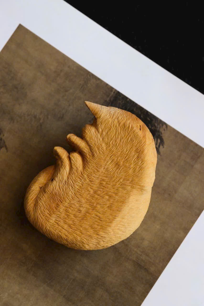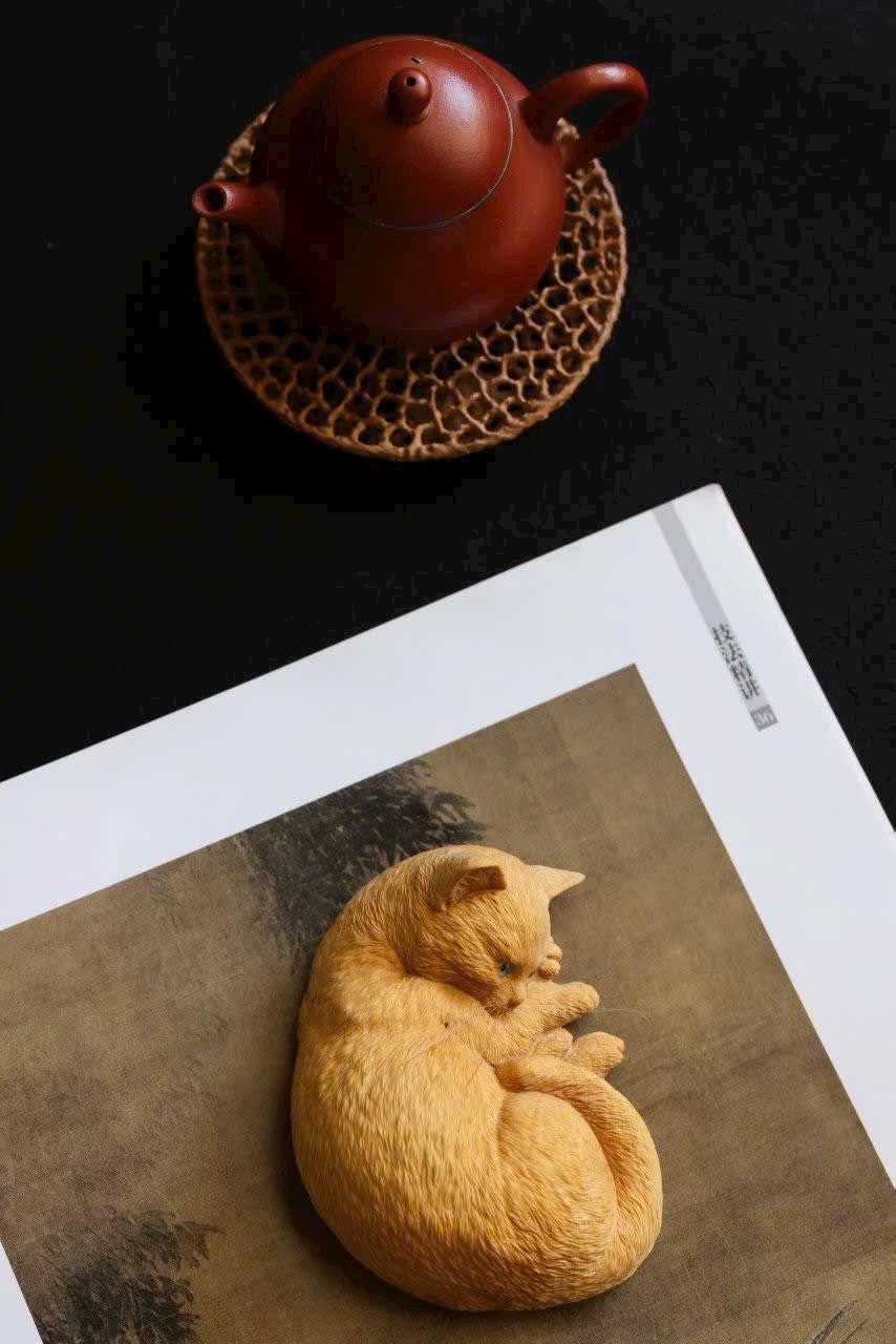 Điêu khắc gỗ hoàng dương, vân gỗ mịn dày, thân hình tròn trịa dễ thương, thần thái sinh động ngộ nghĩnh.