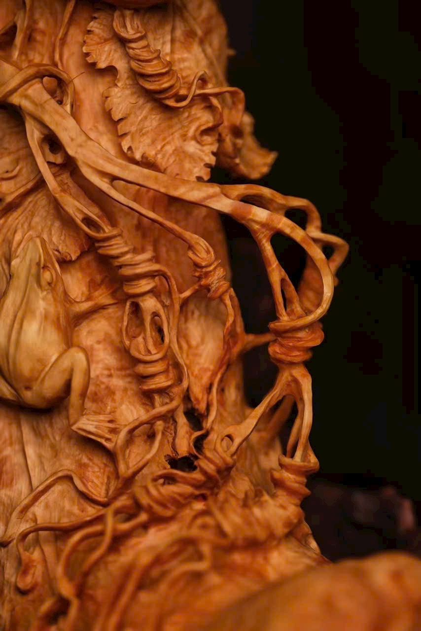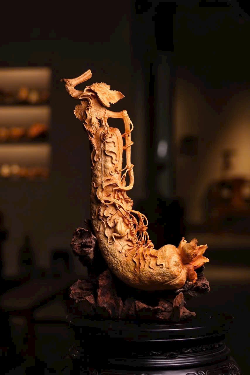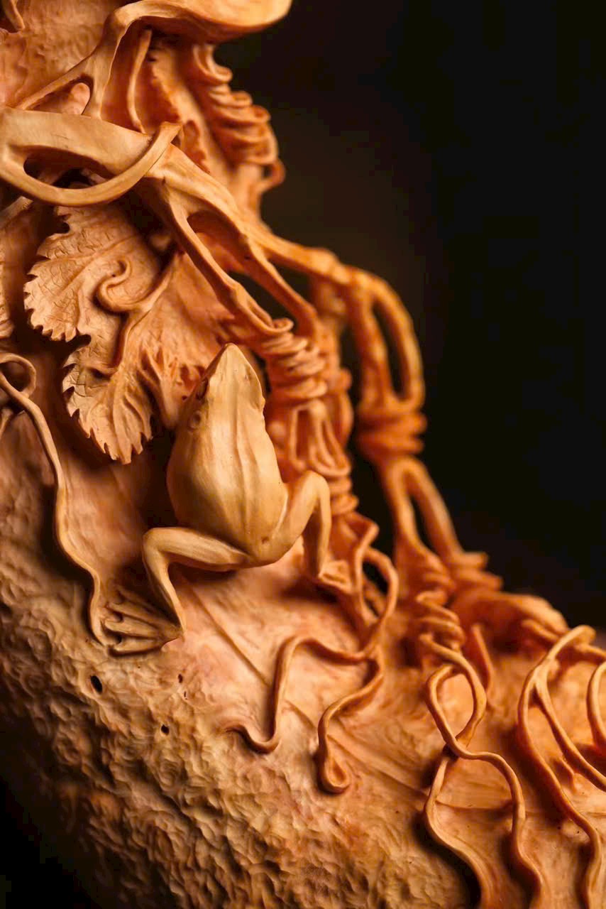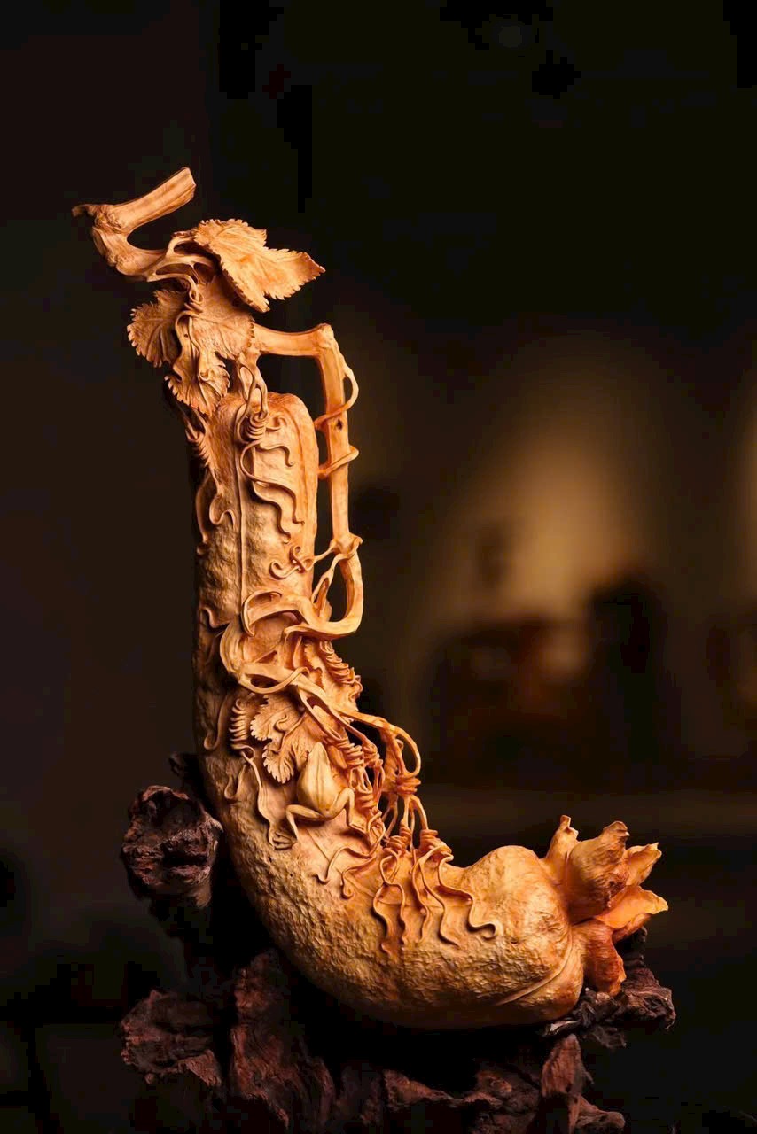 Tác phẩm chạm khắc xuyên suốt từ một khối gỗ, tinh xảo mà không gò bó, khắc họa rõ nét những quả mướp căng tròn sum suê, cùng chú ếch leo trèo sinh động, toát lên vẻ thanh nhã tự nhiên.