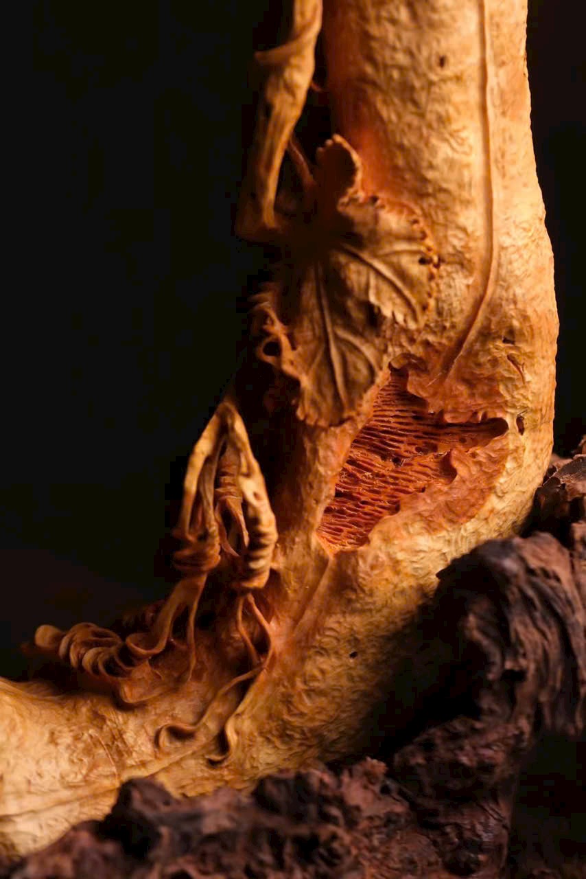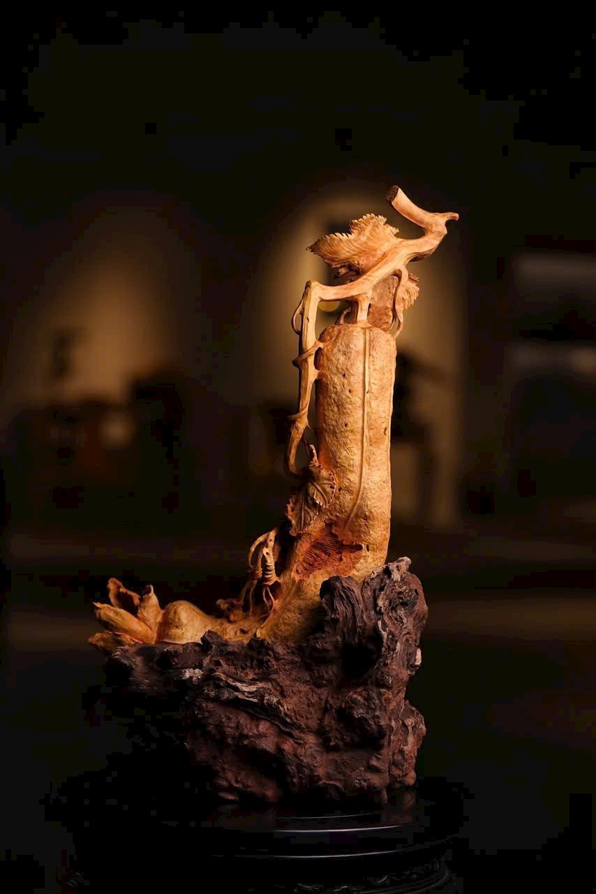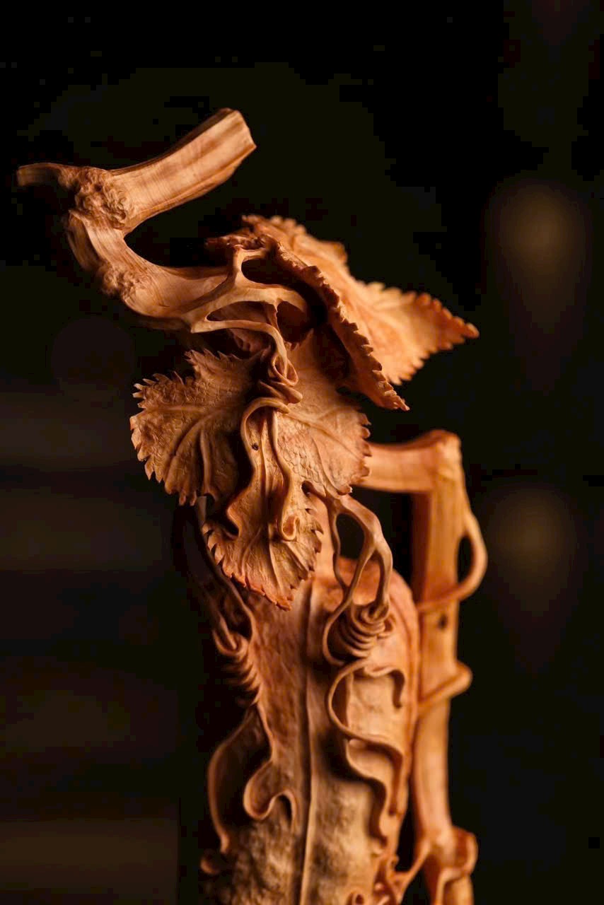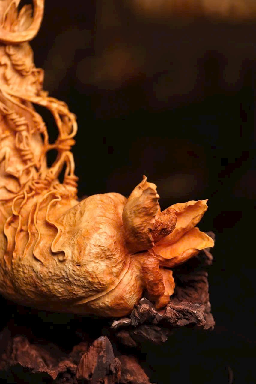 Tác phẩm chạm khắc xuyên suốt từ một khối gỗ, tinh xảo mà không gò bó, khắc họa rõ nét những quả mướp căng tròn sum suê, cùng chú ếch leo trèo sinh động, toát lên vẻ thanh nhã tự nhiên.