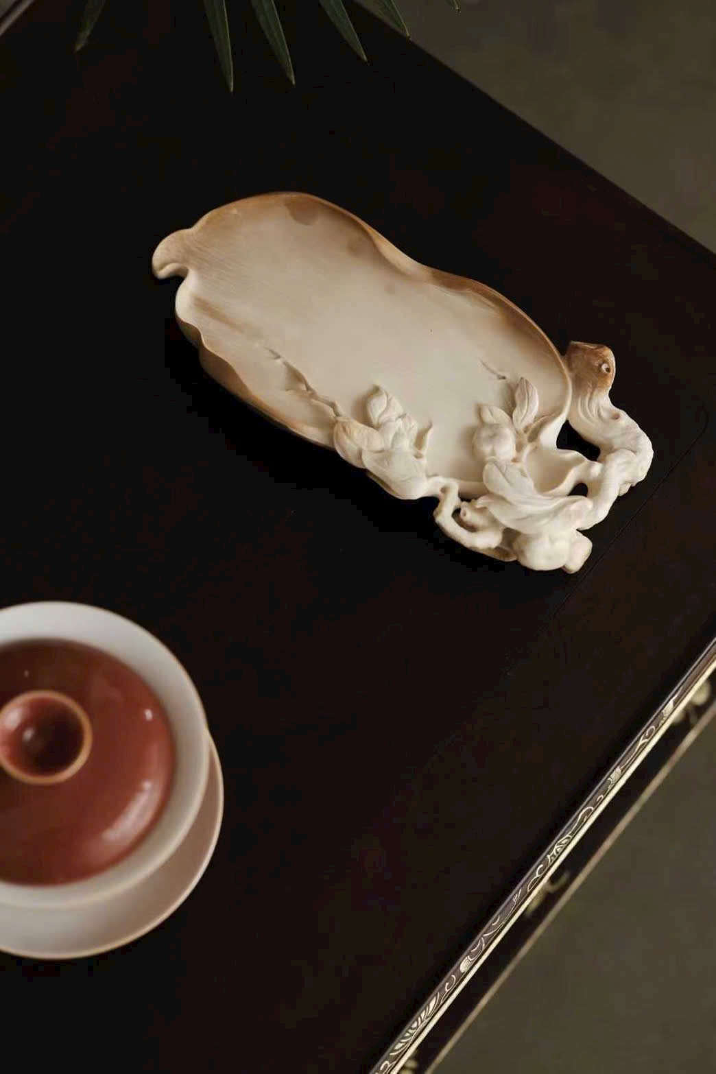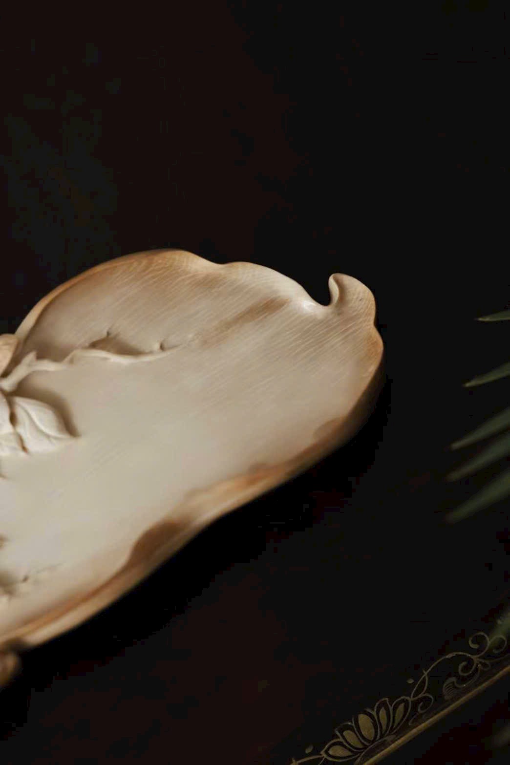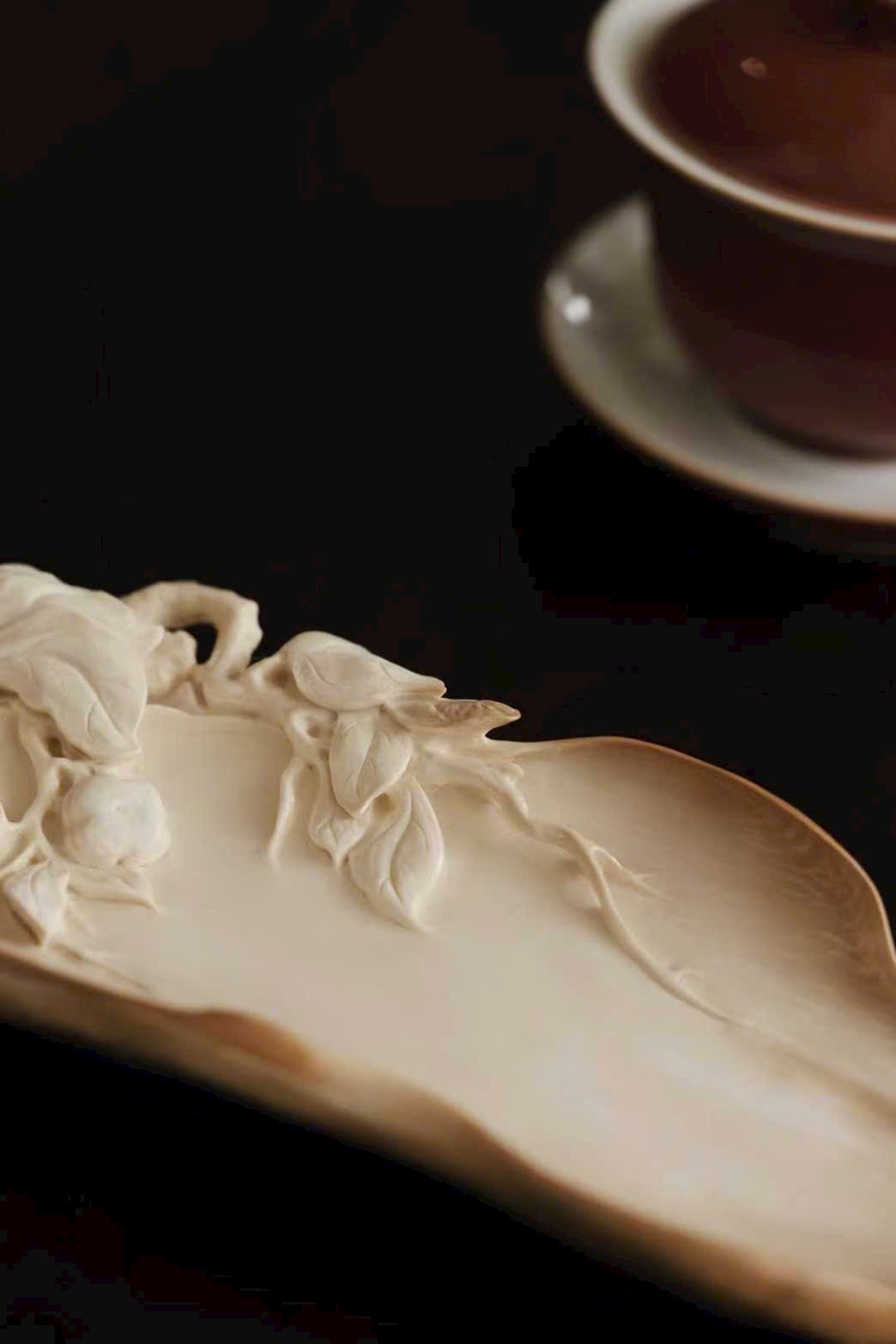 Chất liệu n.gà ma mút mang sắc cà phê độc đáo, được chạm khắc tinh khéo: trái hồng căng tròn, cành nhánh khỏe khoắn, gợi trọn phong vị u nhã của rừng sâu tĩnh lặng. Đặt trên trà tịch thưởng dùng, mang ý cát lành vô tận.