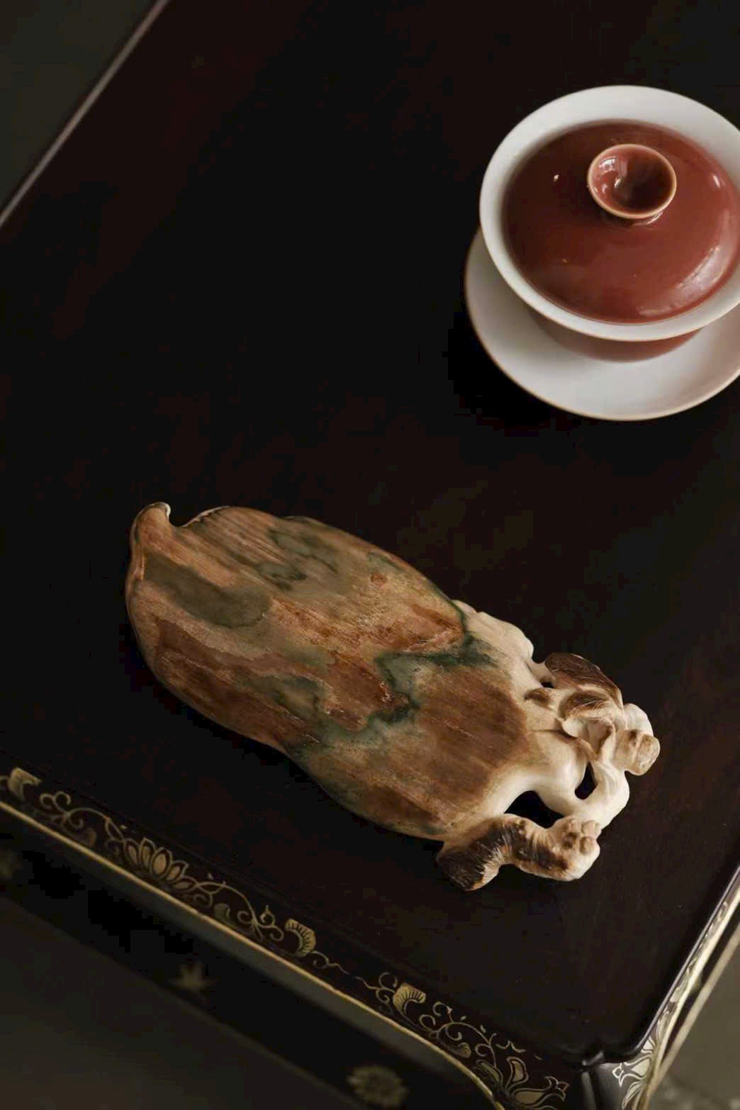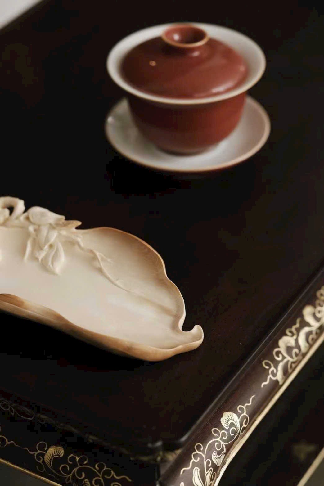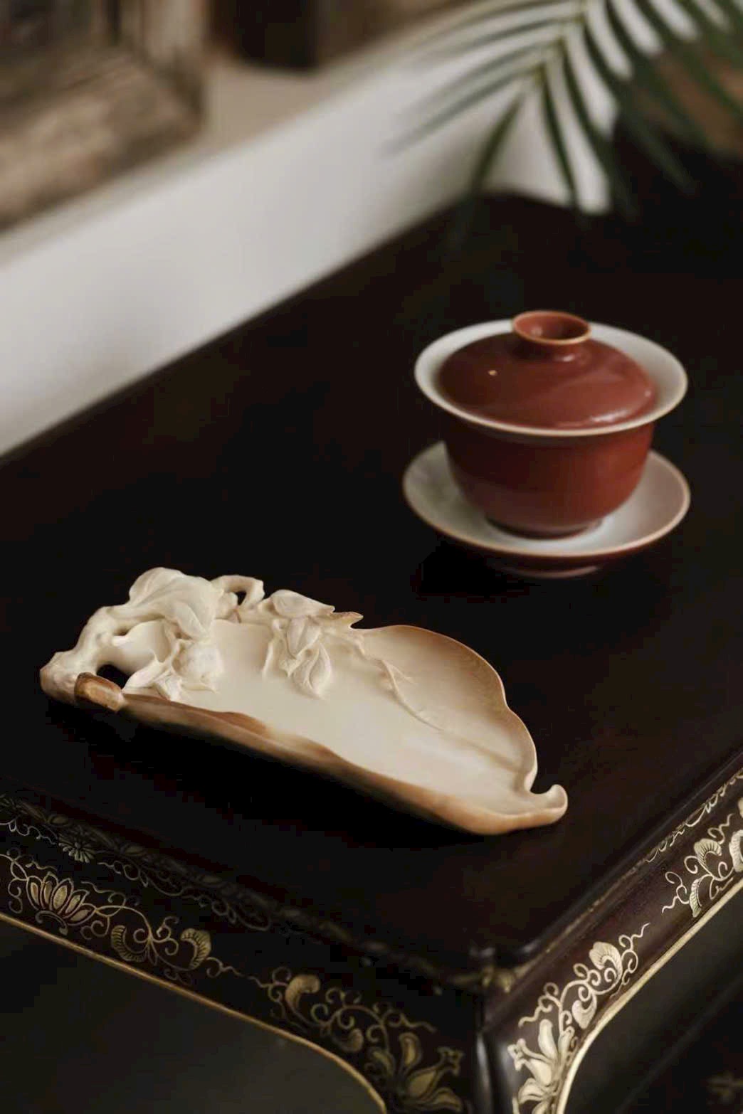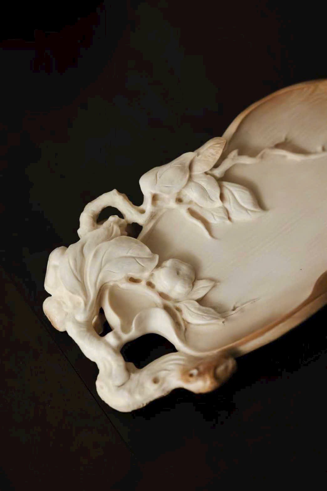 Chất liệu n.gà ma mút mang sắc cà phê độc đáo, được chạm khắc tinh khéo: trái hồng căng tròn, cành nhánh khỏe khoắn, gợi trọn phong vị u nhã của rừng sâu tĩnh lặng. Đặt trên trà tịch thưởng dùng, mang ý cát lành vô tận.