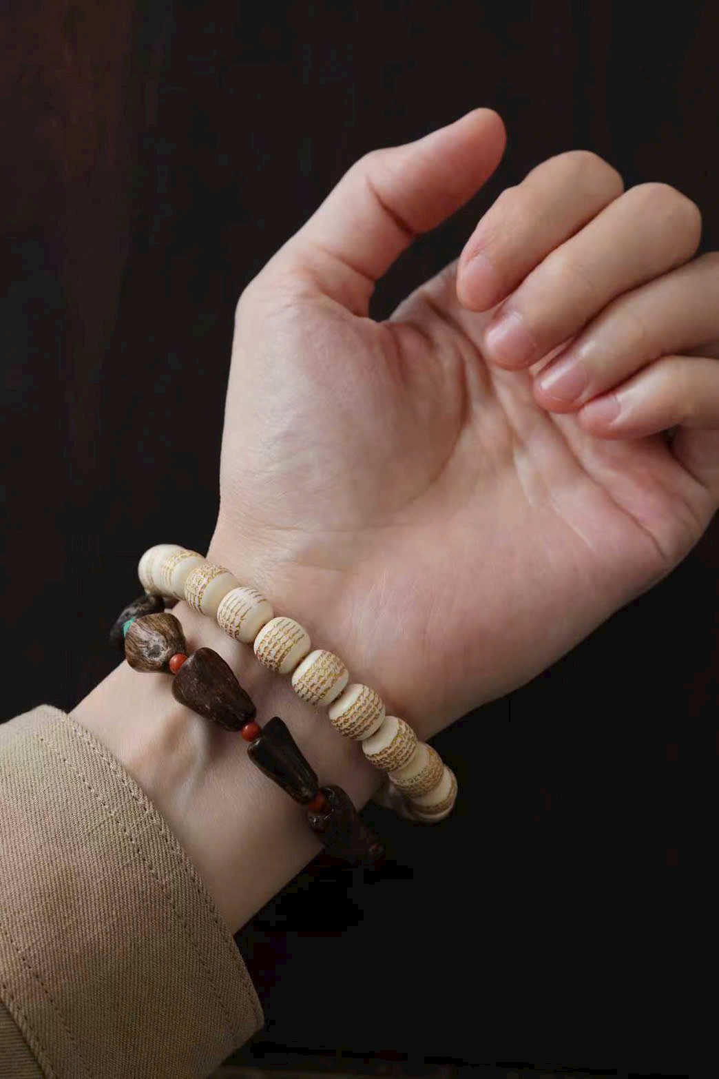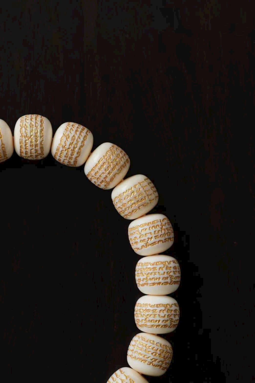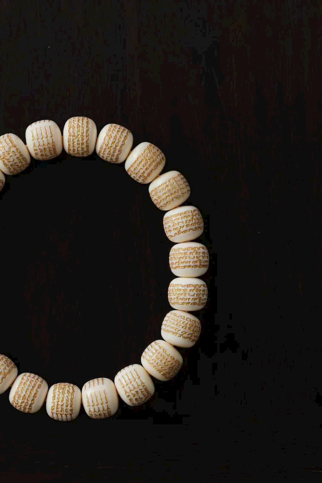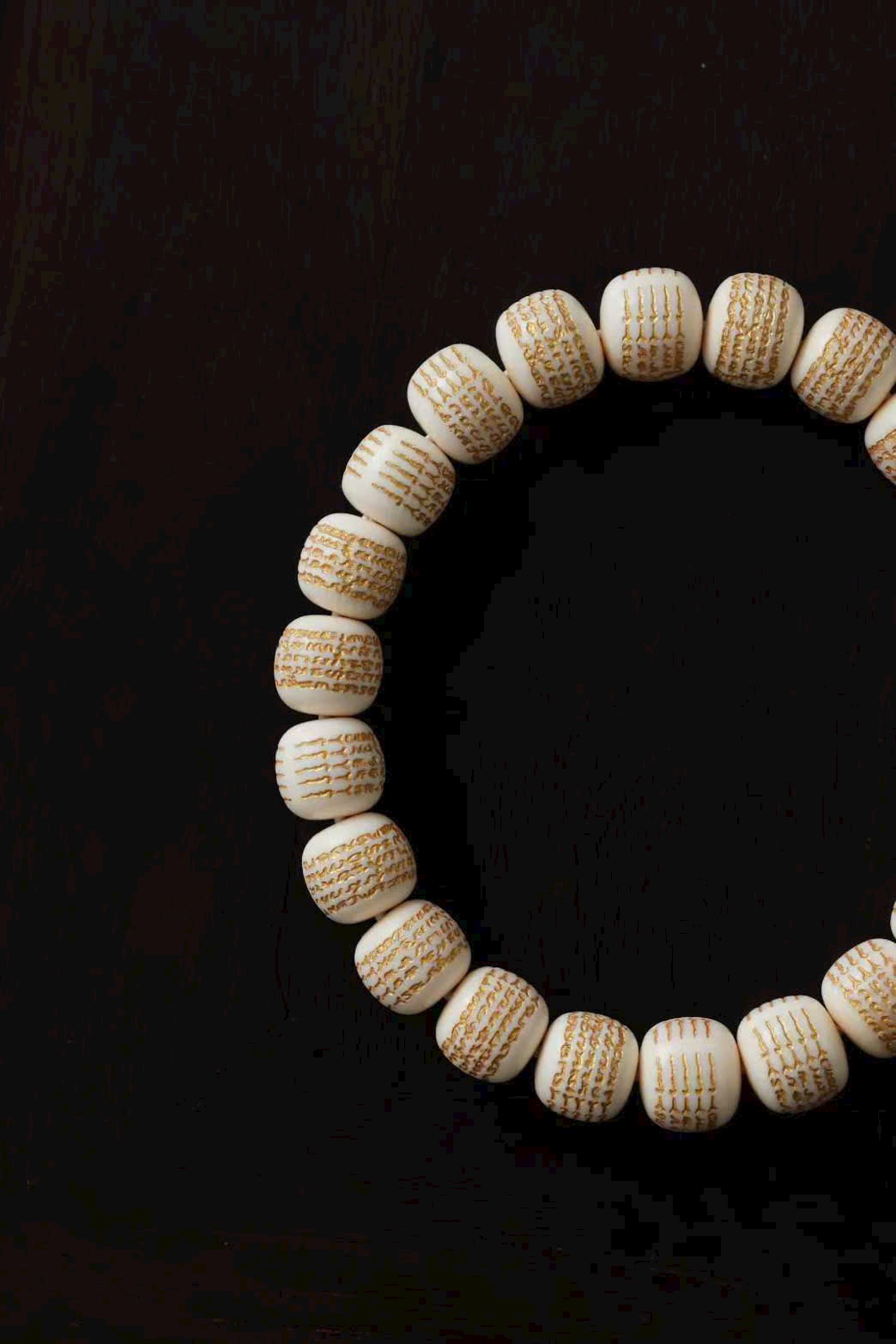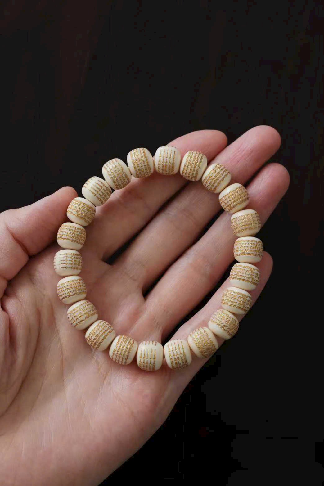 Chất ng.à mịn màng tinh tế, mỗi hạt đều được chạm khắc năm bài kinh văn rồi phủ sơn vàng nổi bật. Đeo lên tay thoải mái, mang ý nghĩa cát tường và bình an.
