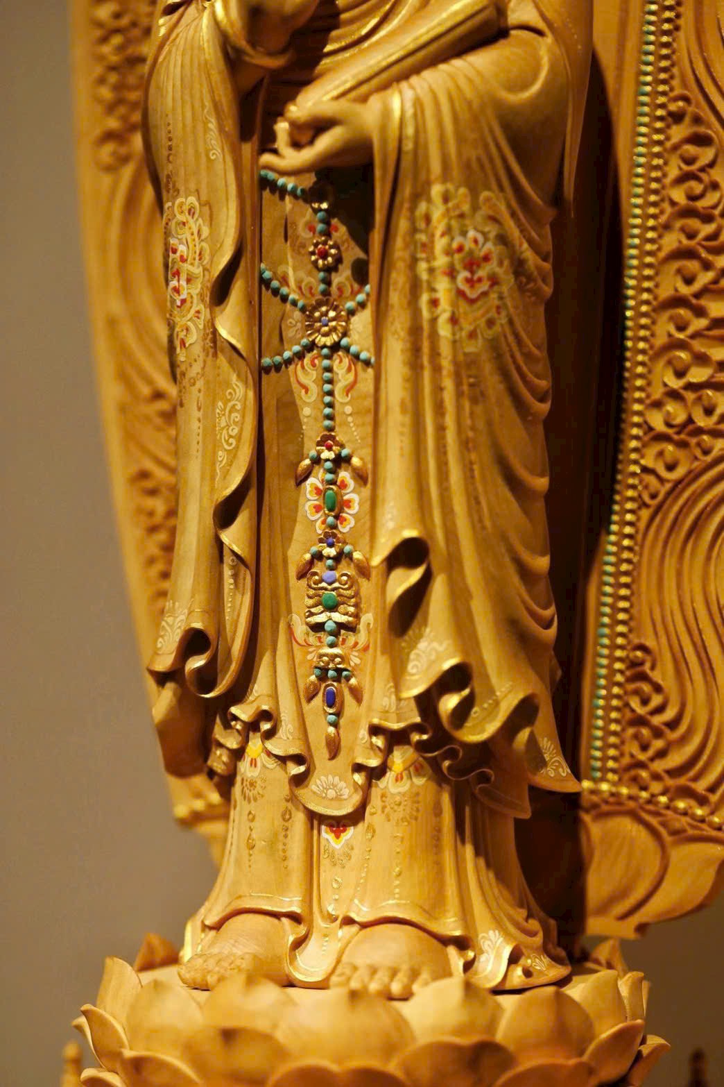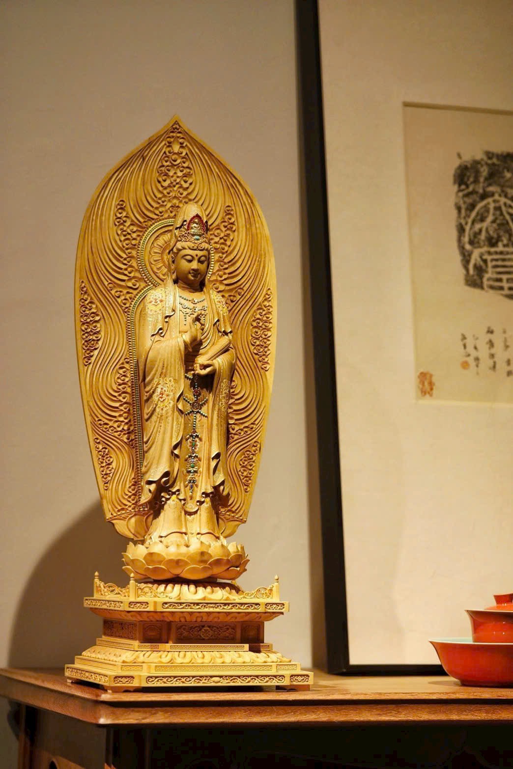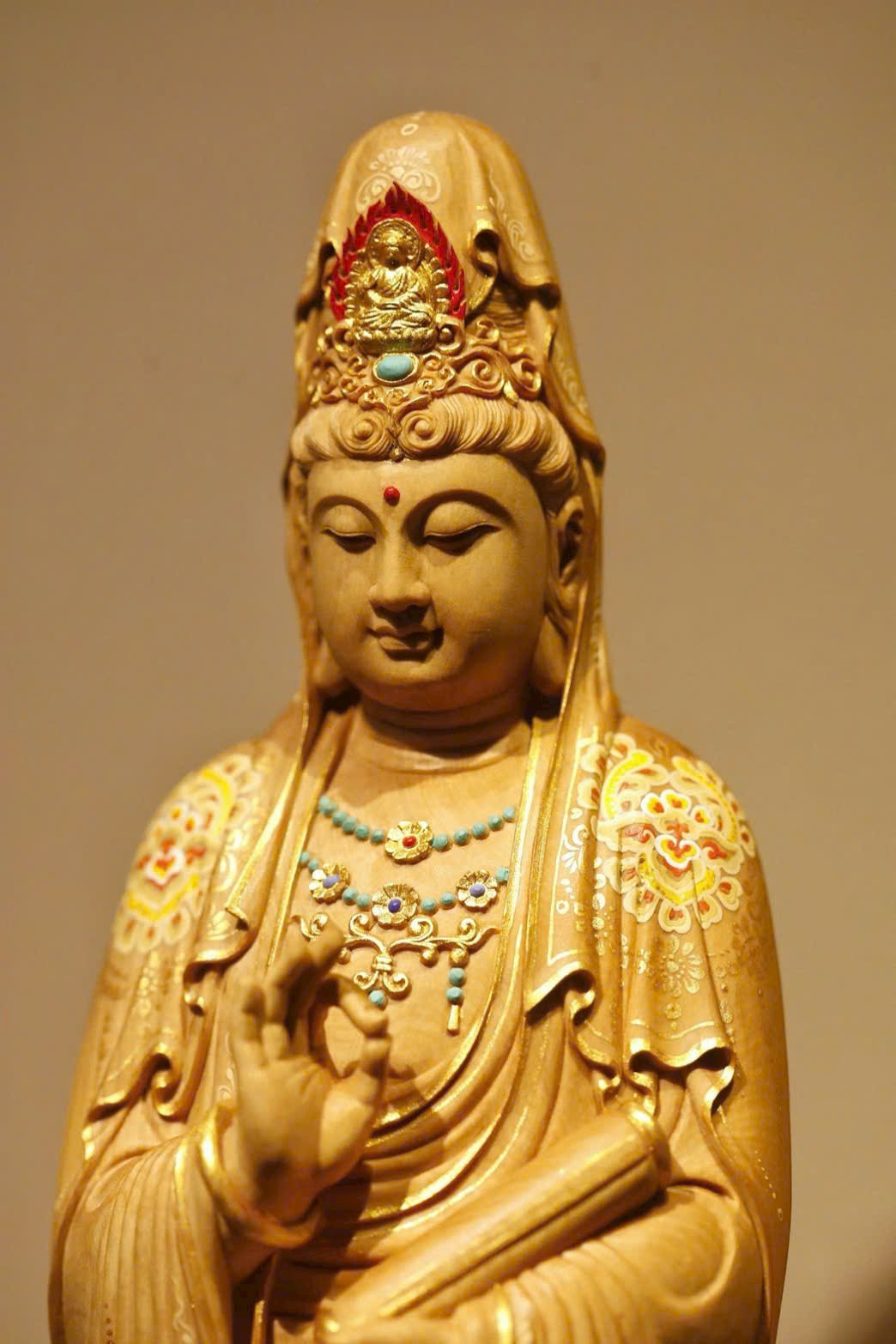 Nhất mộc thành tướng, chạm trổ nhập vi, khí chất tĩnh mịch trang nghiêm, thể hiện trọn vẹn dung nhan từ bi của Nam Hải Quán Âm.