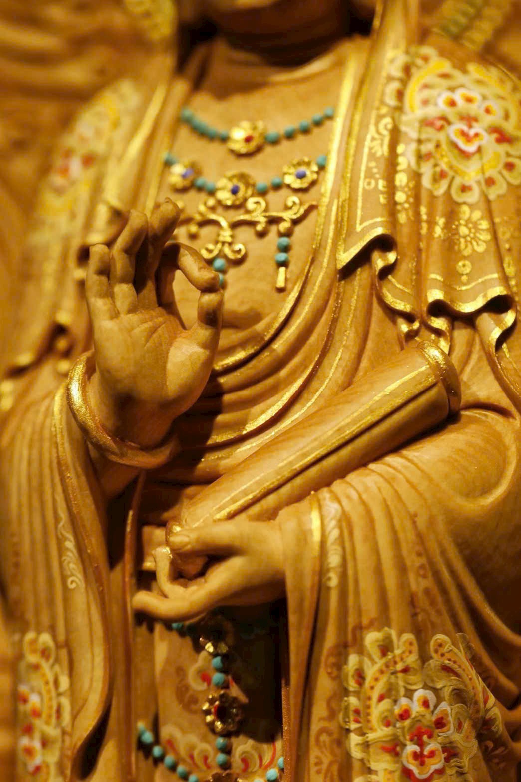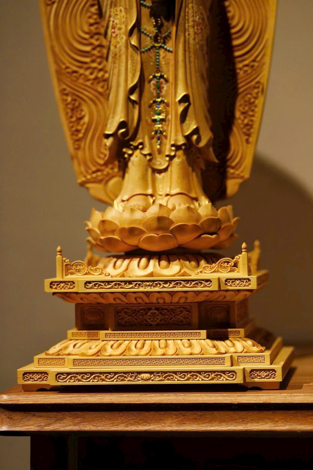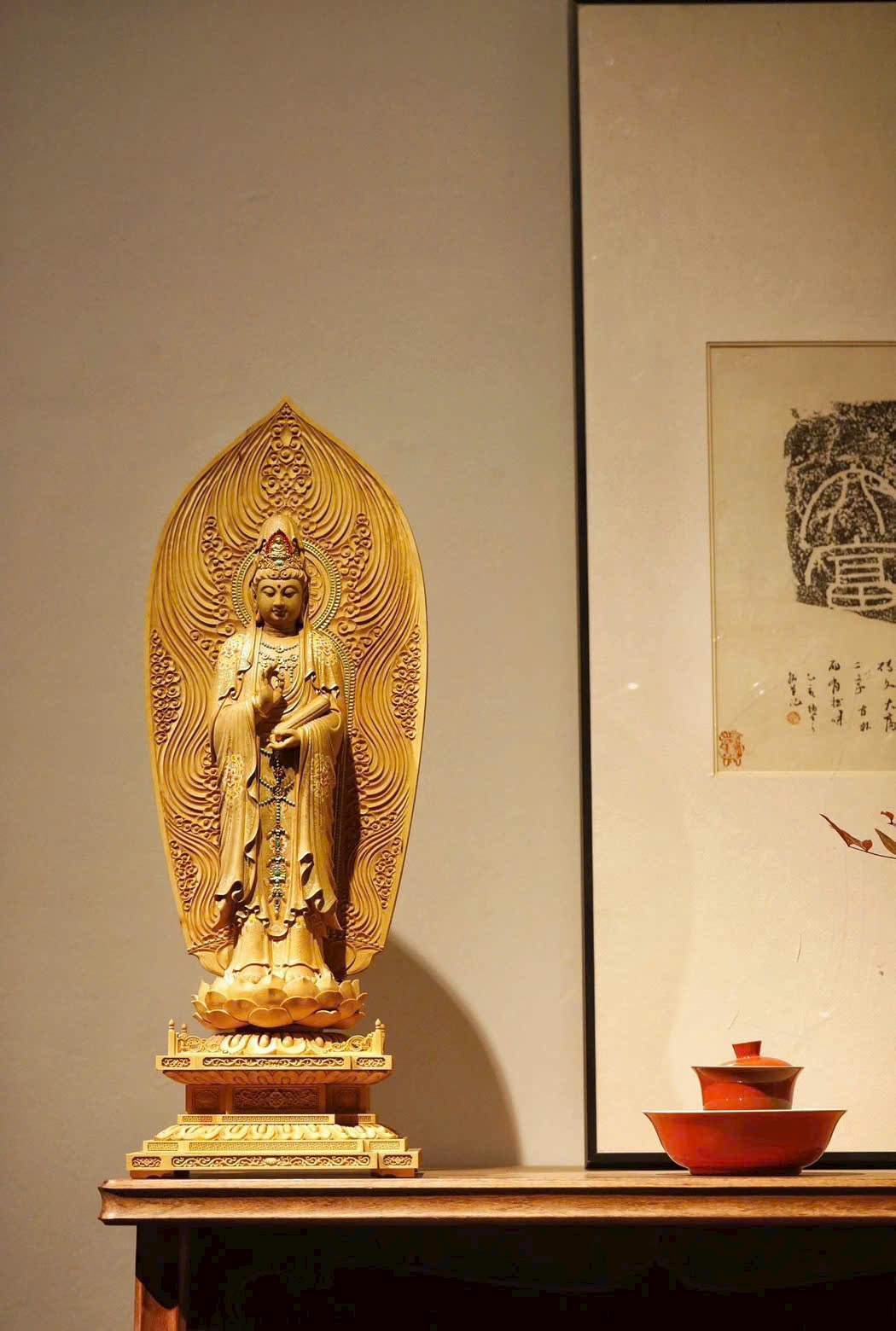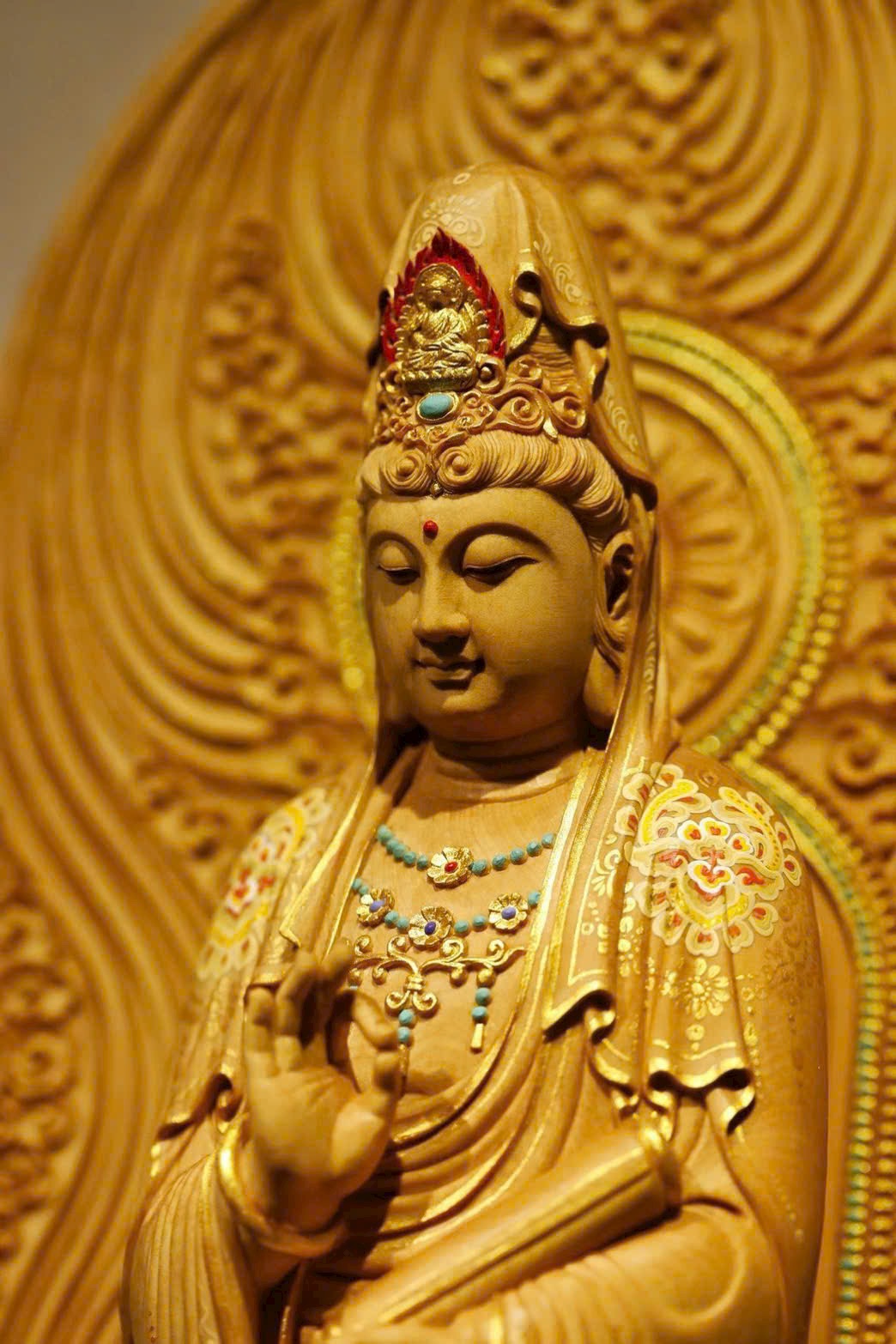 Nhất mộc thành tướng, chạm trổ nhập vi, khí chất tĩnh mịch trang nghiêm, thể hiện trọn vẹn dung nhan từ bi của Nam Hải Quán Âm.