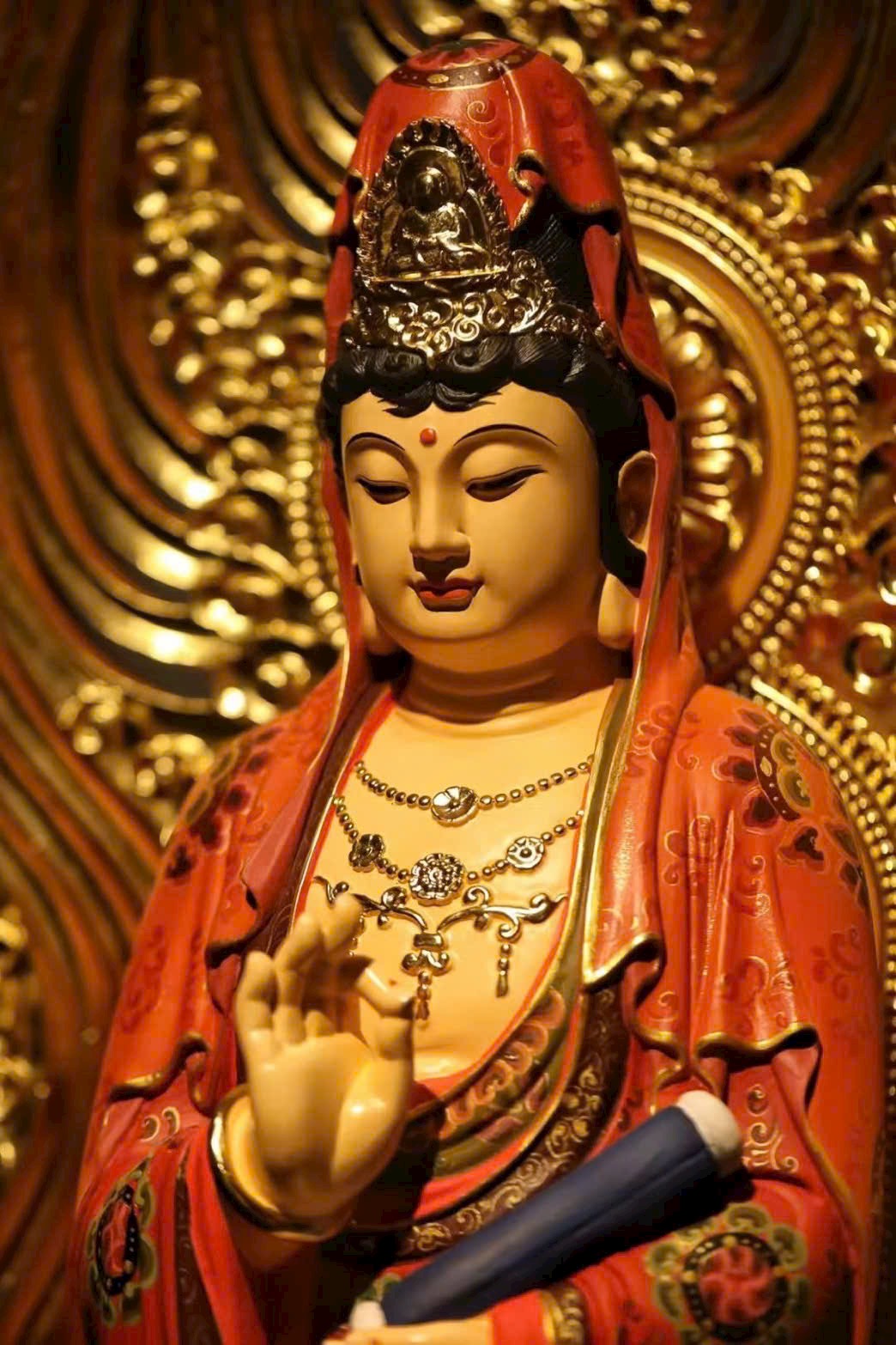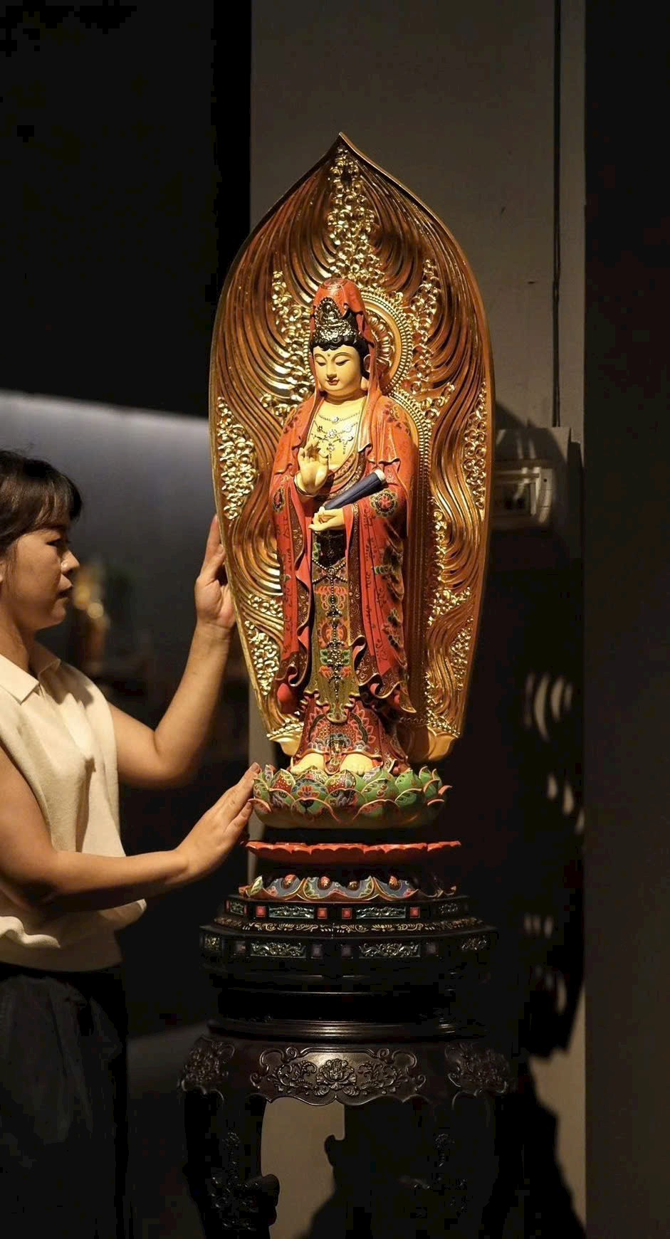 Tượng Quán Âm đứng, thần thái từ bi an hòa, dáng vẻ uy nghi thanh thoát. Tạo hình tỉ lệ chuẩn, chi tiết chạm khắc sống động – từ búi tóc cao quý, mão hoa nghiêm, đến chuỗi anh lạc, áo xiêm mềm mại như mây nước. Tay cầm kinh thư, đứng trên đài sen, phúc lành gia trì.