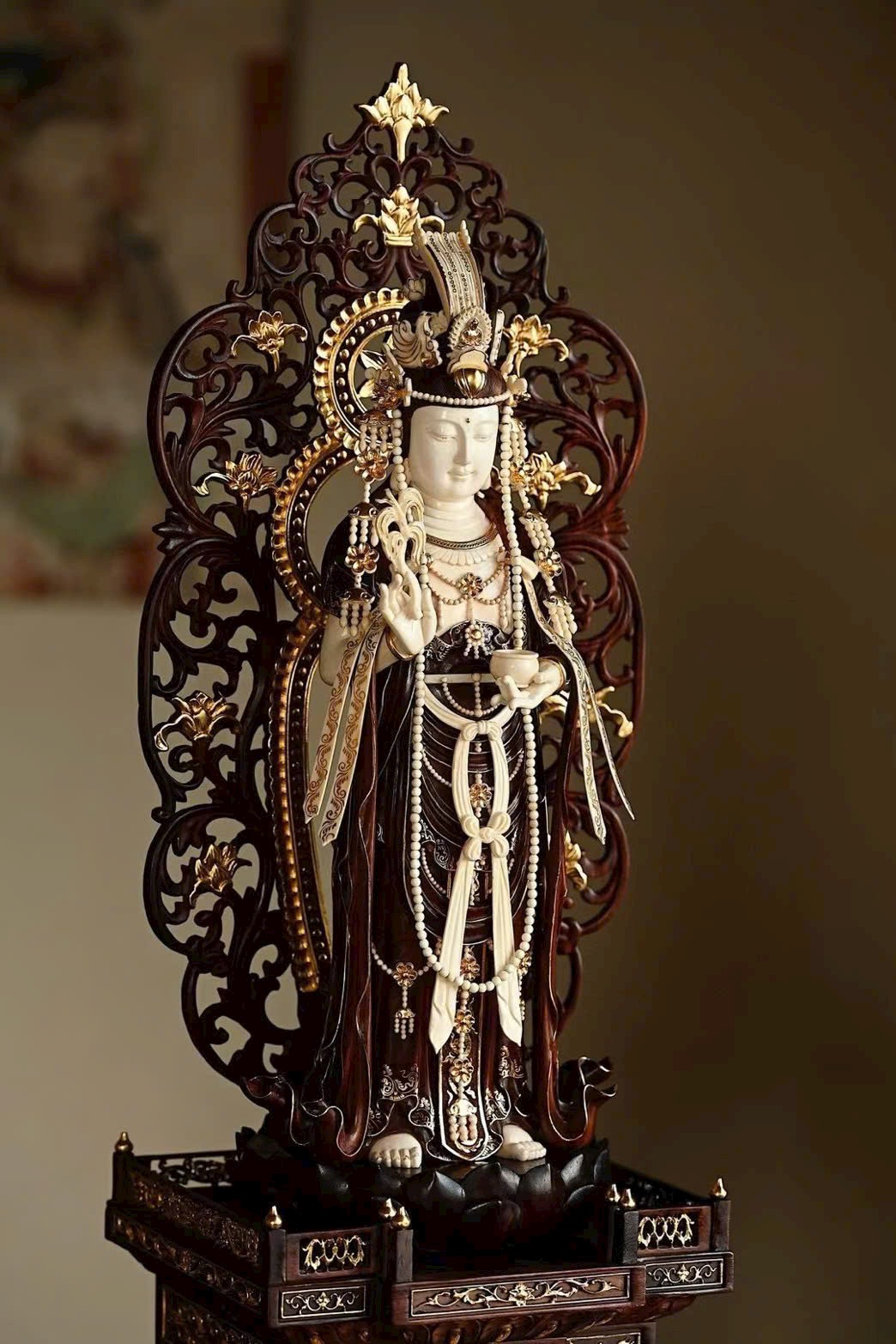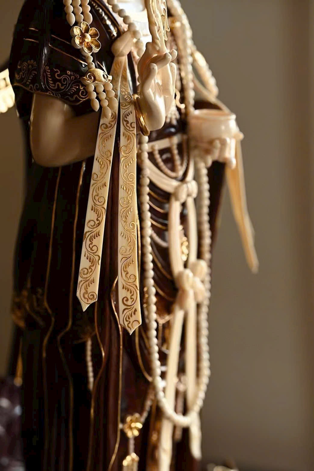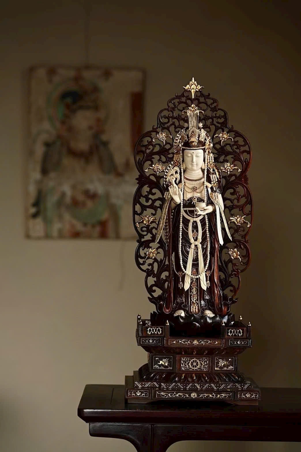 Chọn chất liệu tinh tế, khắc họa chi tiết tuyệt mỹ; anh lạc lộng lẫy, uyển chuyển, tự nhiên. Tay cầm nhành liễu và tịnh bình, thần thái an tĩnh, hiền hòa; dáng vẻ nhẹ nhàng, ung dung, mang ý nghĩa cát tường thù thắng.