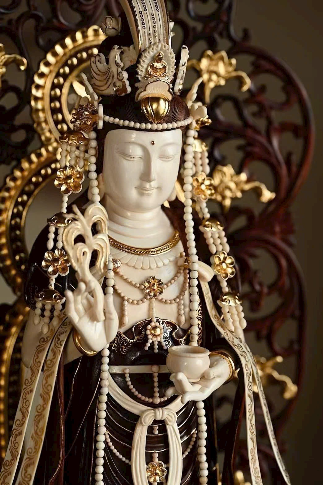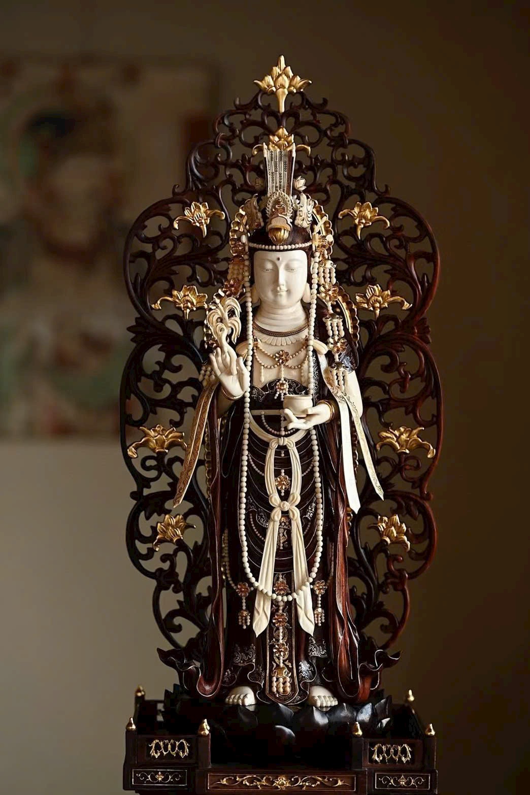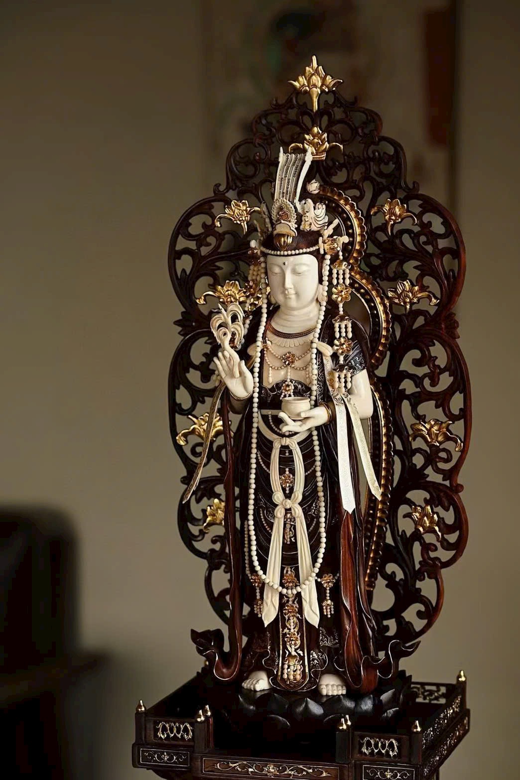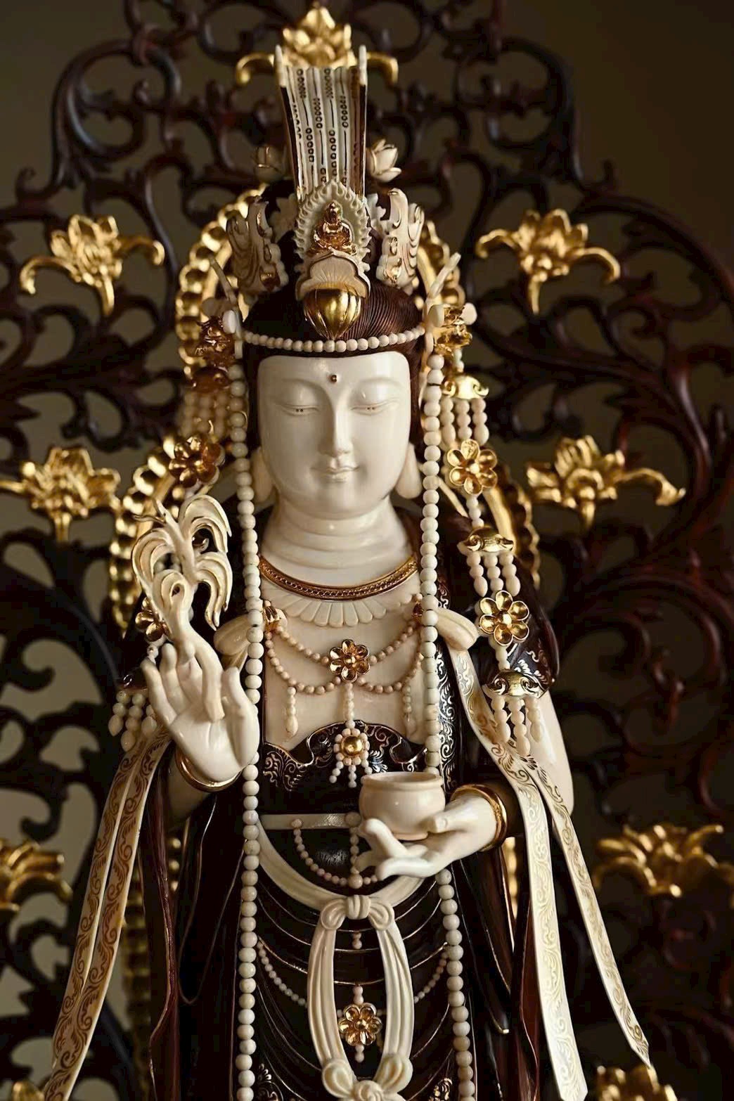 Chọn chất liệu tinh tế, khắc họa chi tiết tuyệt mỹ; anh lạc lộng lẫy, uyển chuyển, tự nhiên. Tay cầm nhành liễu và tịnh bình, thần thái an tĩnh, hiền hòa; dáng vẻ nhẹ nhàng, ung dung, mang ý nghĩa cát tường thù thắng.
