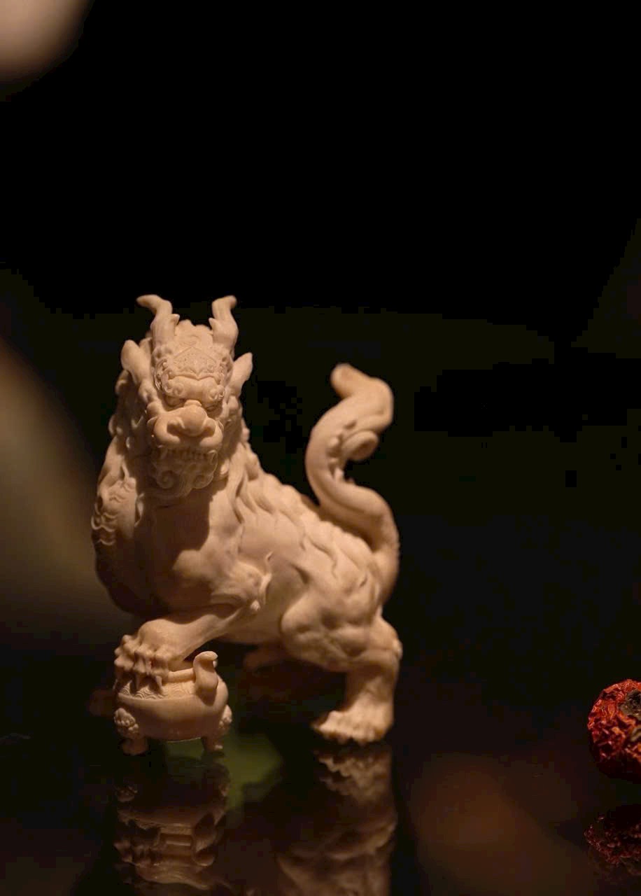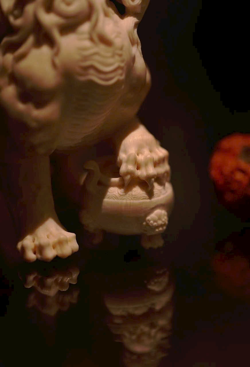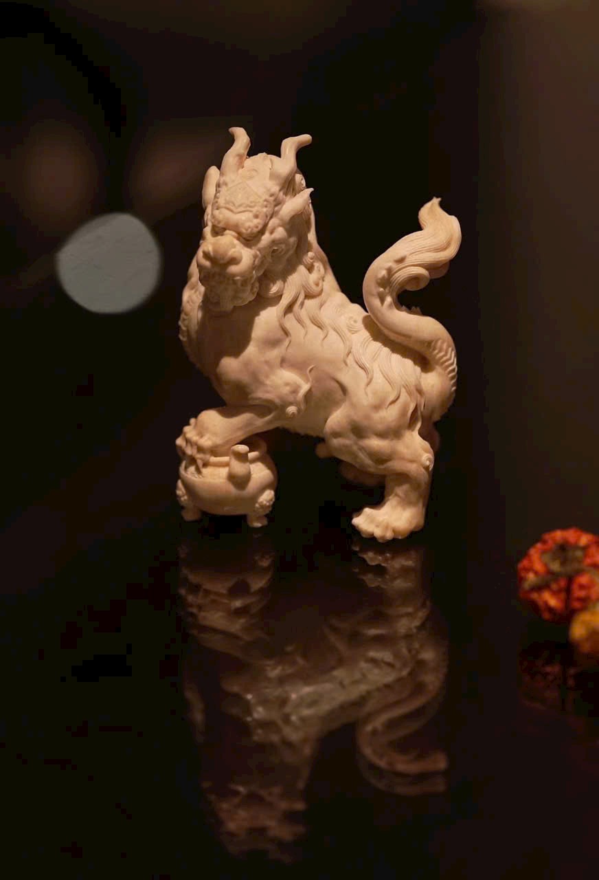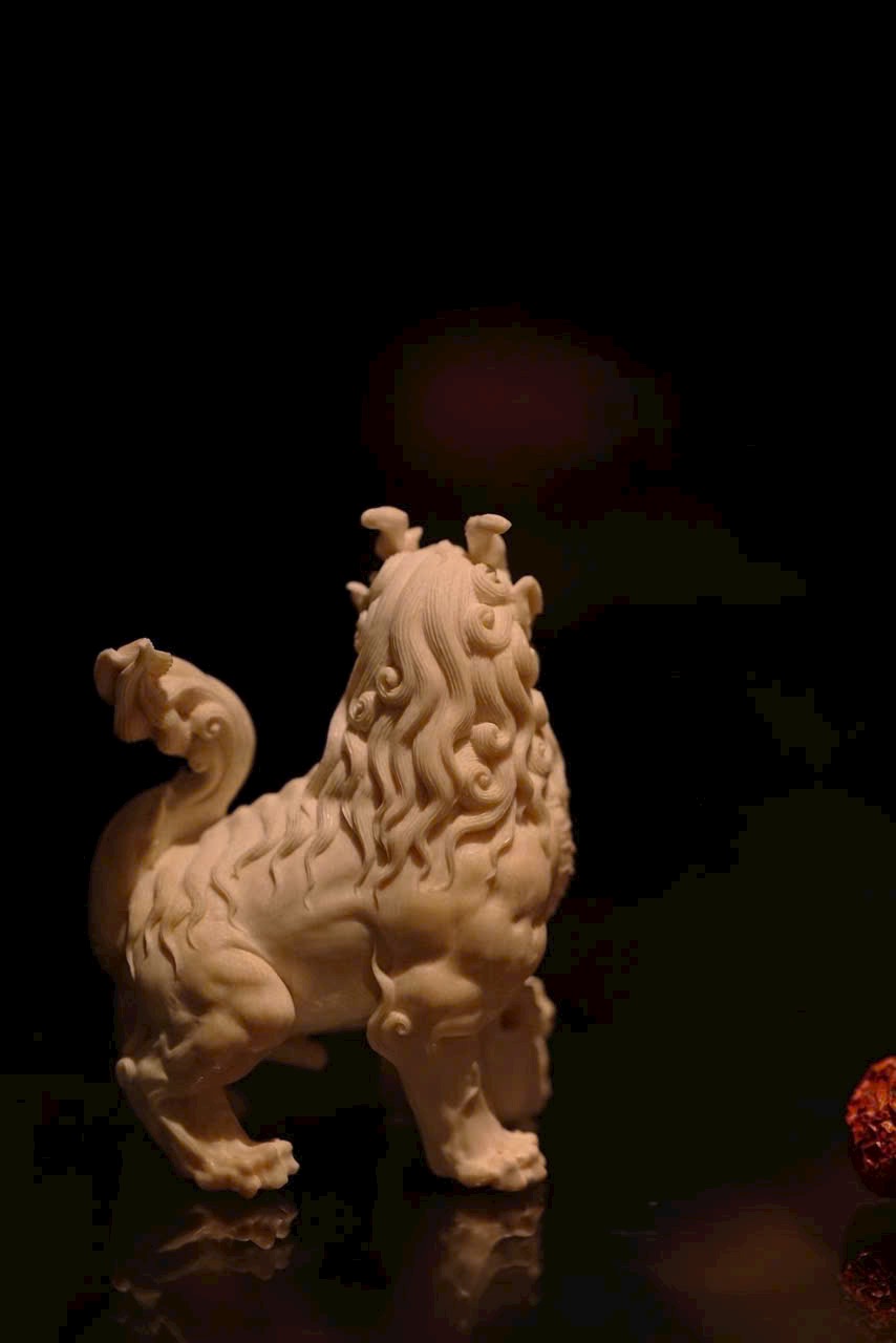 Tác phẩm chạm khắc hình tượng Nghê — một trong “Cửu tử của Rồng” trong thần thoại Trung Hoa. Hình dáng uy mãnh như sư tử, thân hình đầy đặn, thế ngồi vững chãi, đầu ngẩng cao, chân đạp lư hương – toát lên thần thái trầm tĩnh và tôn nghiêm. Là linh thú ưa tĩnh, ưa khói hương, thường được xem là biểu tượng của sự an định và khí chất cao quý.