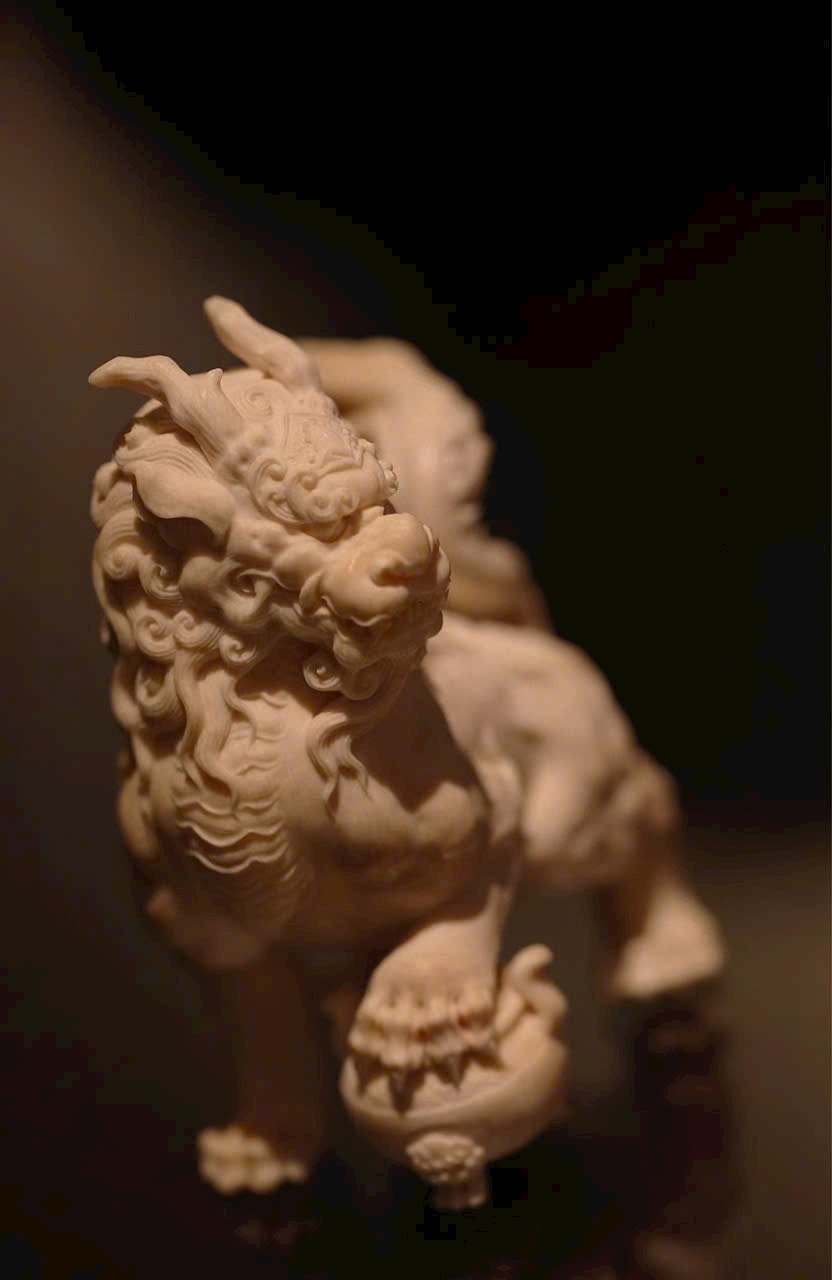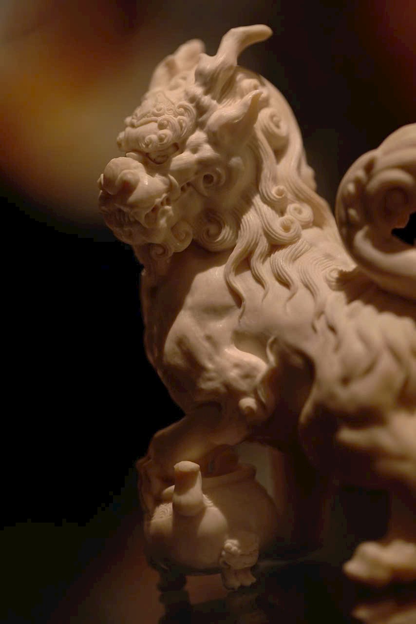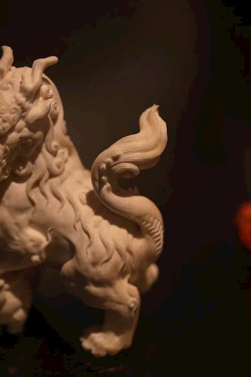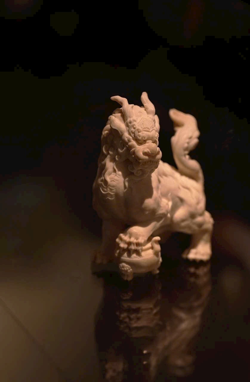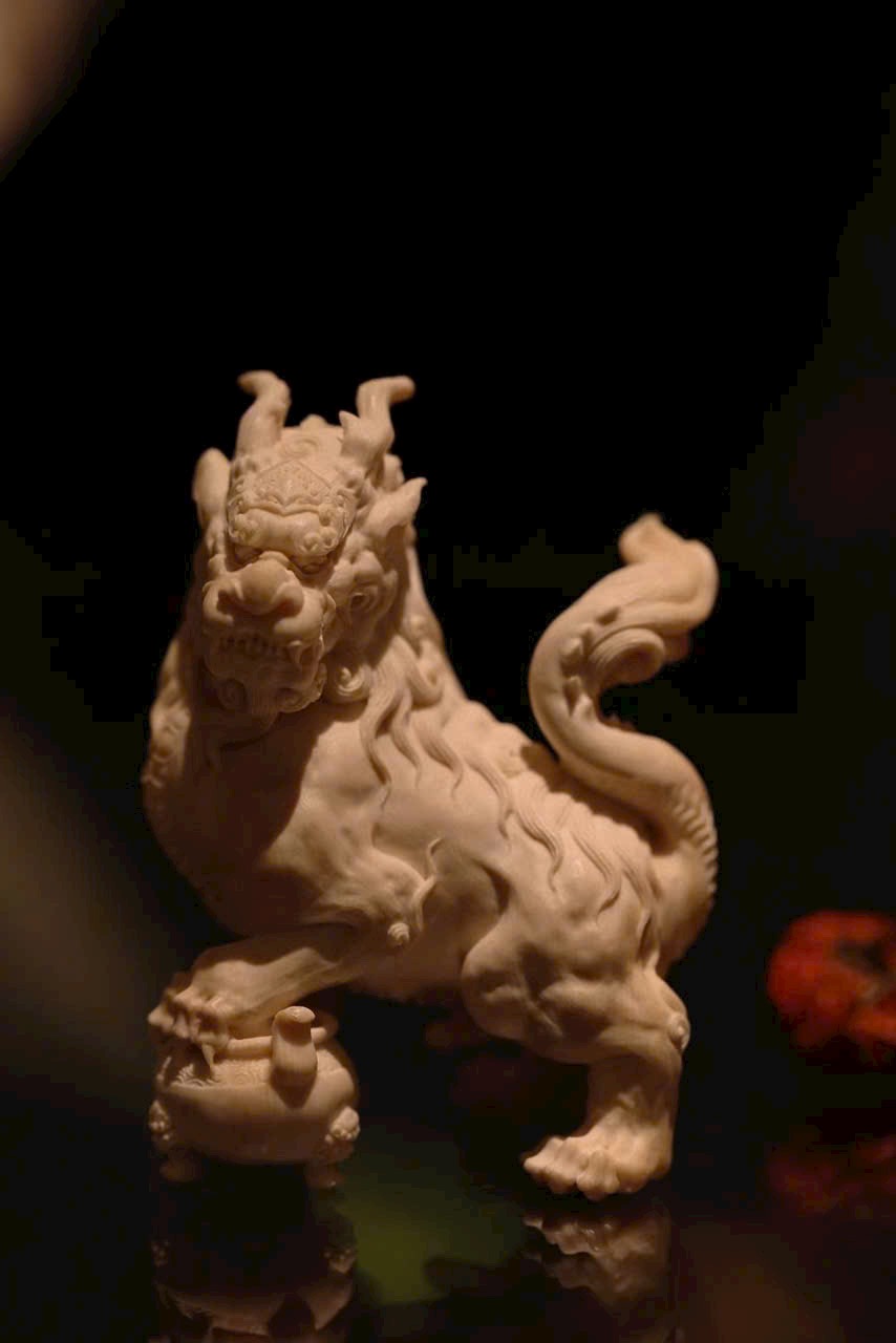 Tác phẩm chạm khắc hình tượng Nghê — một trong “Cửu tử của Rồng” trong thần thoại Trung Hoa. Hình dáng uy mãnh như sư tử, thân hình đầy đặn, thế ngồi vững chãi, đầu ngẩng cao, chân đạp lư hương – toát lên thần thái trầm tĩnh và tôn nghiêm. Là linh thú ưa tĩnh, ưa khói hương, thường được xem là biểu tượng của sự an định và khí chất cao quý.