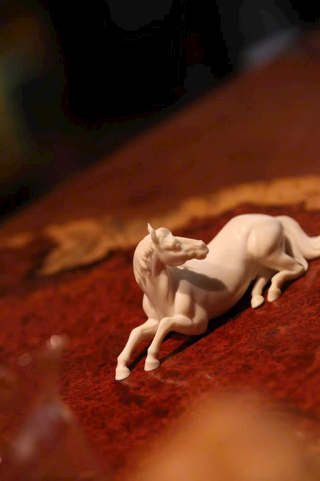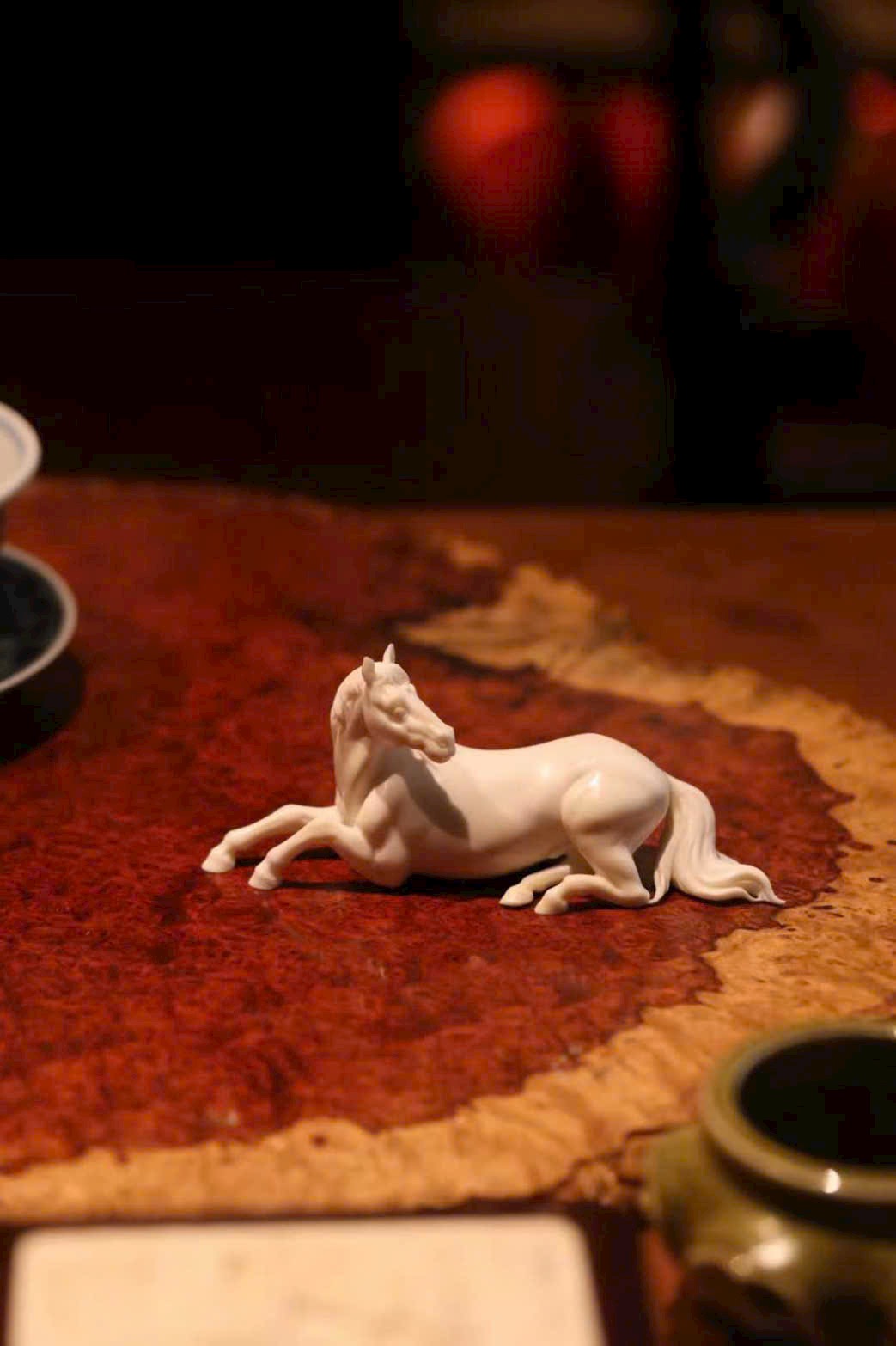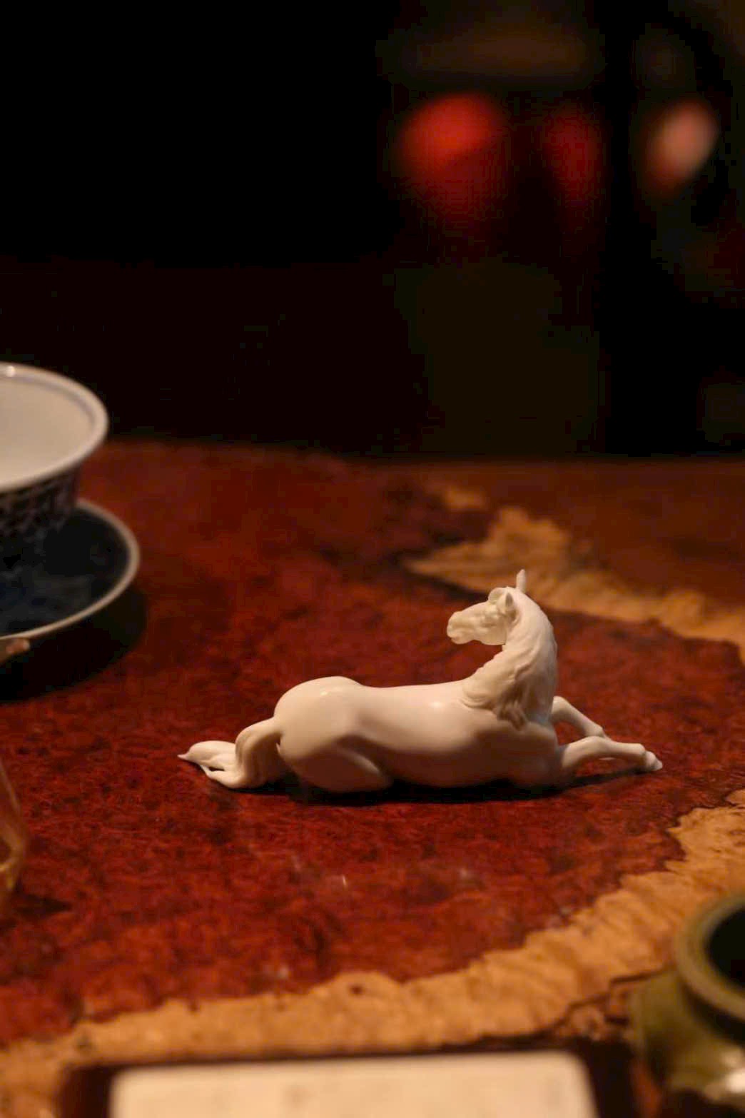 Chú ngựa ở tư thế nằm nghỉ, cổ hơi cong, đầu khẽ ngoảnh, hai tai vểnh cao, ánh mắt ấm áp mà có thần; dáng vẻ an nhiên nhưng ẩn chứa động thế. Đường nét cơ thể trôi chảy tự nhiên, bờm ngựa được tỉa gọn tinh tế, đuôi xõa mềm mại, thể hiện trọn vẹn sự thư giãn khi tĩnh tại hòa cùng nội lực bên trong. Thai chất mịn màng như mỡ, sắc men trắng pha ấm, toàn thể toát lên ánh nhu hòa đặc trưng của sứ trắng Đức Hóa. Tác phẩm dùng thủ pháp giản lược để bắt trọn khoảnh khắc sinh động lúc ngựa nghỉ ngơi, vừa phô bày công lực tả thực vững vàng, vừa mang phong vị tao nhã của văn nhân. Ý nghĩa: “nghỉ ngơi tích lực, chờ ngày lên đường”, xứng đáng là món thanh ngoạn tinh tế nơi án trà.