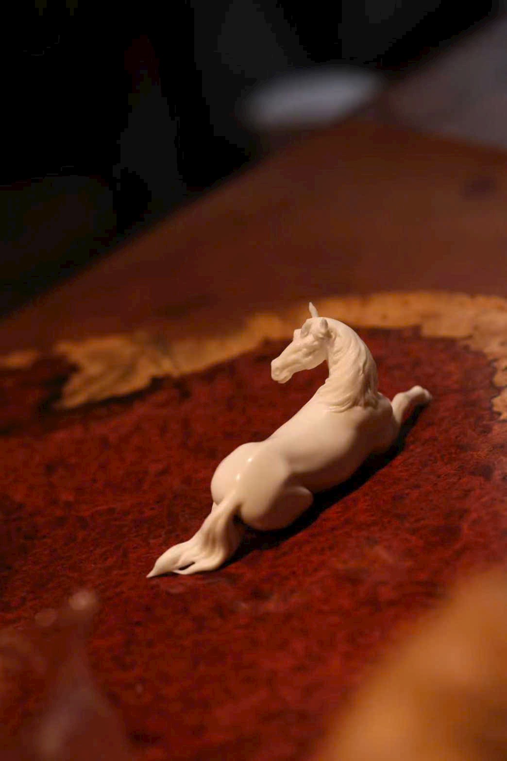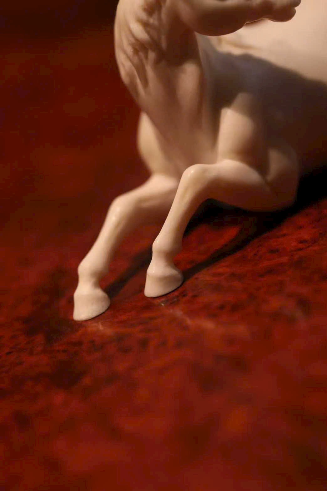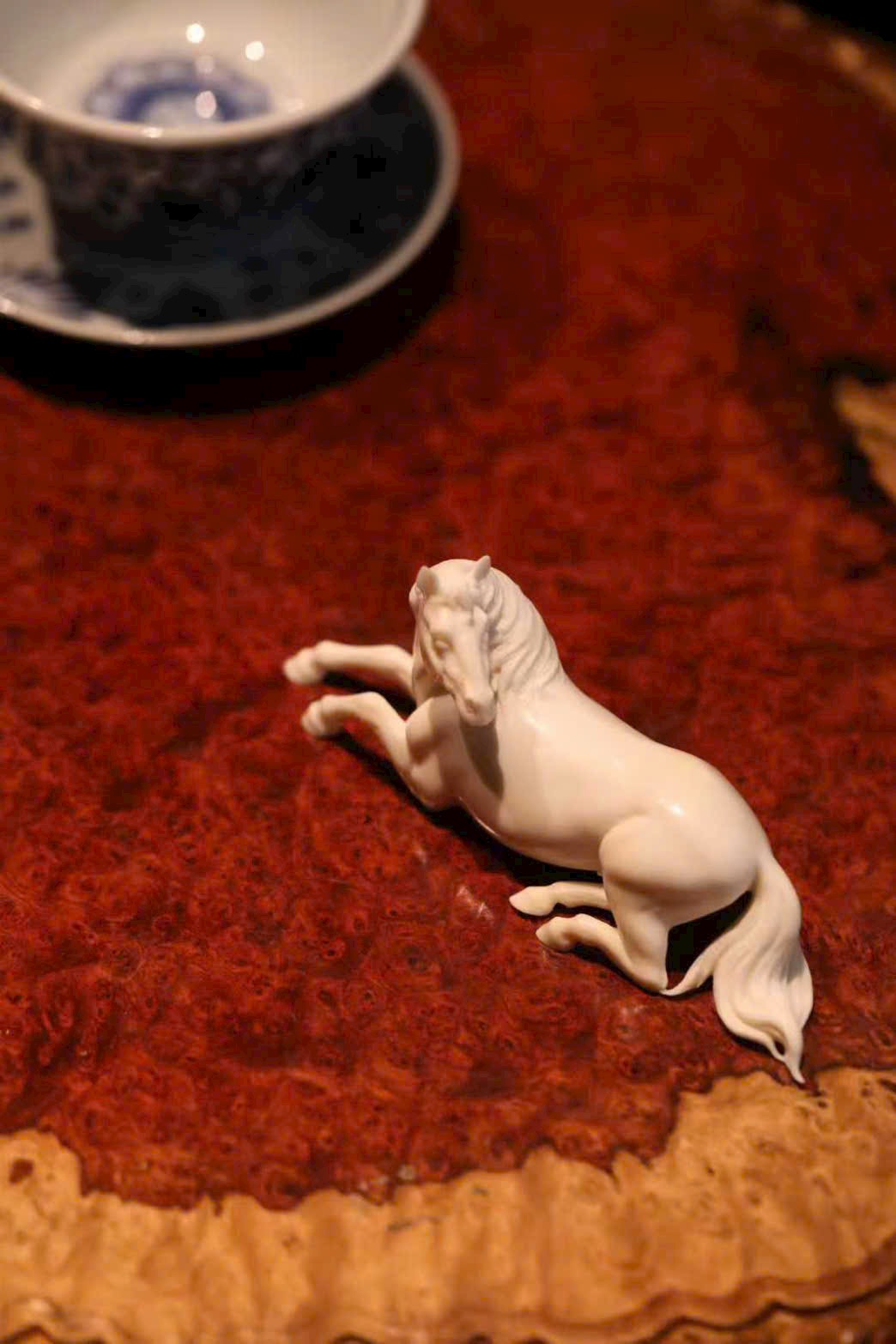 Chú ngựa ở tư thế nằm nghỉ, cổ hơi cong, đầu khẽ ngoảnh, hai tai vểnh cao, ánh mắt ấm áp mà có thần; dáng vẻ an nhiên nhưng ẩn chứa động thế. Đường nét cơ thể trôi chảy tự nhiên, bờm ngựa được tỉa gọn tinh tế, đuôi xõa mềm mại, thể hiện trọn vẹn sự thư giãn khi tĩnh tại hòa cùng nội lực bên trong. Thai chất mịn màng như mỡ, sắc men trắng pha ấm, toàn thể toát lên ánh nhu hòa đặc trưng của sứ trắng Đức Hóa. Tác phẩm dùng thủ pháp giản lược để bắt trọn khoảnh khắc sinh động lúc ngựa nghỉ ngơi, vừa phô bày công lực tả thực vững vàng, vừa mang phong vị tao nhã của văn nhân. Ý nghĩa: “nghỉ ngơi tích lực, chờ ngày lên đường”, xứng đáng là món thanh ngoạn tinh tế nơi án trà.