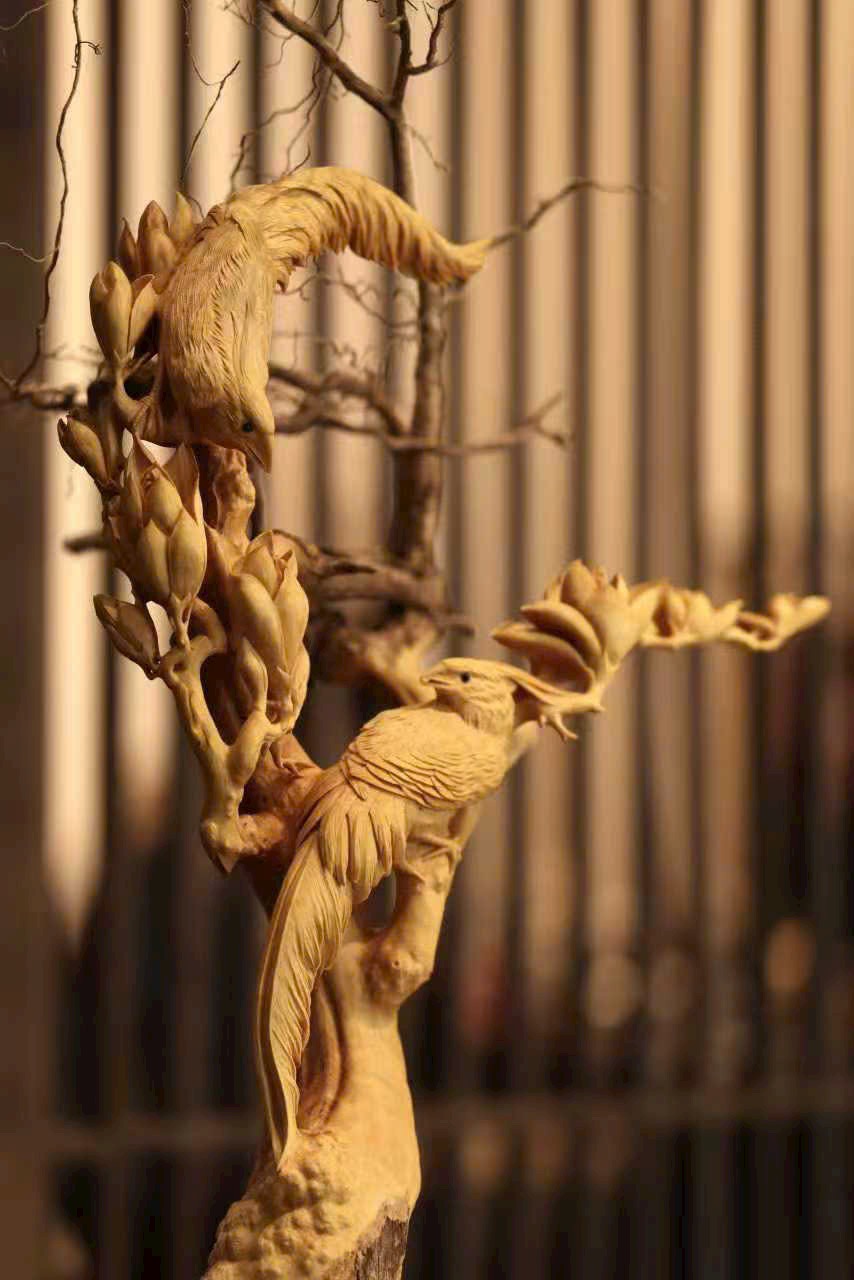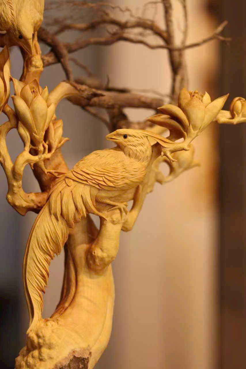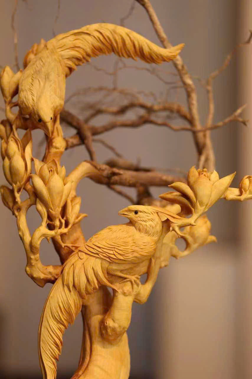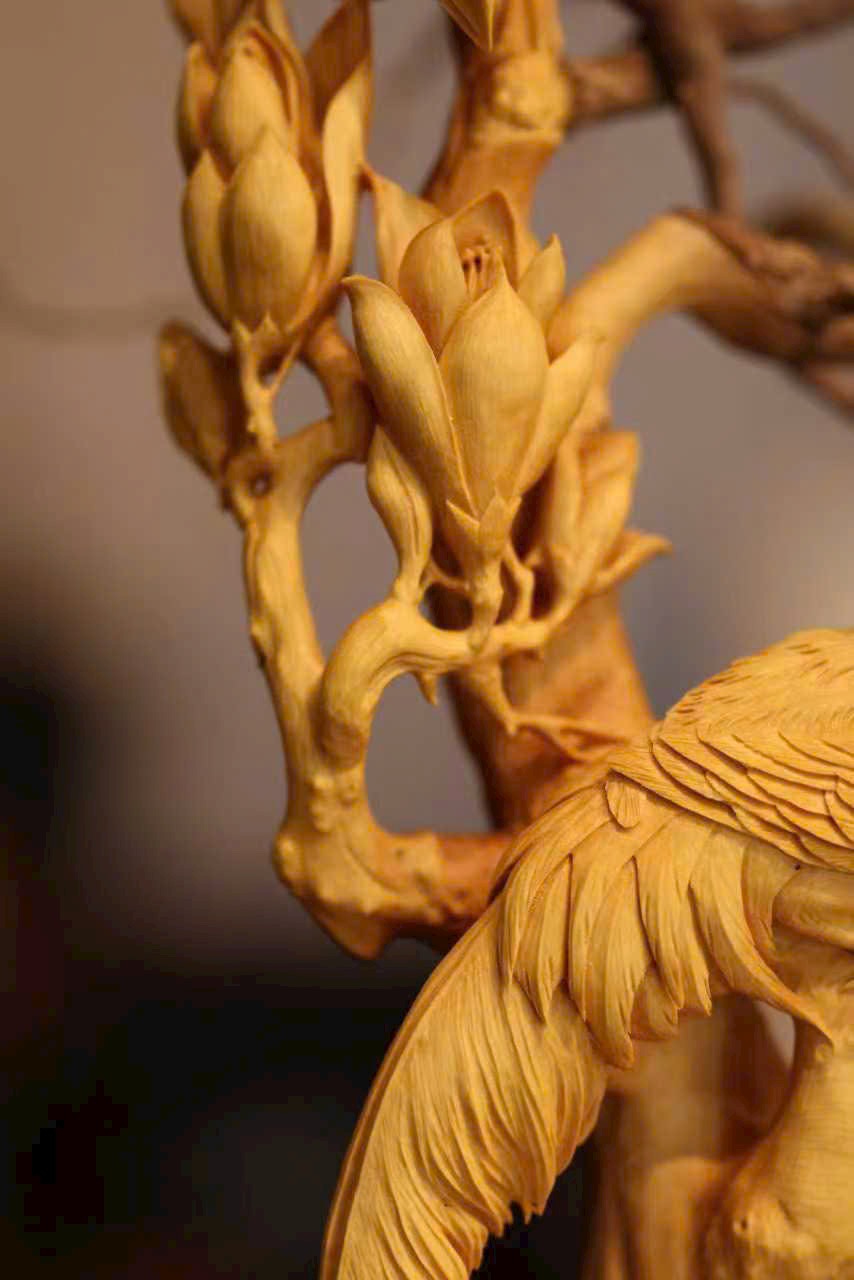 Chạm khắc theo đường vân gỗ, tận dụng thế tự nhiên của vật liệu, họa tiết linh hoạt sinh động. Cành hoa ngọc lan uốn lượn, chim phúc báo tin vui, tràn đầy sức sống và vẻ đẹp thiên nhiên. Mang ý nghĩa Ngọc Đường Phú Quý, đem lại điềm lành và thịnh vượng cho gia cư.