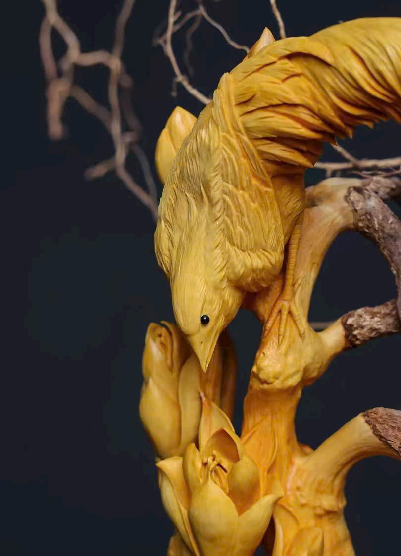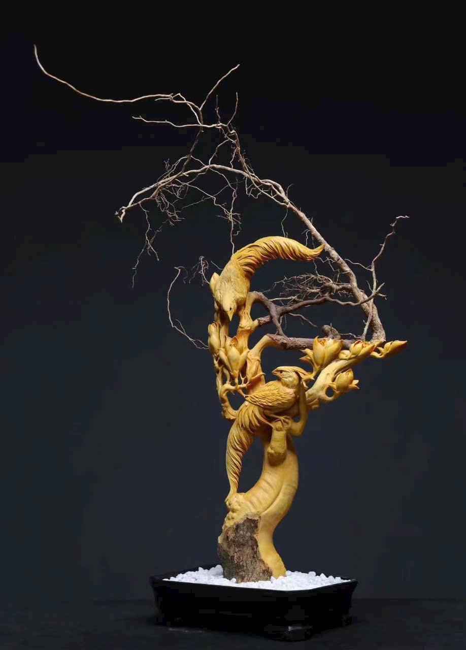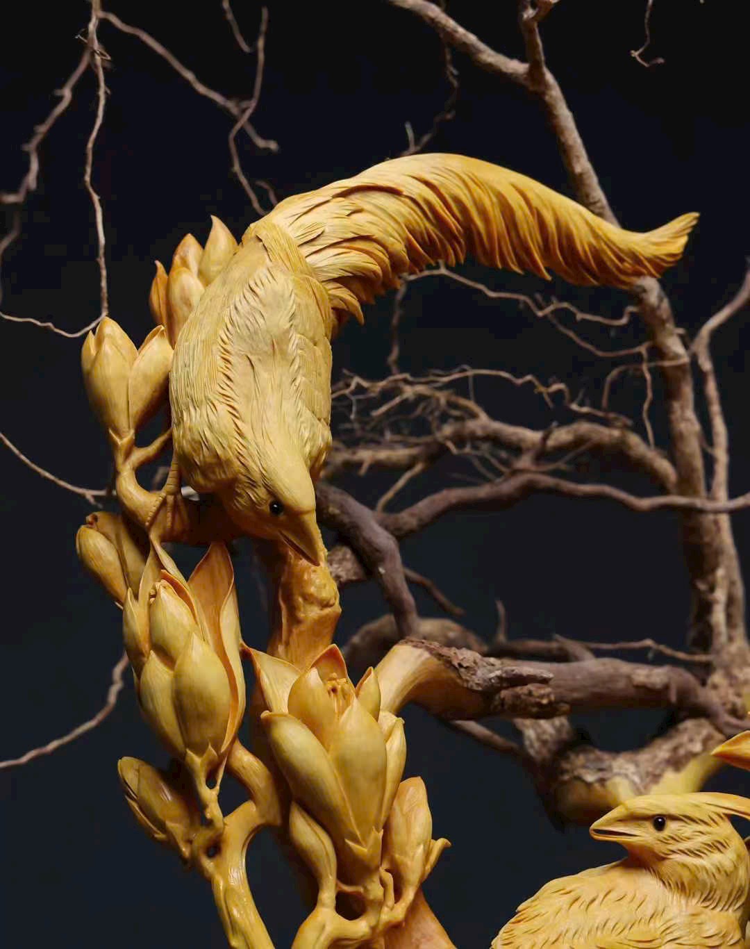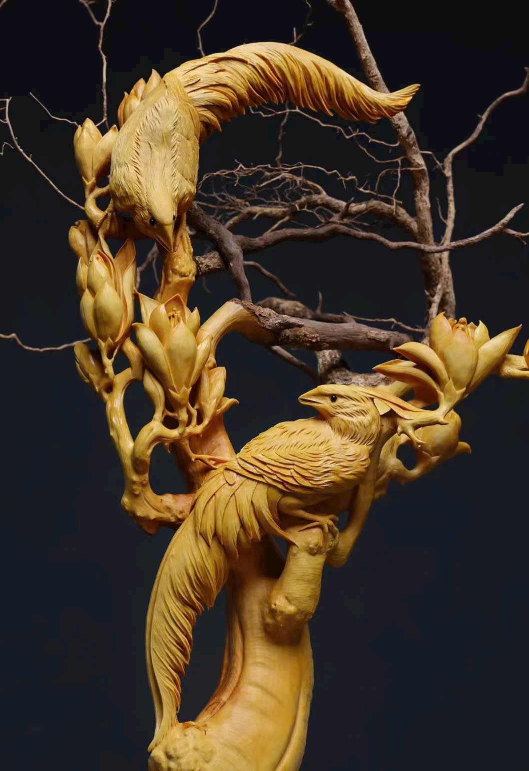 Tác phẩm được chạm khắc thủ công nguyên khối, một gỗ liền mạch không ghép, áp dụng kỹ thuật tròn khối, đường nét tinh xảo – chắc tay. Phẩm tướng hoàn mỹ, không tì vết, mang ý nghĩa phú quý cát tường, hỷ sự nhân đôi, rất phù hợp trang trí nhà ở, phòng khách, hoặc sưu tầm.