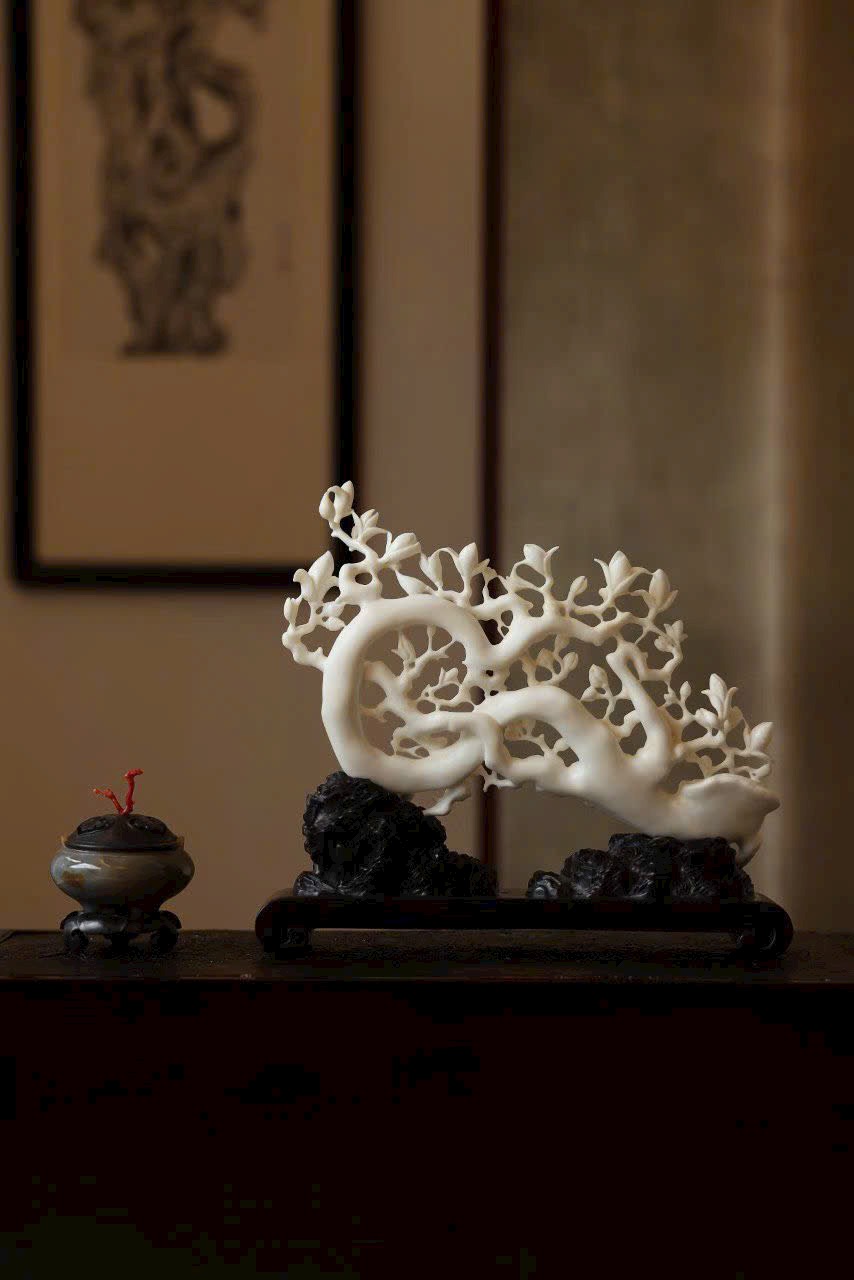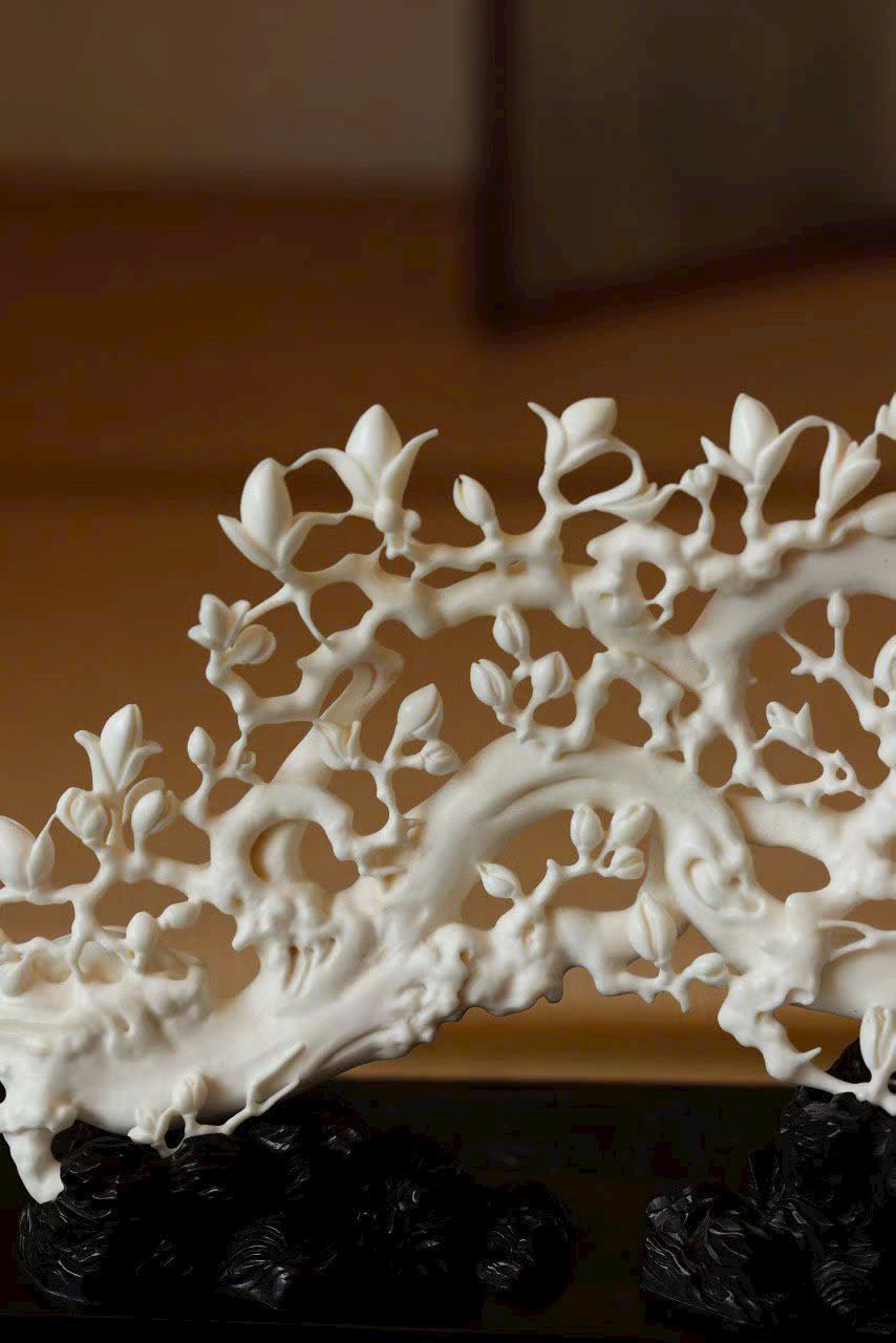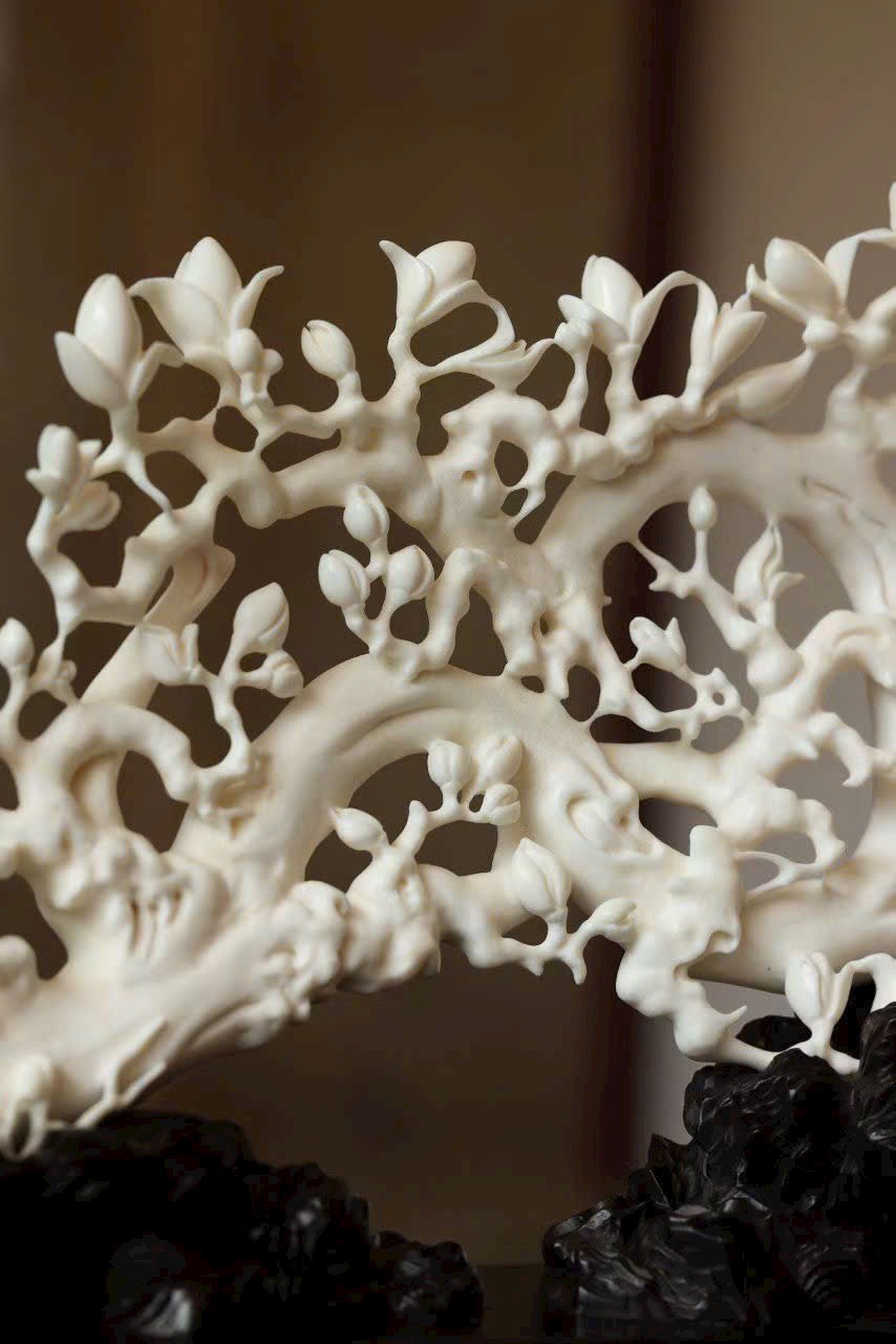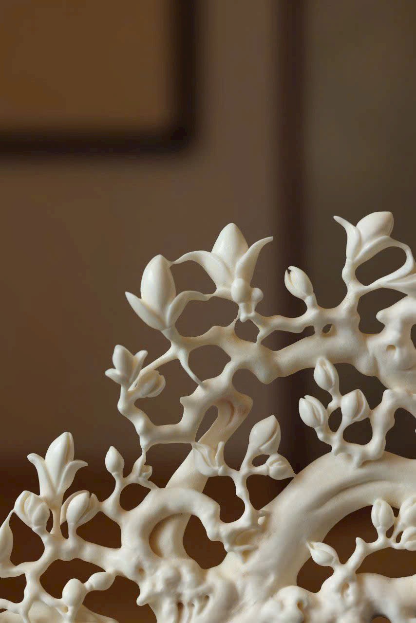 Lấy ý nghĩa phú quý của hoa ngọc lan làm chủ đề, tác phẩm được chạm khắc tinh xảo, khéo léo. Sắc trắng thanh nhã, màu ngọc non trong trẻo, linh động. Hoa và lá nở xếp đoan trang, tầng lớp hài hòa, nhụy như chuỗi ngọc xanh, long lanh tựa giọt sương. Bày trong không gian văn phòng – thư án, toát lên vẻ thanh tú, nhã nhặn, dư vị bền lâu, phong vận riêng biệt.
