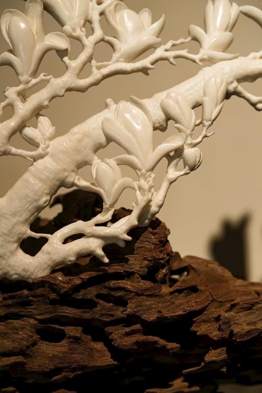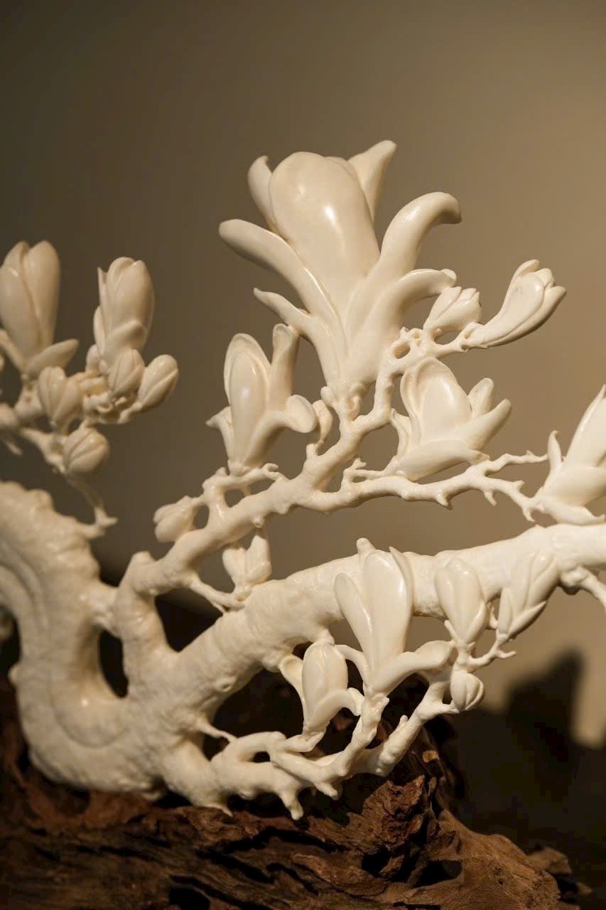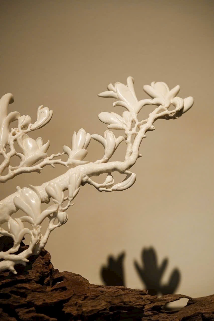 Chế tác từ một khối nguyên liệu hoàn chỉnh, chạm khắc khéo léo hình hoa ngọc lan nở rộ – biểu tượng của phú quý và thịnh vượng. Cánh hoa, nhụy hoa và lá được thể hiện rõ nét, bố cục có chiều sâu với hiệu ứng gần thực xa mờ mang phong cách hội họa hiện thực. Tay nghề thể hiện tinh xảo, đường đục mộc mạc thanh nhã, hàm chứa ý nghĩa tốt lành. Phẩm vật dùng để trưng bày thanh nhã, thích hợp đặt trên bàn án, mang vẻ đẹp trầm lặng không phô trương.