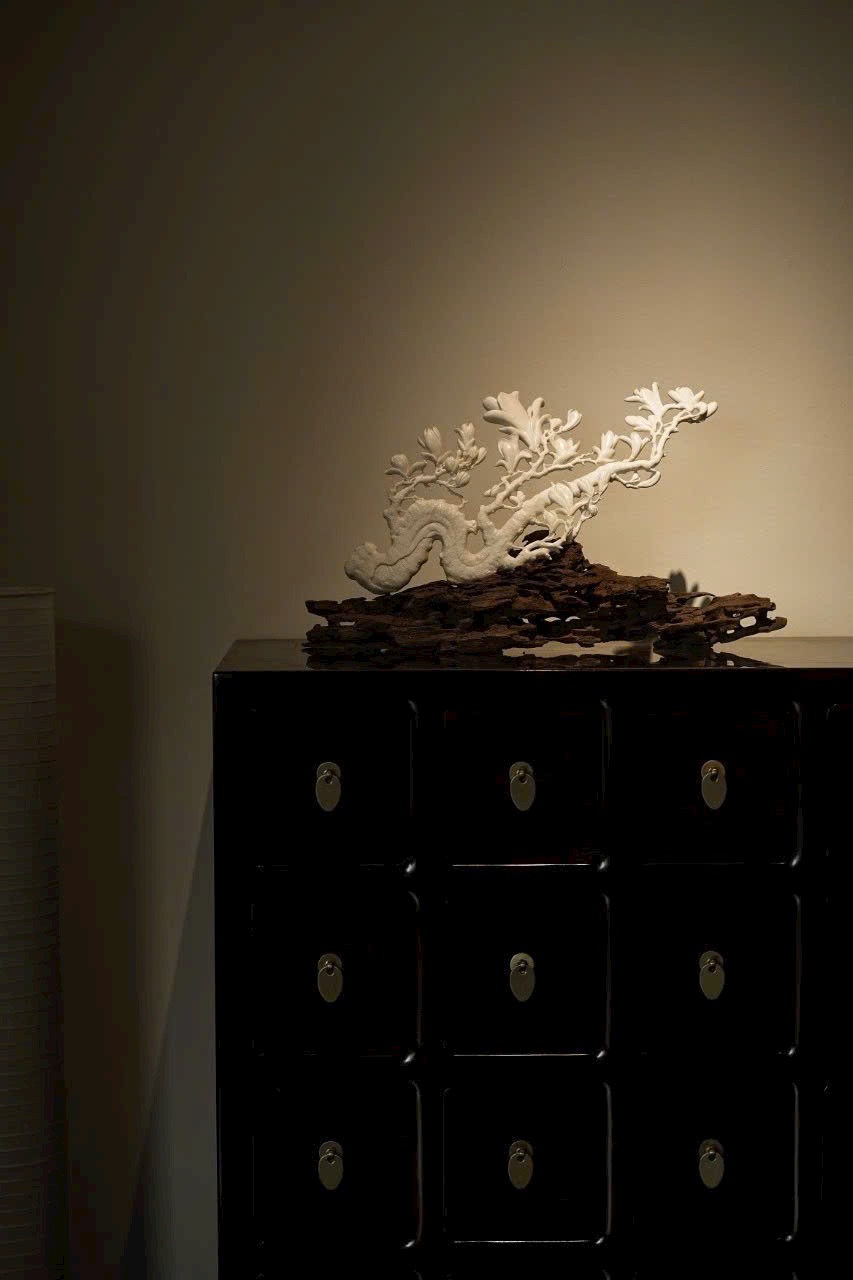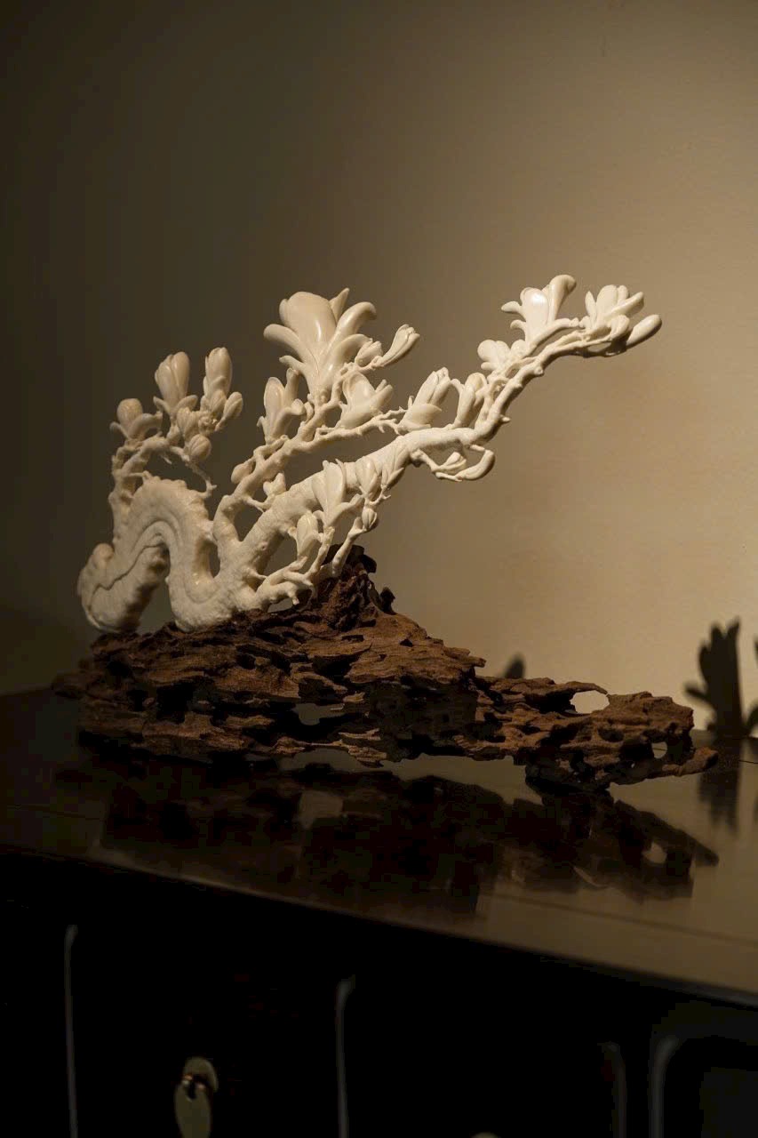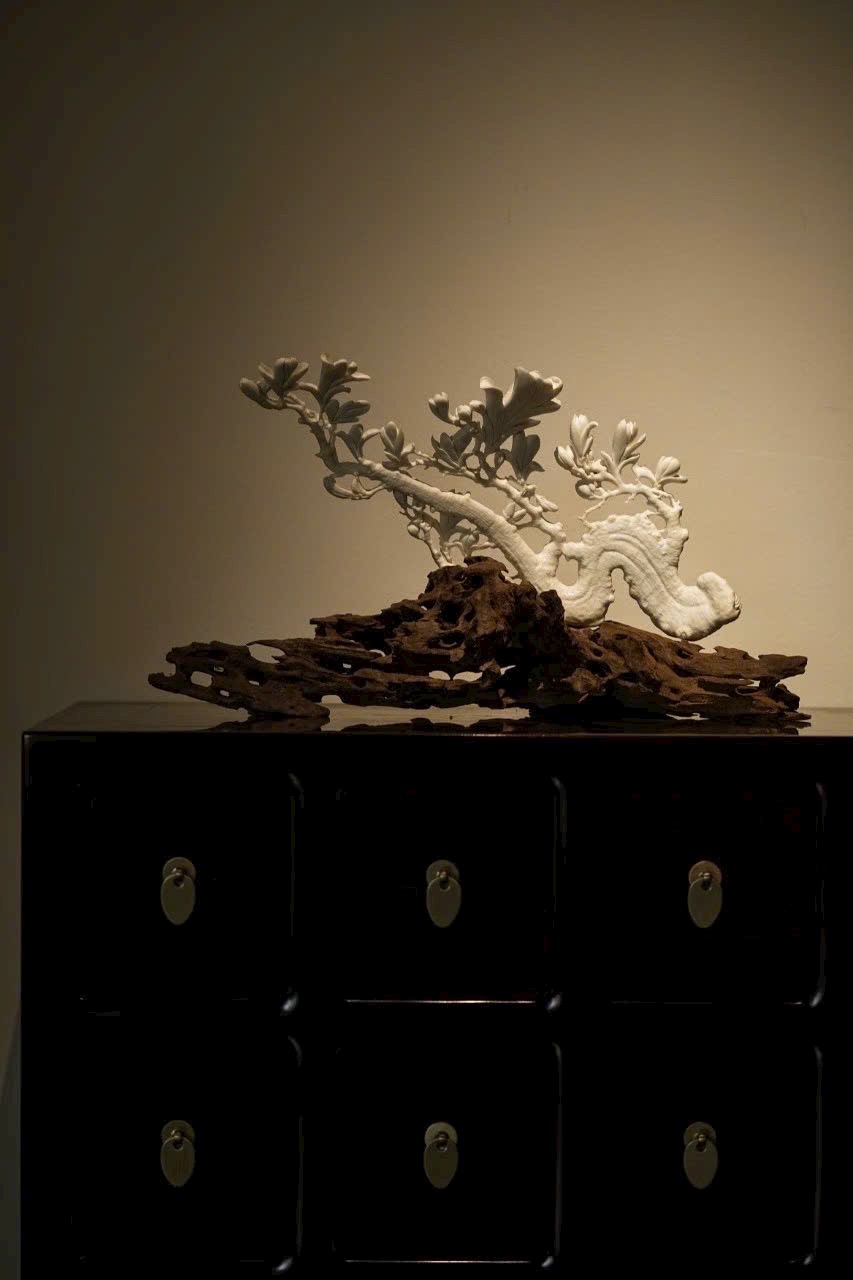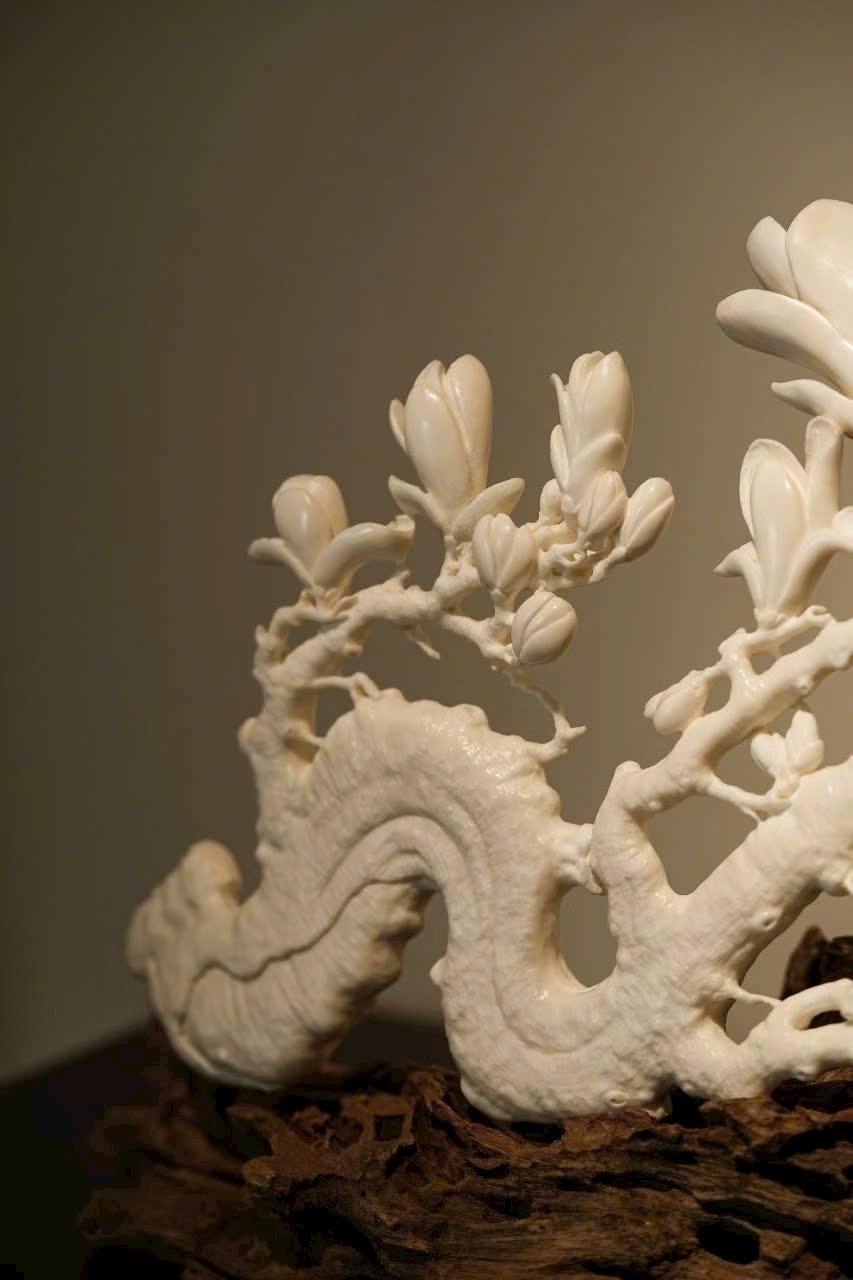 Chế tác từ một khối nguyên liệu hoàn chỉnh, chạm khắc khéo léo hình hoa ngọc lan nở rộ – biểu tượng của phú quý và thịnh vượng. Cánh hoa, nhụy hoa và lá được thể hiện rõ nét, bố cục có chiều sâu với hiệu ứng gần thực xa mờ mang phong cách hội họa hiện thực. Tay nghề thể hiện tinh xảo, đường đục mộc mạc thanh nhã, hàm chứa ý nghĩa tốt lành. Phẩm vật dùng để trưng bày thanh nhã, thích hợp đặt trên bàn án, mang vẻ đẹp trầm lặng không phô trương.