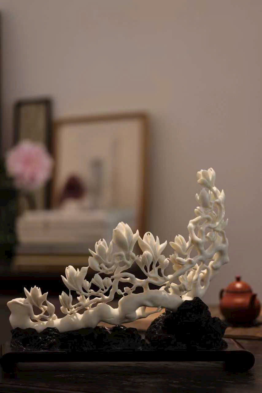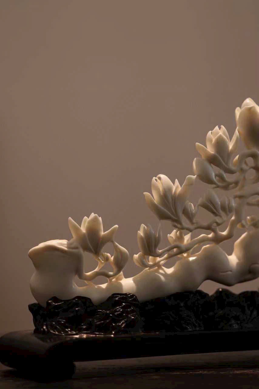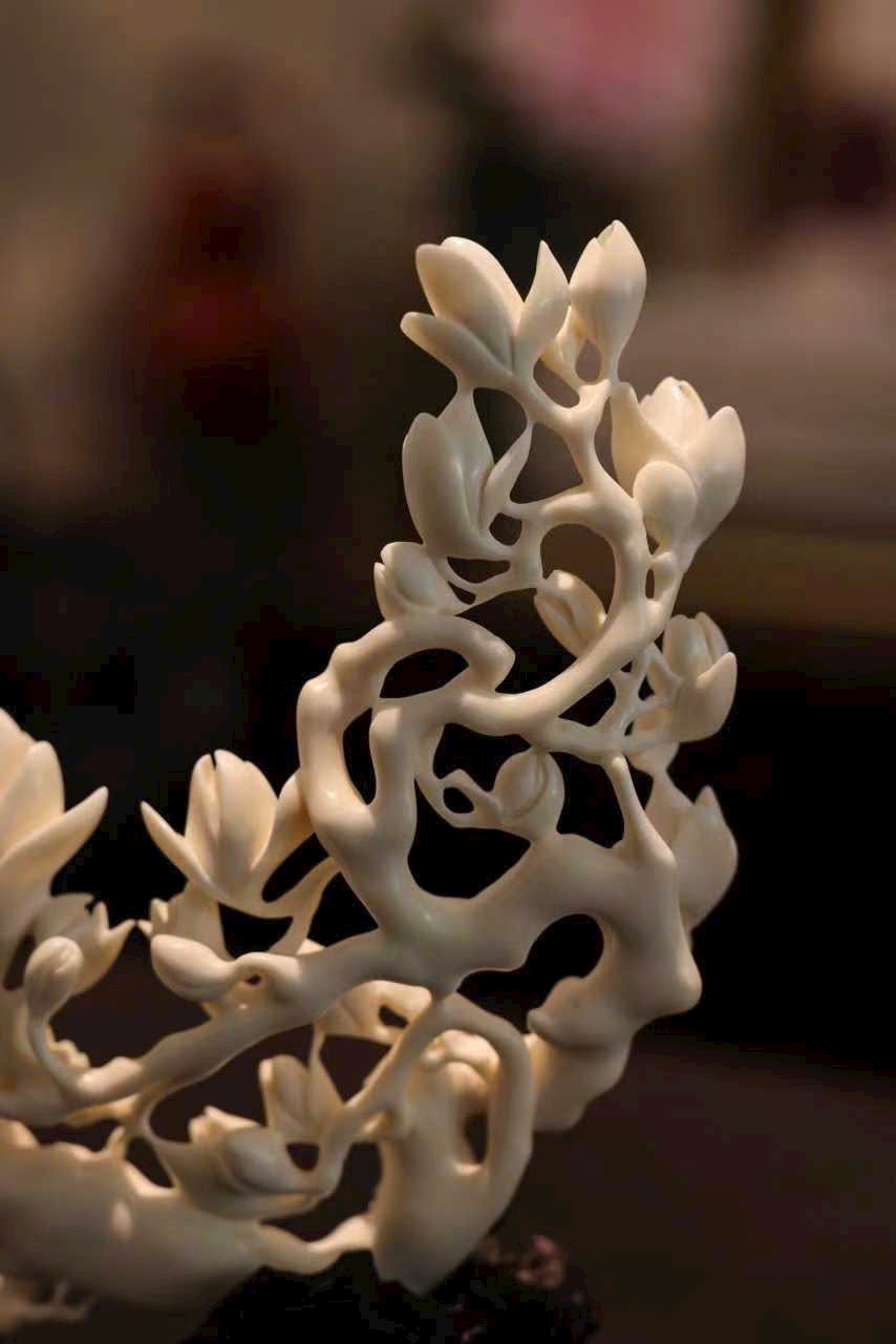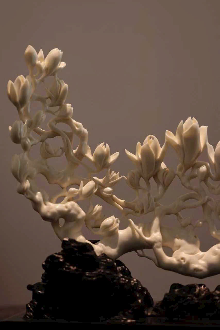 Tác phẩm điêu khắc hoa ngọc lan trên chất liệu gạc hươu, hoàn toàn được chạm khắc thủ công tinh xảo.