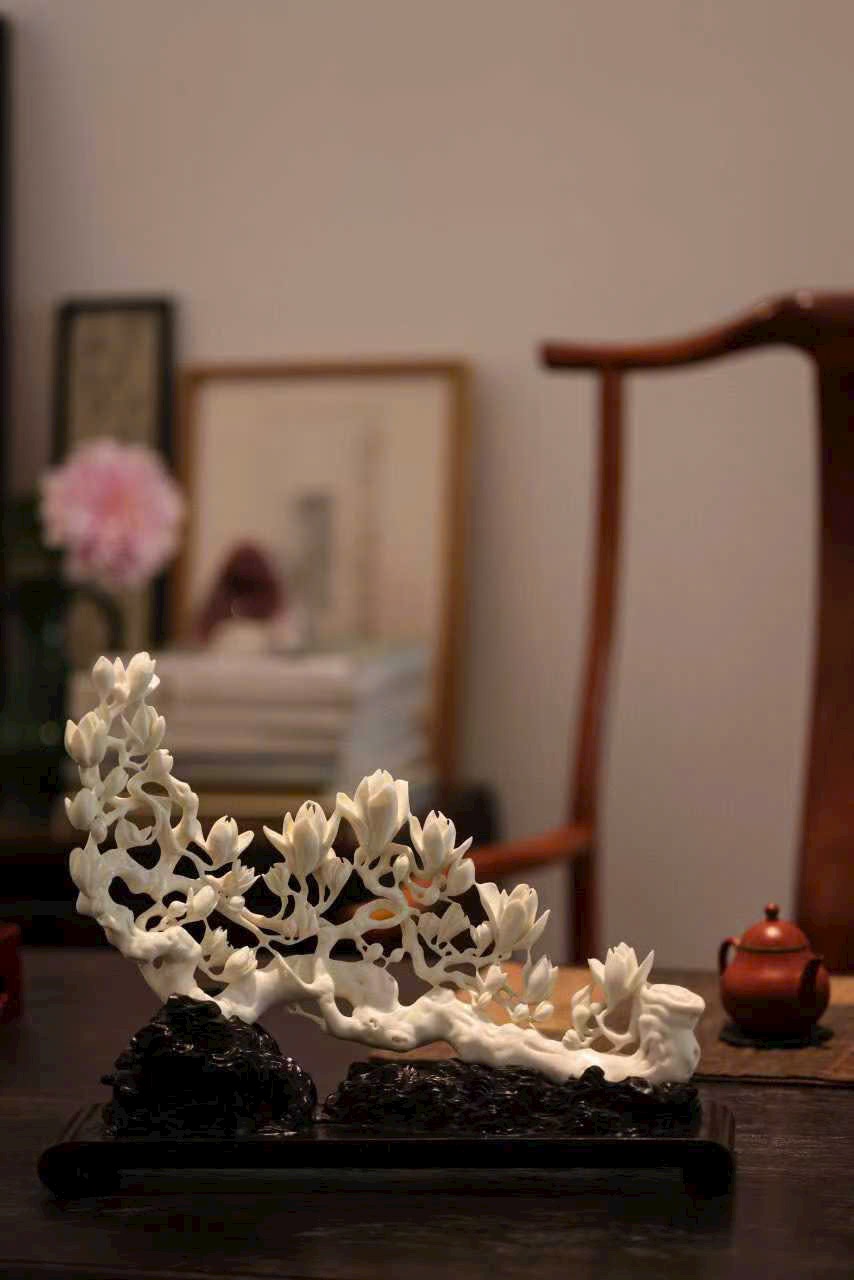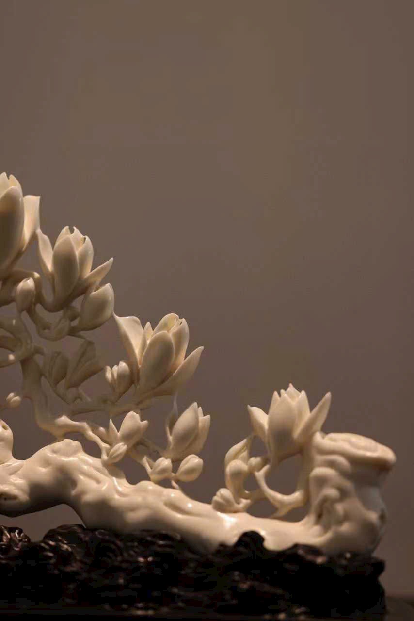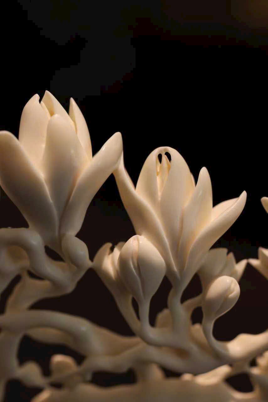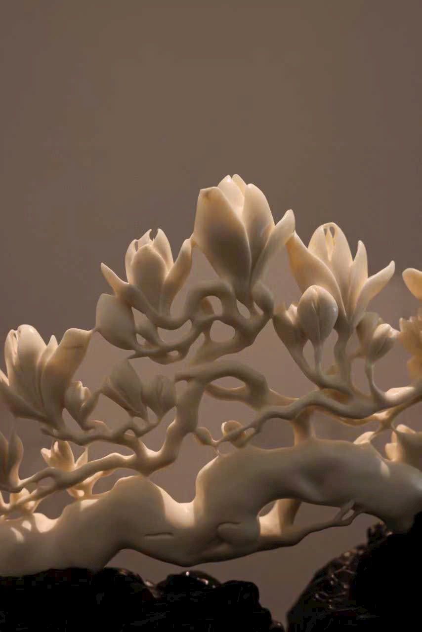 Tác phẩm điêu khắc hoa ngọc lan trên chất liệu gạc hươu, hoàn toàn được chạm khắc thủ công tinh xảo.