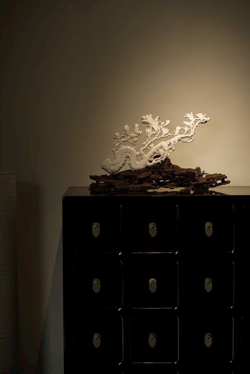 Nguyên liệu nguyên khối, khéo léo chạm khắc cảnh hoa ngọc lan nở, tượng trưng hoa khai phú quý. Hoa, nhụy, lá phân tầng rõ rệt, gần thực xa hư, mang phong vị hội họa hiện thực. Đường đao mộc mạc tao nhã, ý nghĩa tốt đẹp. Phẩm thanh cúng dường, nhã thú thưởng ngoạn, đặt nơi án thư, đẹp một cách tự nhiên.