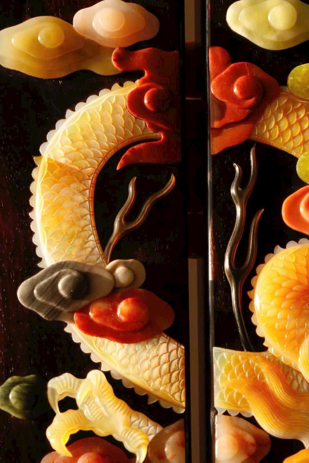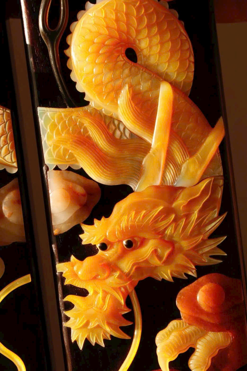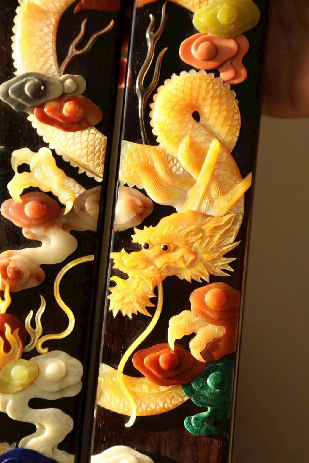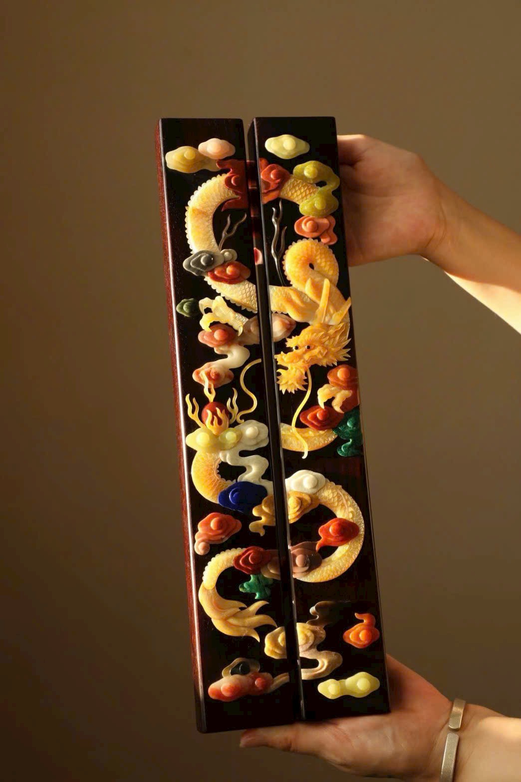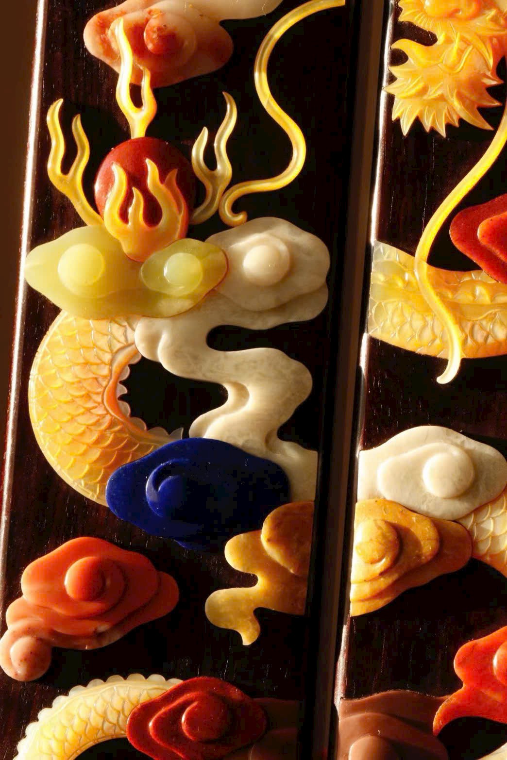 Toàn thân khảm bách bảo tinh xảo bằng ngọc thạch và châu báu, tạo hình rồng ngự uy vũ oai phong, vảy rồng xếp lớp lộng lẫy, mây và ngọc châu phiêu dật tự nhiên.