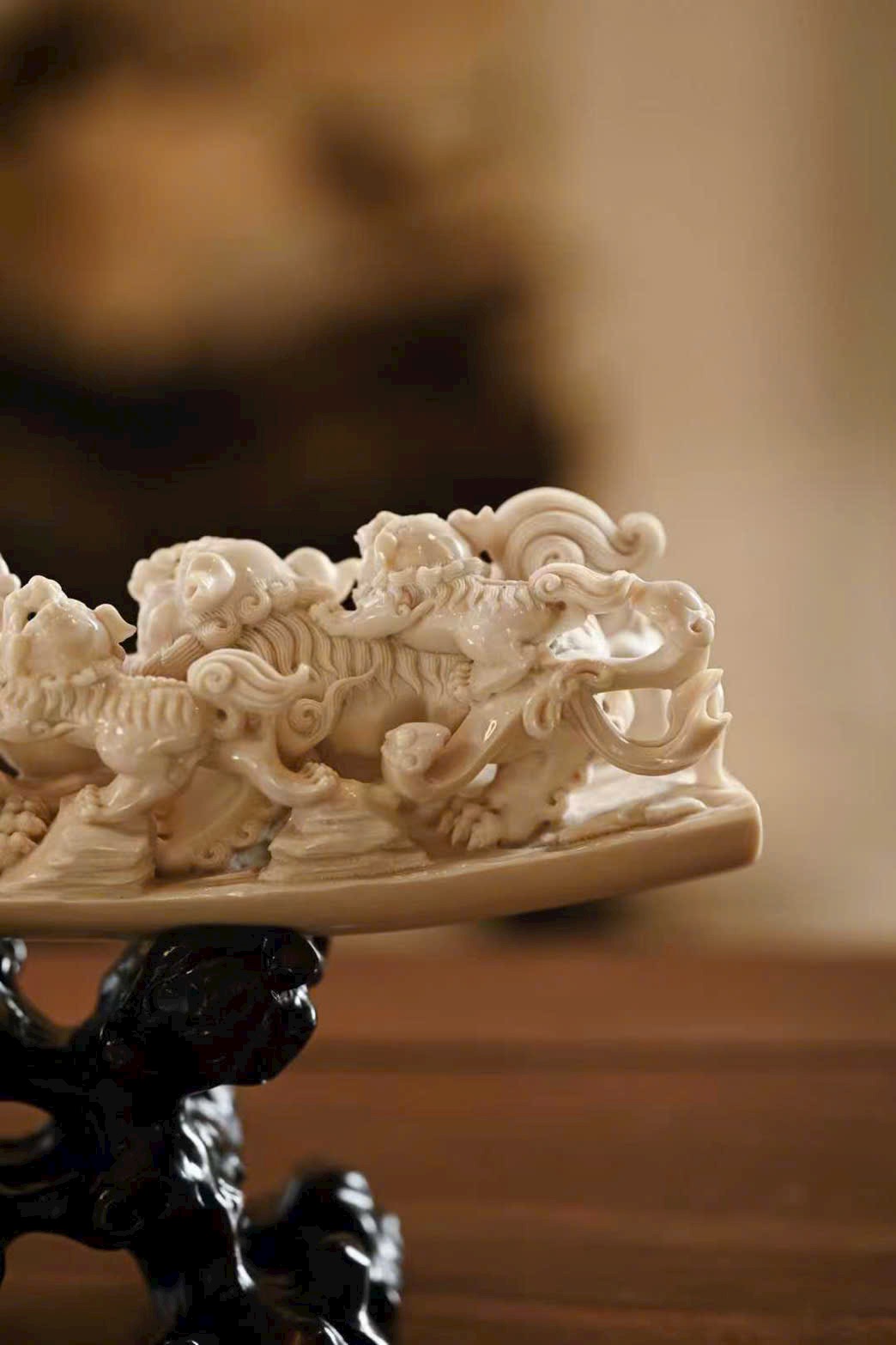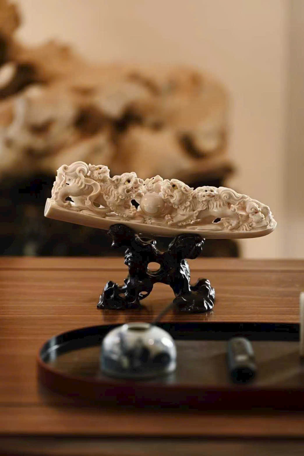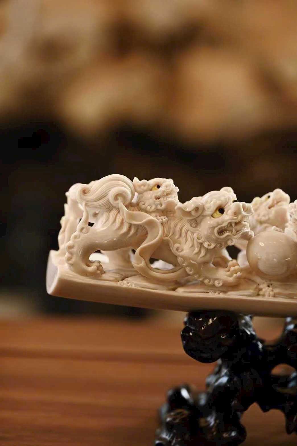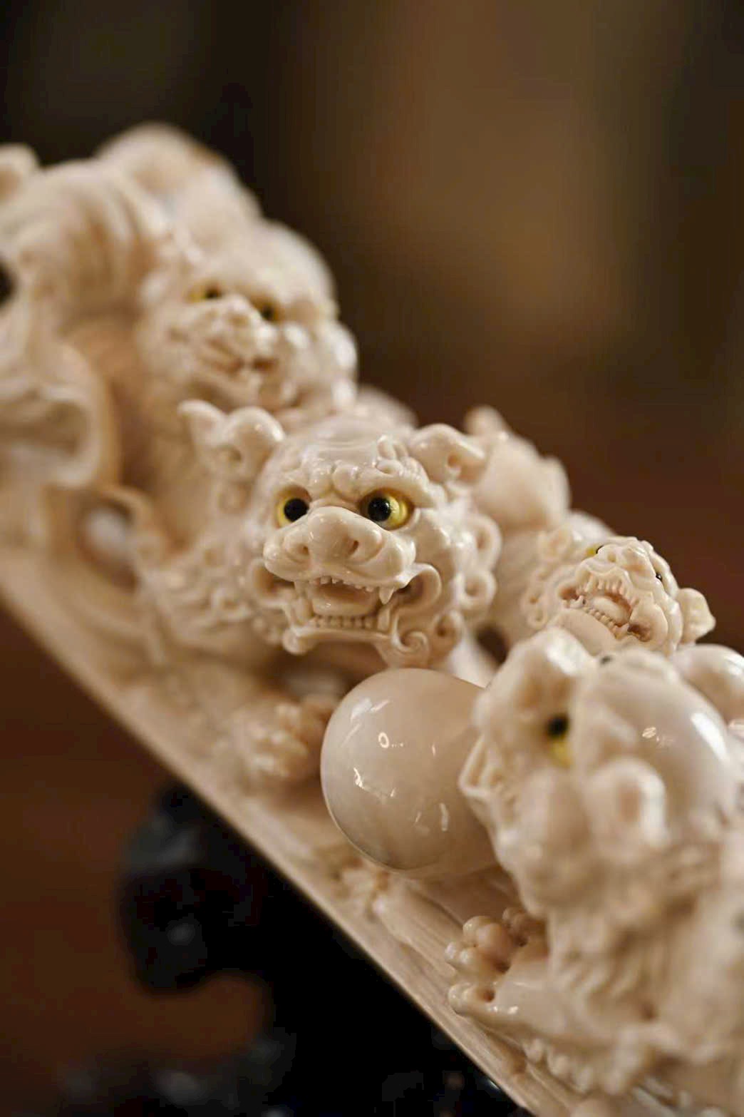 Chất liệu cổ phác, ấm nhã, mịn màng tự nhiên; kỹ nghệ điêu khắc tinh xảo, đường nét đầy đặn và uyển chuyển. Năm con sư tử quây quanh chơi cầu, tạo nên bố cục sinh động, mạnh mẽ. Đặt trên án thư hay bàn trưng bày đều mang lại vẻ thú vị riêng.