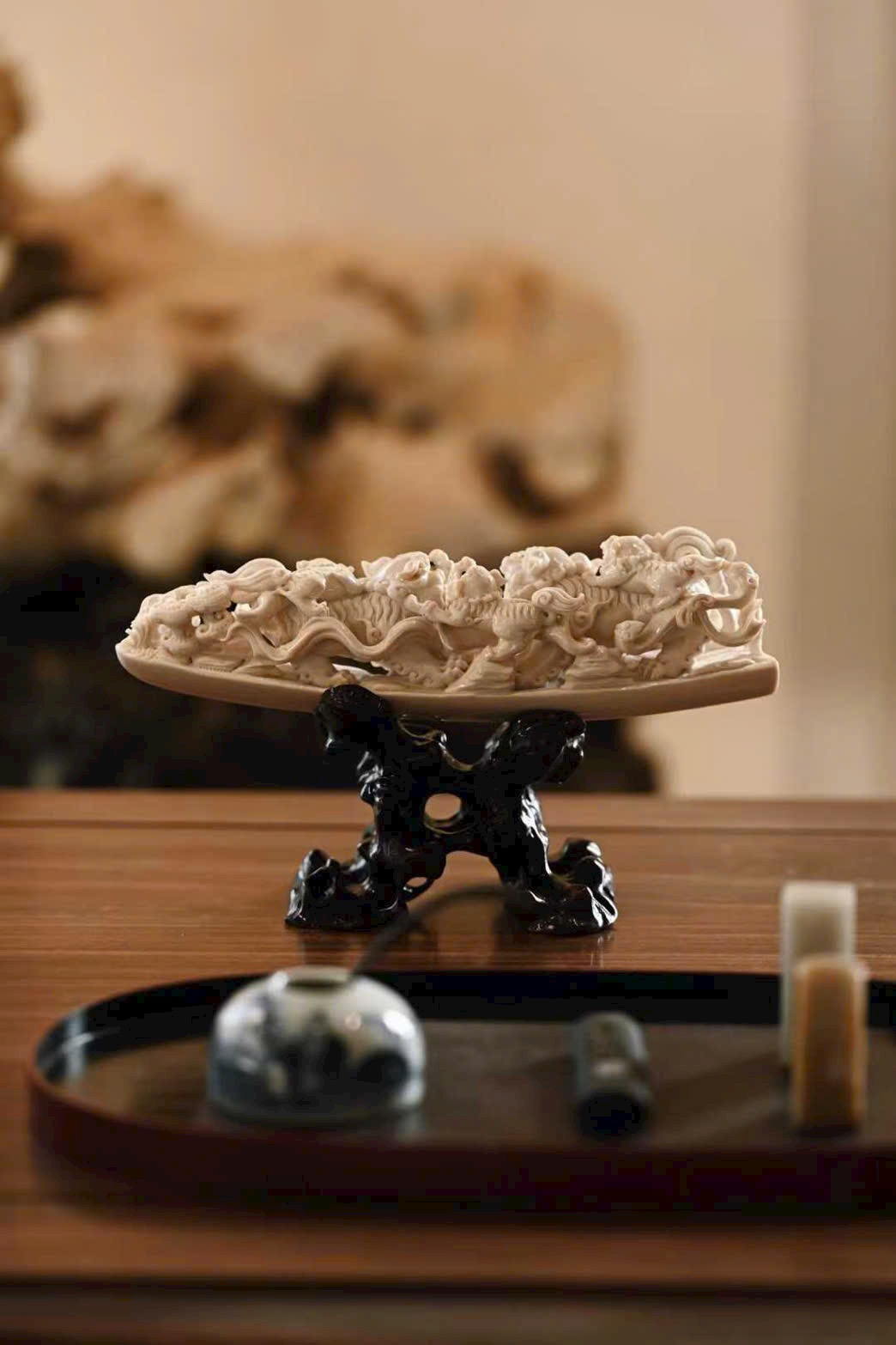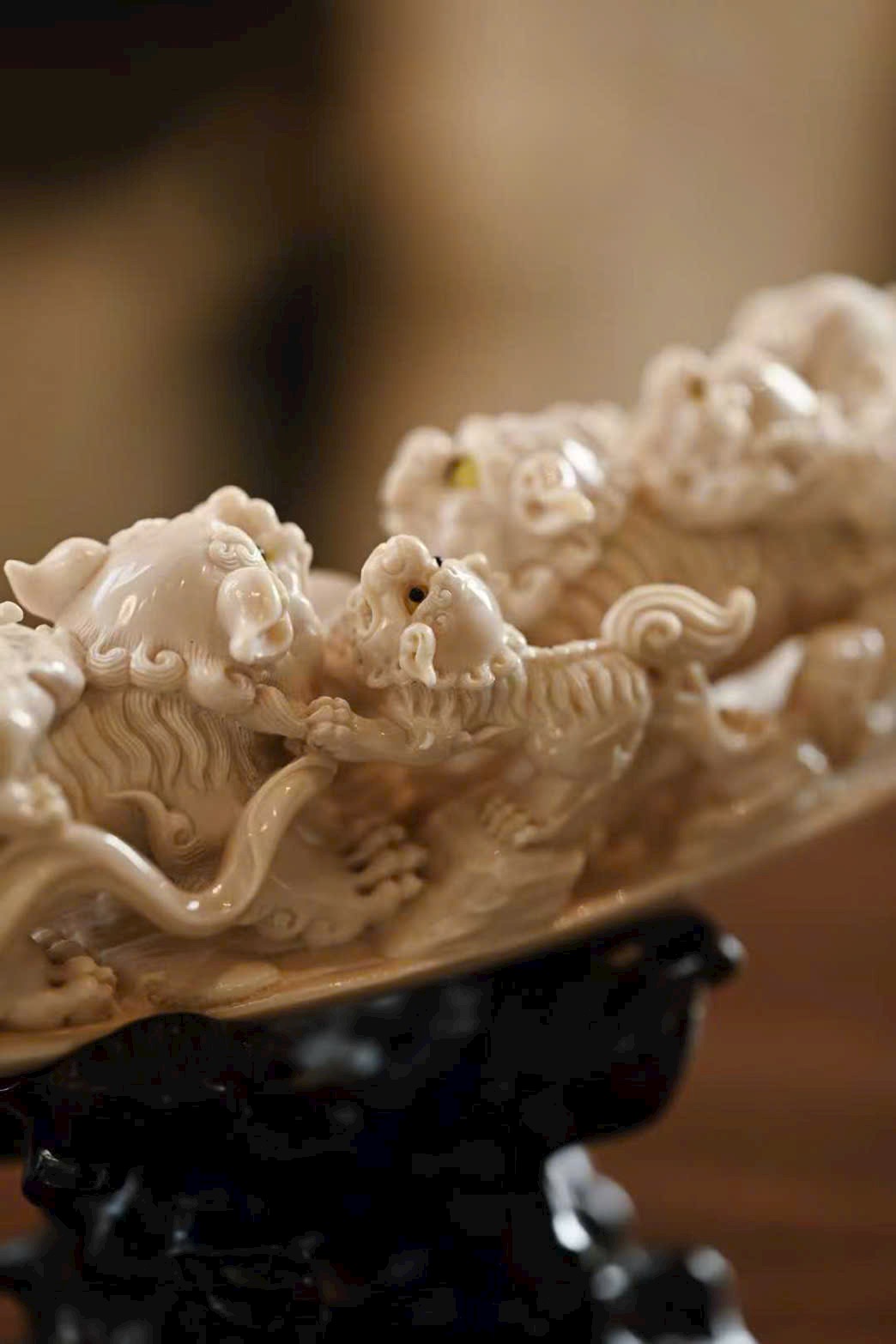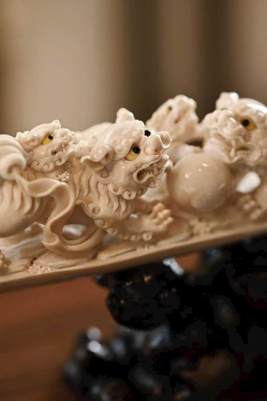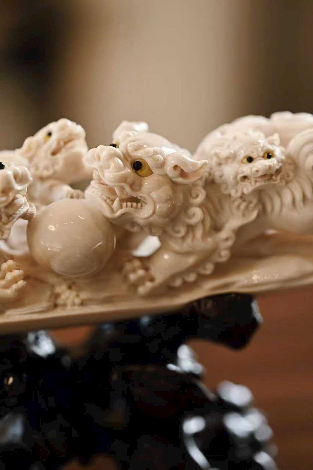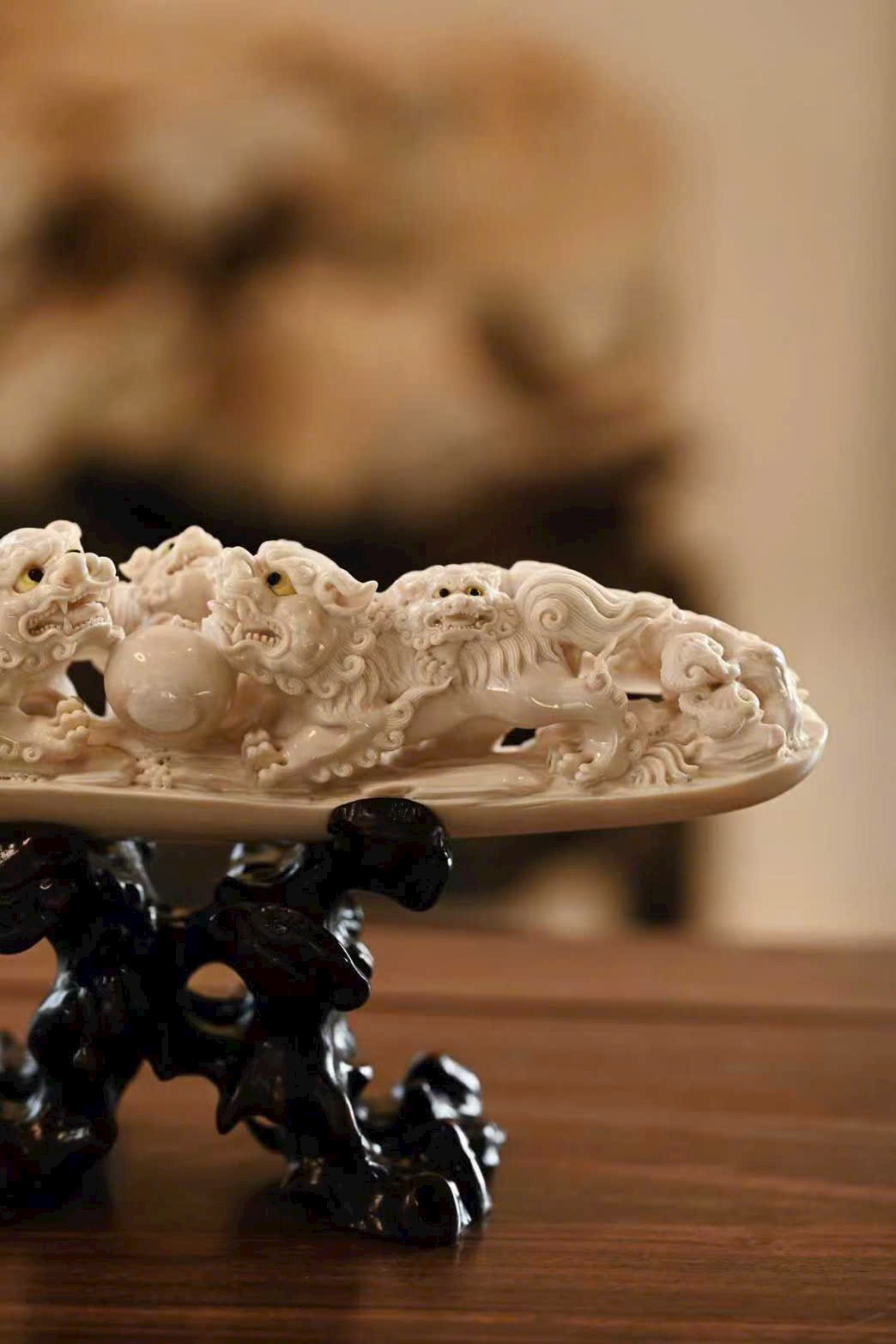 Chất liệu cổ phác, ấm nhã, mịn màng tự nhiên; kỹ nghệ điêu khắc tinh xảo, đường nét đầy đặn và uyển chuyển. Năm con sư tử quây quanh chơi cầu, tạo nên bố cục sinh động, mạnh mẽ. Đặt trên án thư hay bàn trưng bày đều mang lại vẻ thú vị riêng.