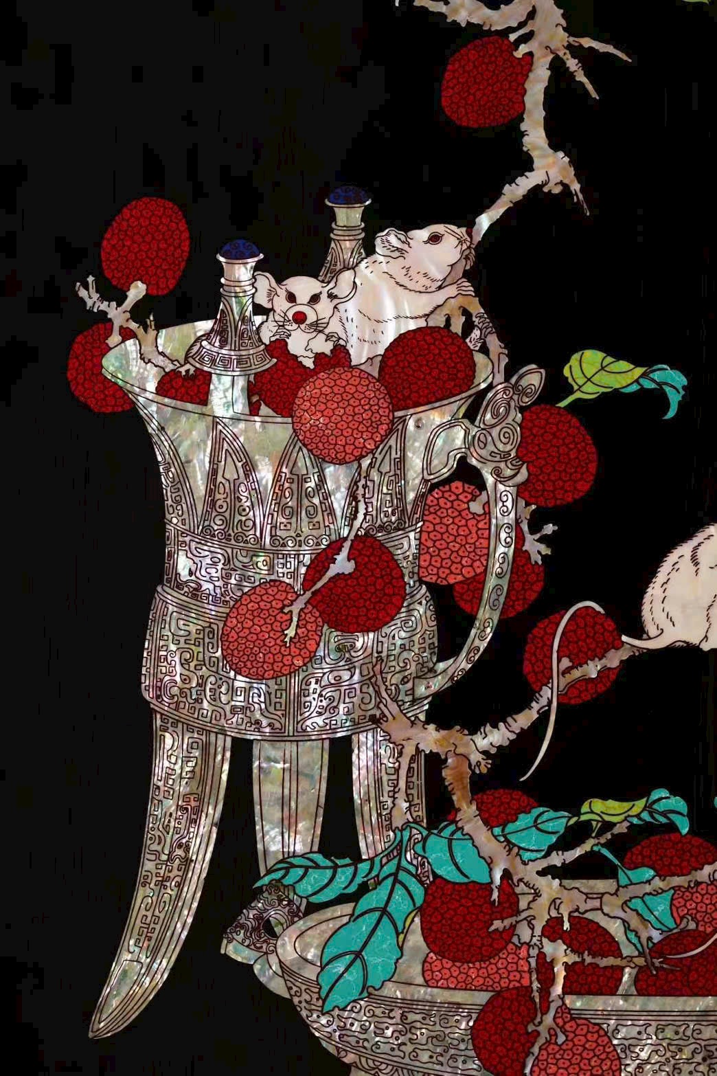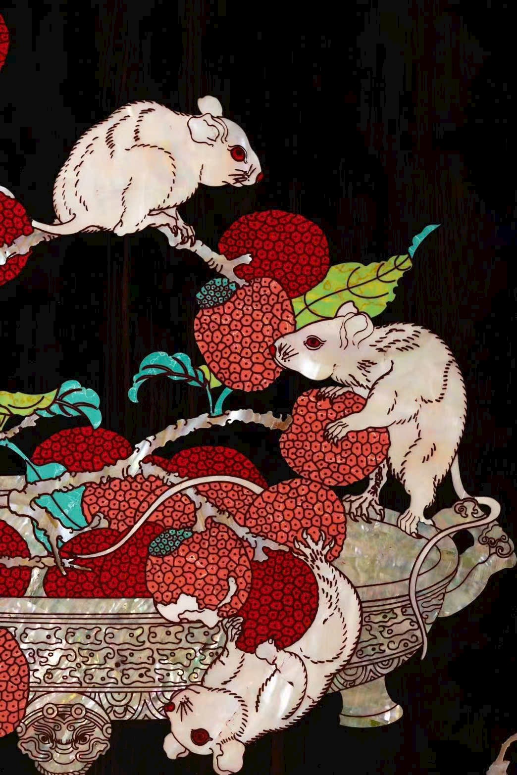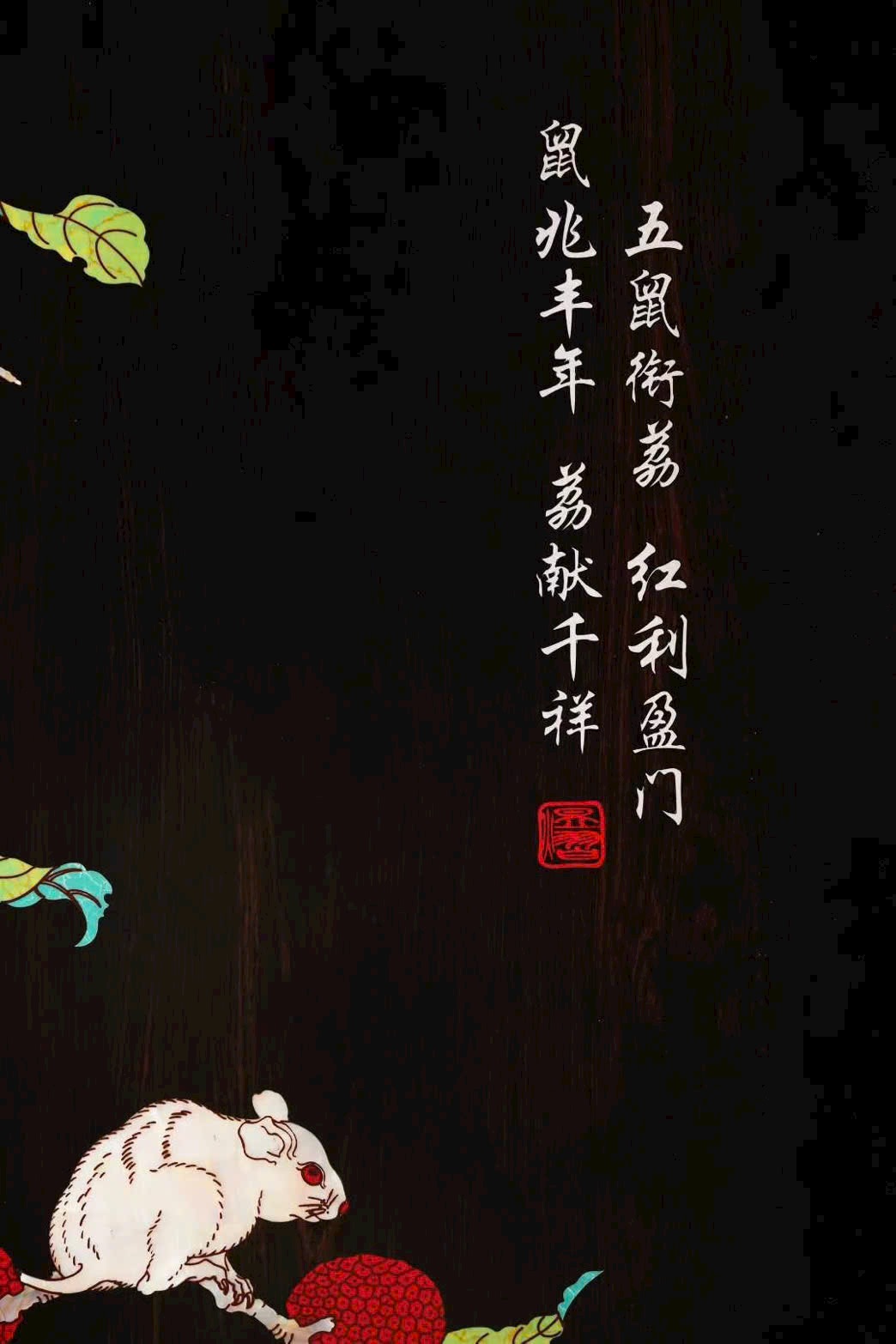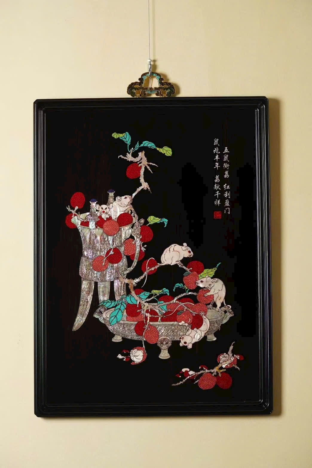 Bức treo này lấy hình tượng chuột để ví cho “nhiều phúc nhiều tài”, mượn trái vải (lệ) để biểu trưng cho “hồng lợi đầy ắp”. Ốc xà cừ khảm trên nền gỗ tử quang đàn lấp lánh ánh sáng, gắn “điều lành năm mới dồi dào” vào trong đời sống.
