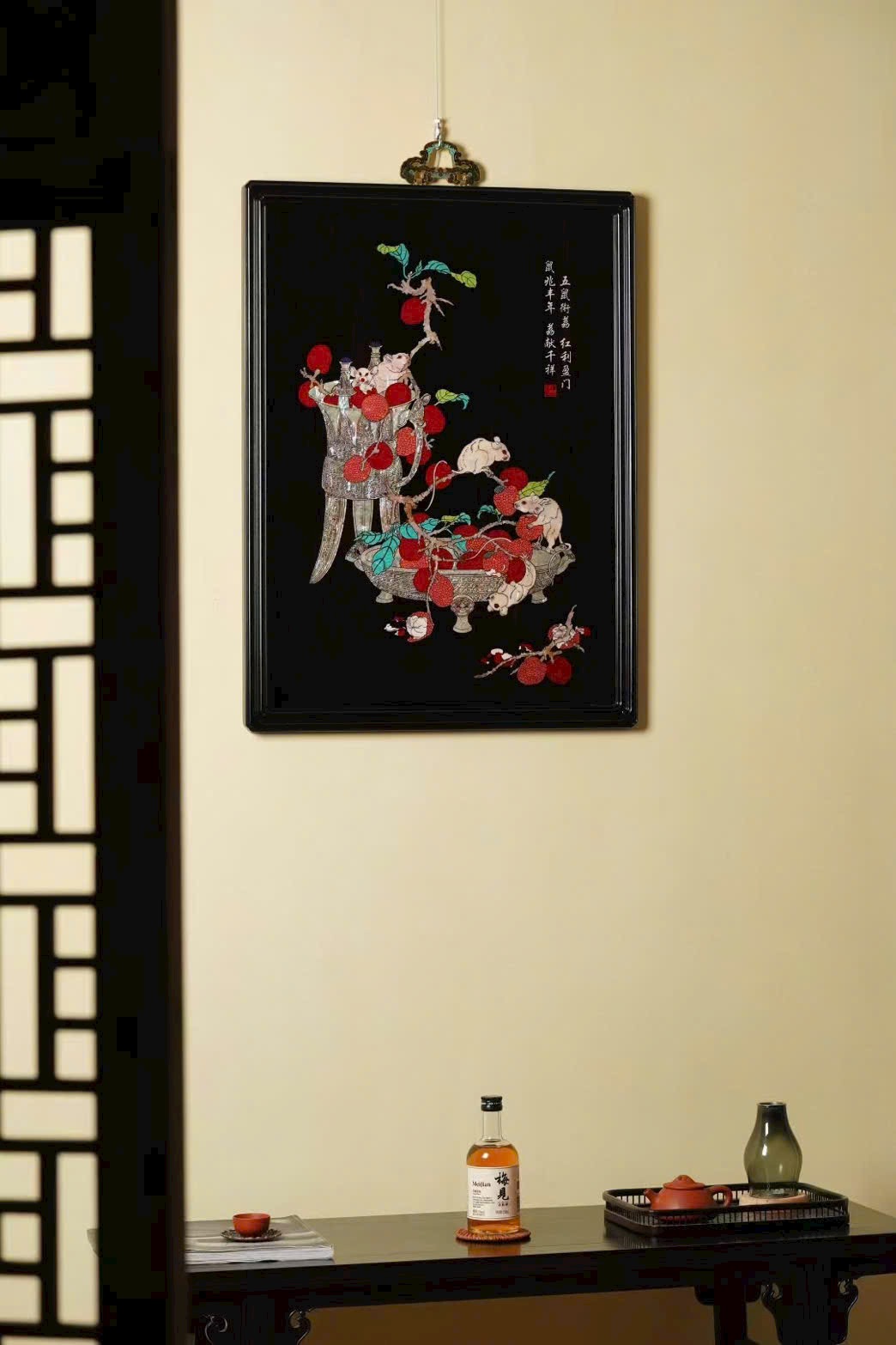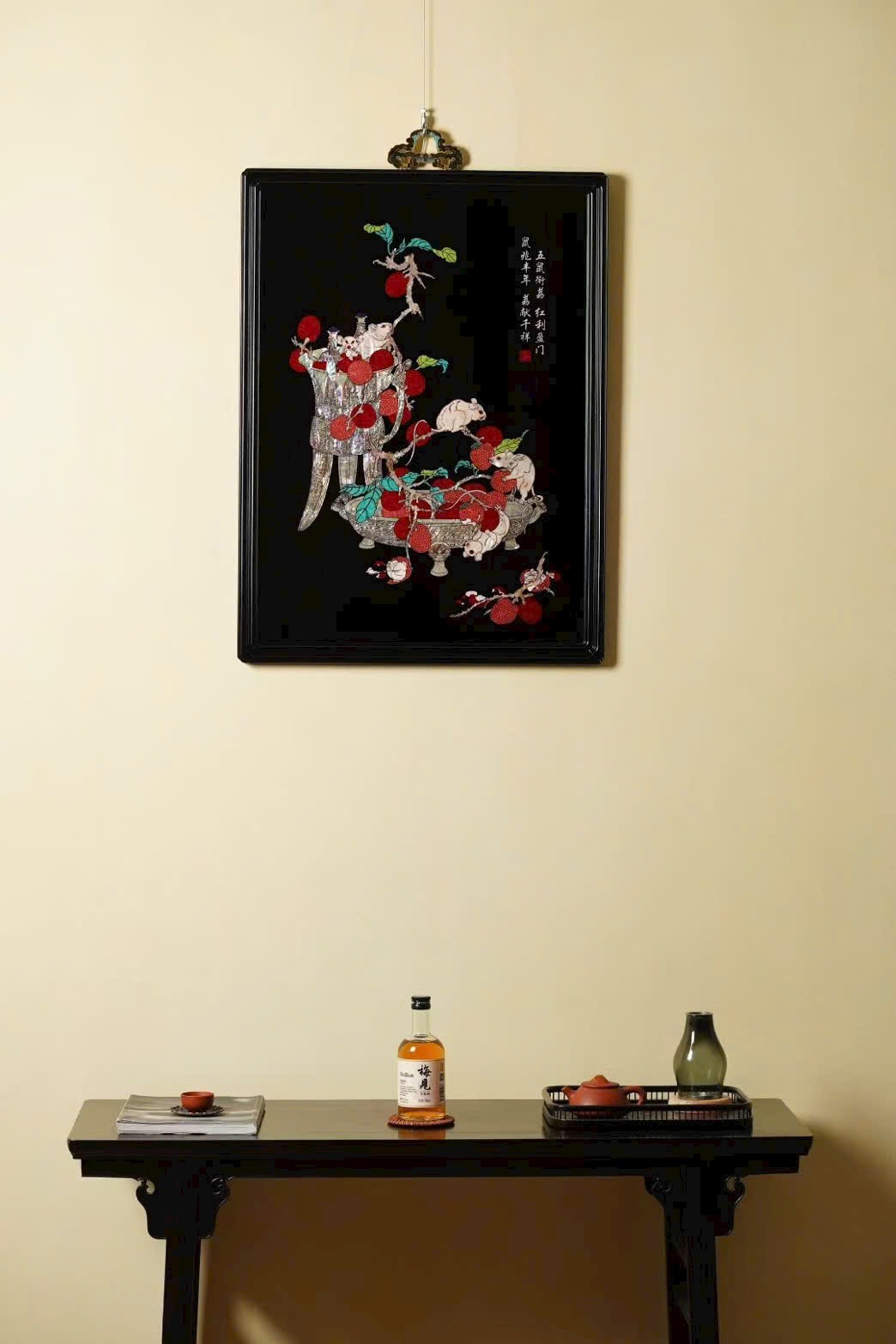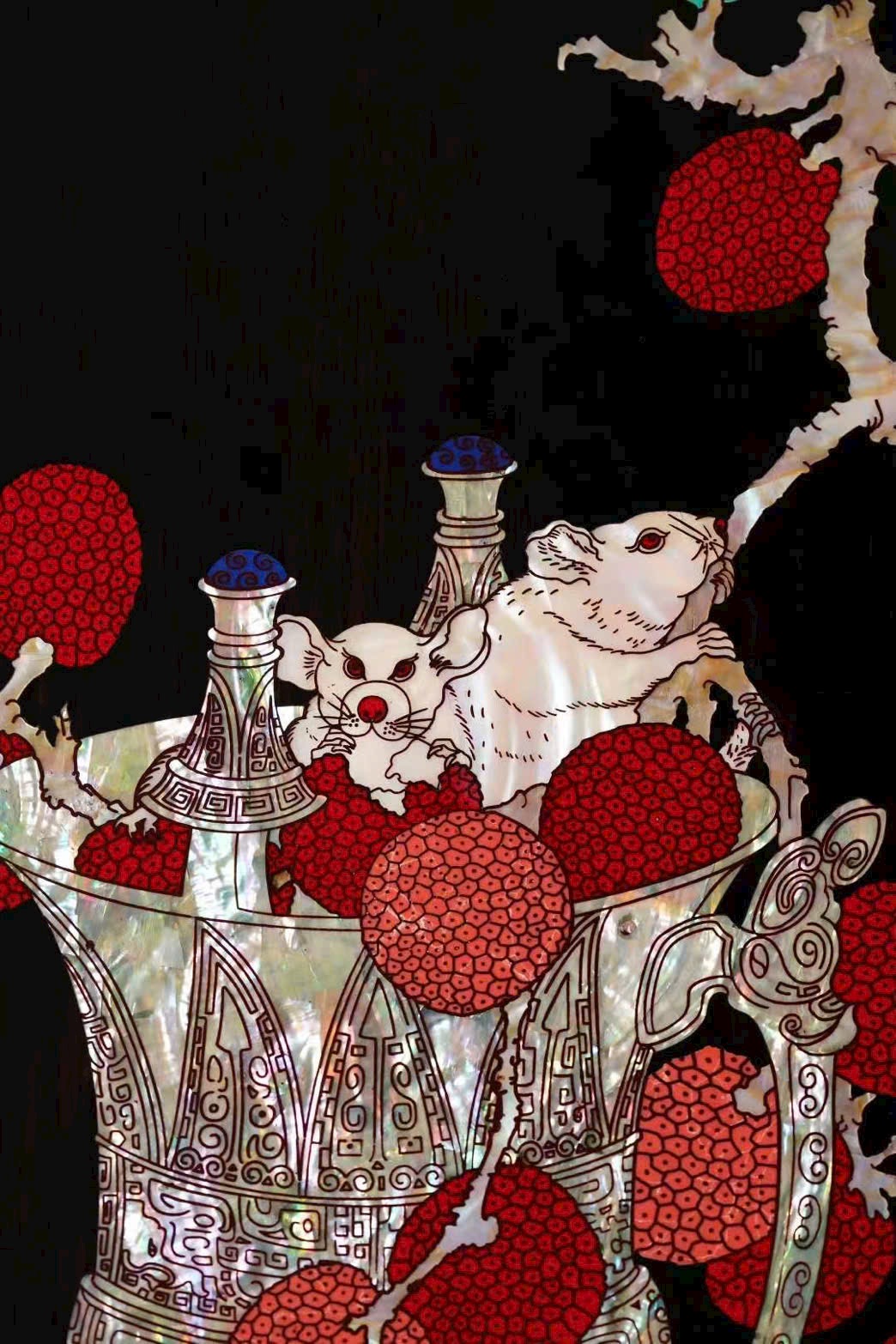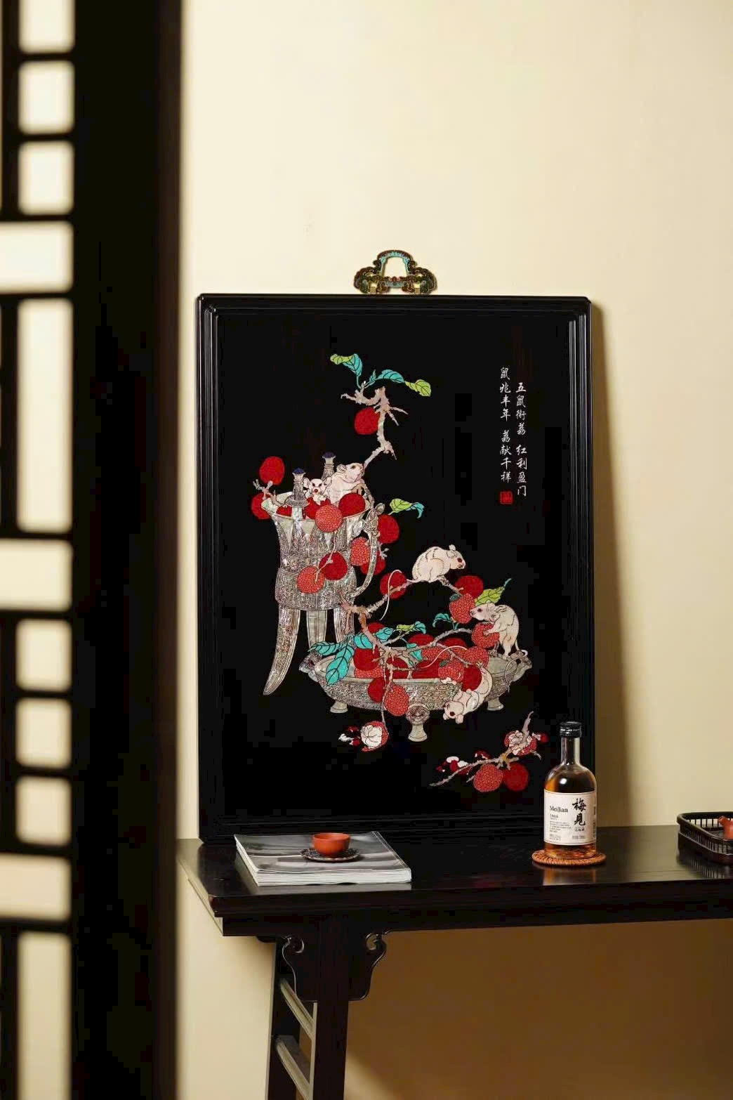 Bức treo này lấy hình tượng chuột để ví cho “nhiều phúc nhiều tài”, mượn trái vải (lệ) để biểu trưng cho “hồng lợi đầy ắp”. Ốc xà cừ khảm trên nền gỗ tử quang đàn lấp lánh ánh sáng, gắn “điều lành năm mới dồi dào” vào trong đời sống.
