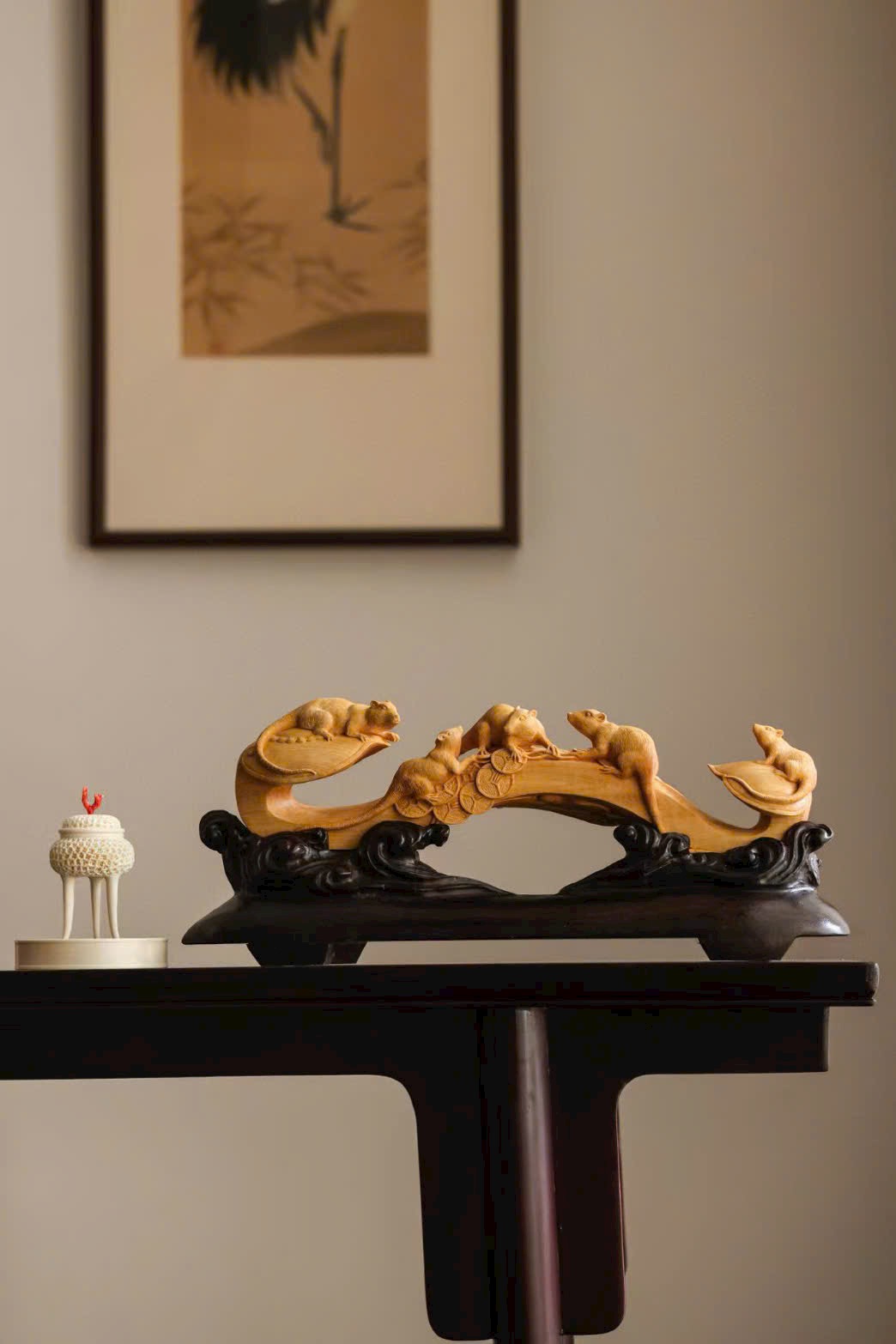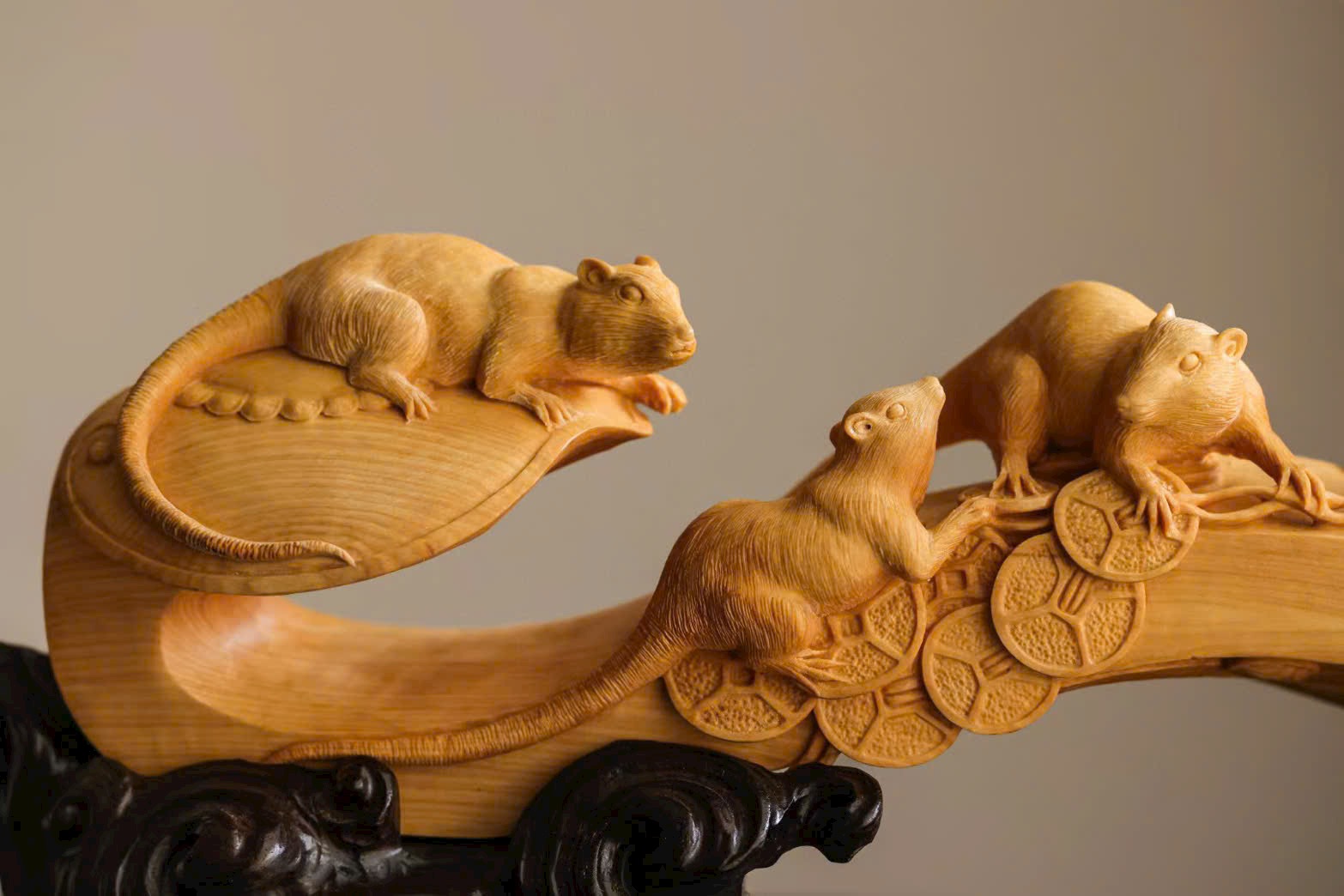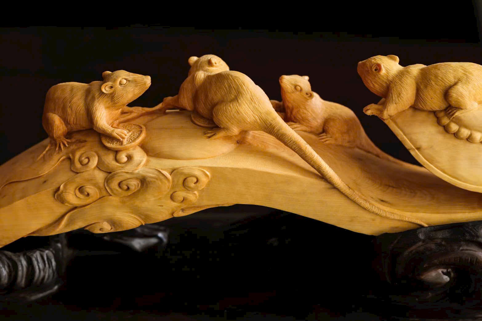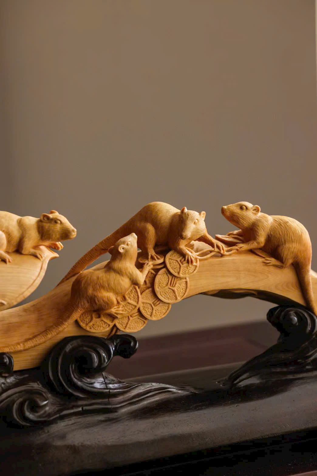 Tác phẩm chạm khắc liền khối từ một khúc gỗ, bố cục sắp đặt hài hòa, lớp lang rõ ràng. Năm chú chuột thần thái tương ứng, dáng vẻ linh động, toát lên linh khí sinh tài. Bày nơi án thư, gửi gắm lời chúc tài lộc hanh thông, tiền bạc nối tiếp, mọi việc thuận hòa như ý.