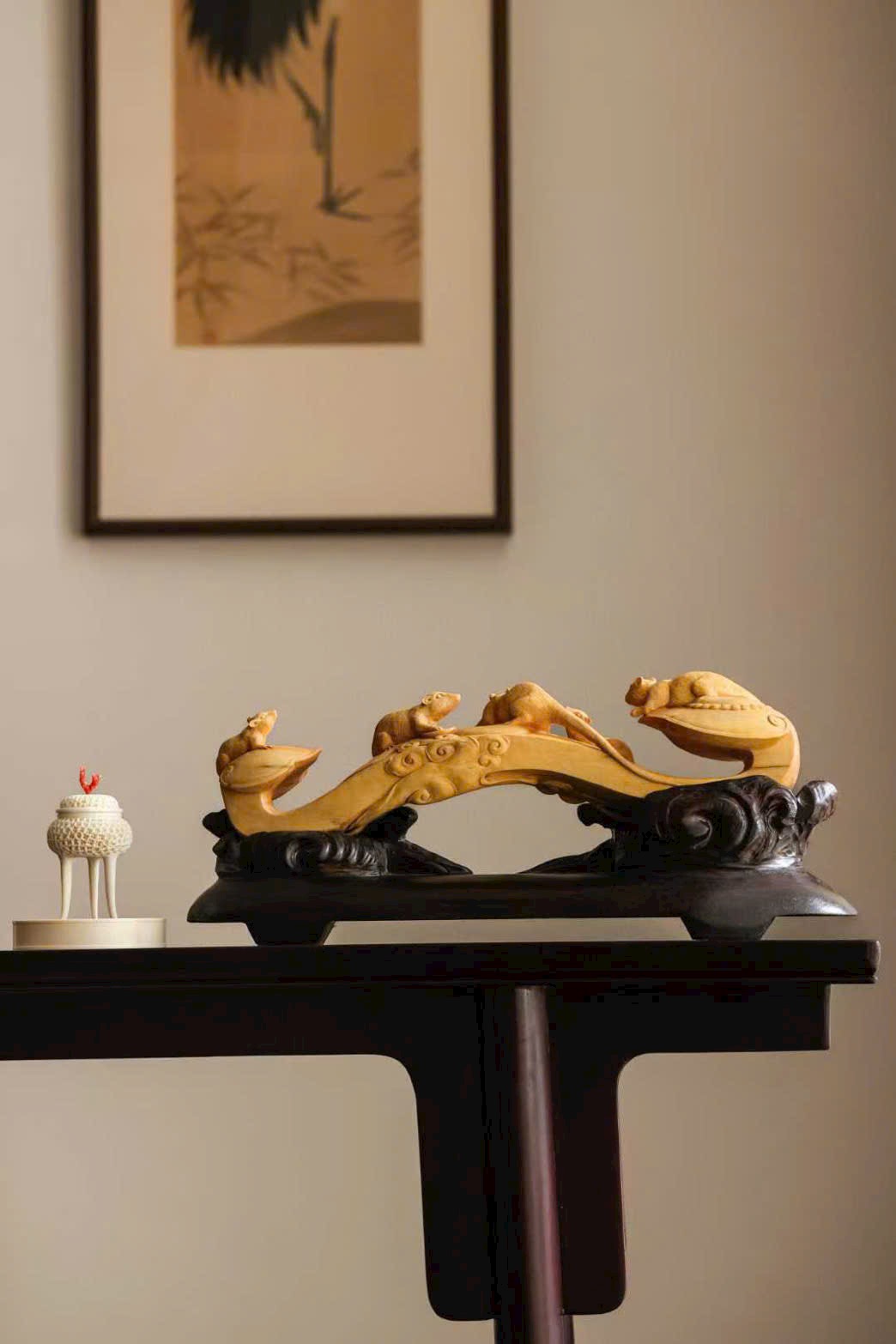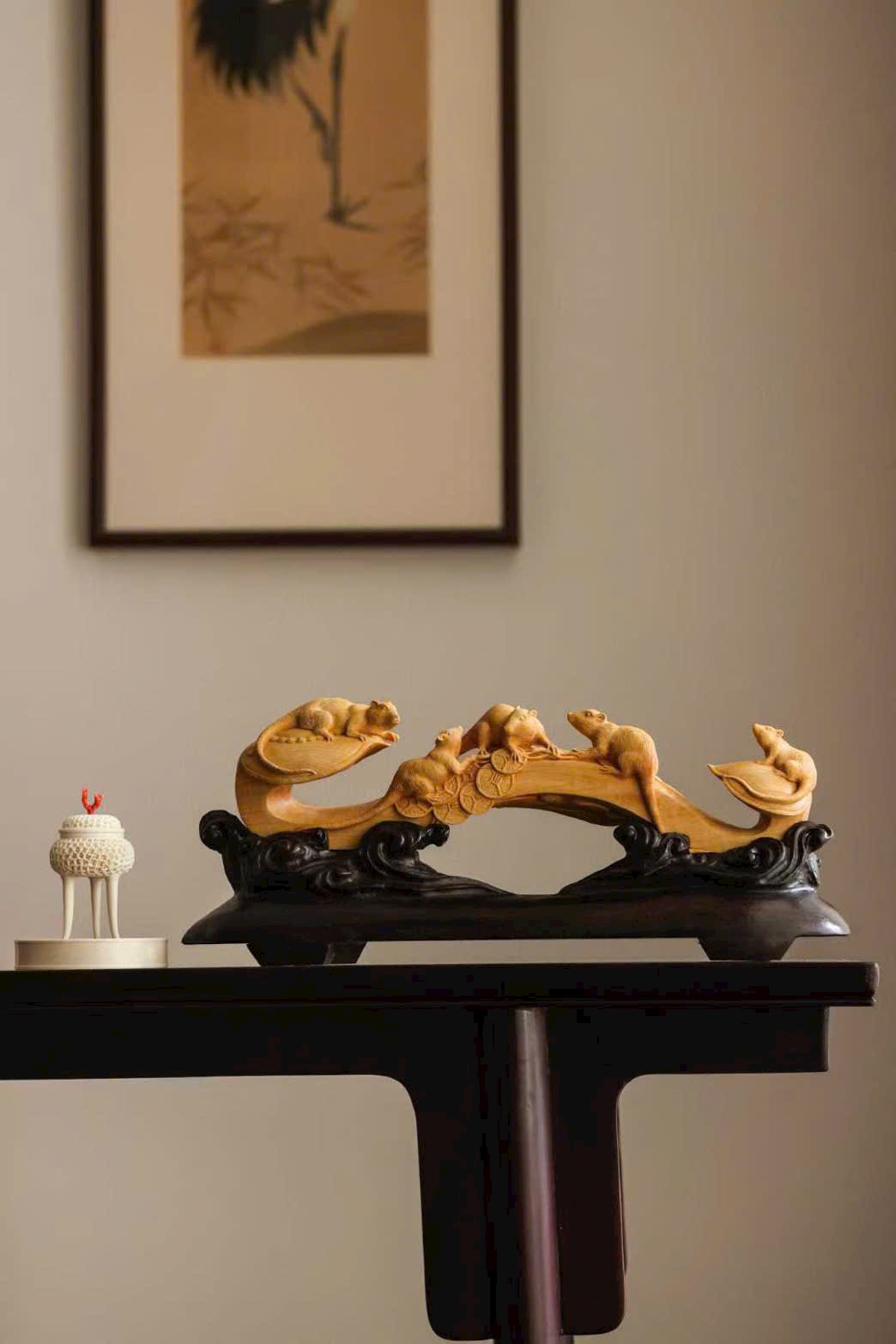 Bày nơi bàn làm việc hay phòng khách, mang ý chúc “Ngũ thử lai tài” — tiền tài sinh sôi, vận khí hanh thông, vạn sự như ý.