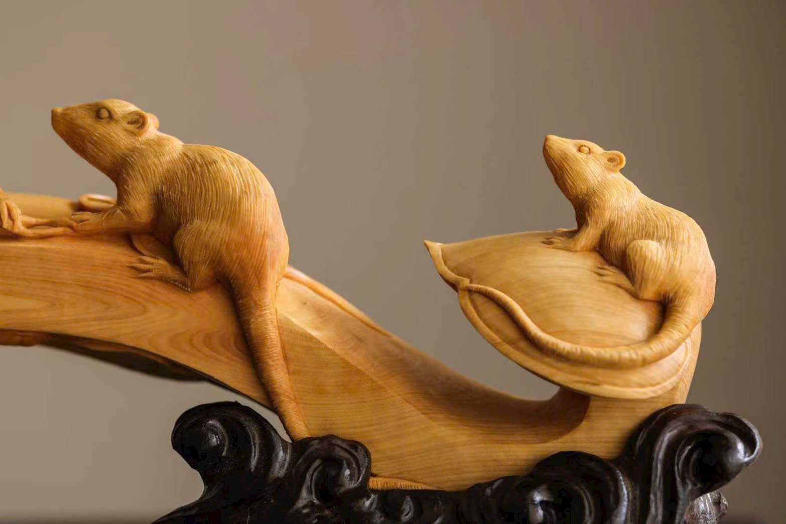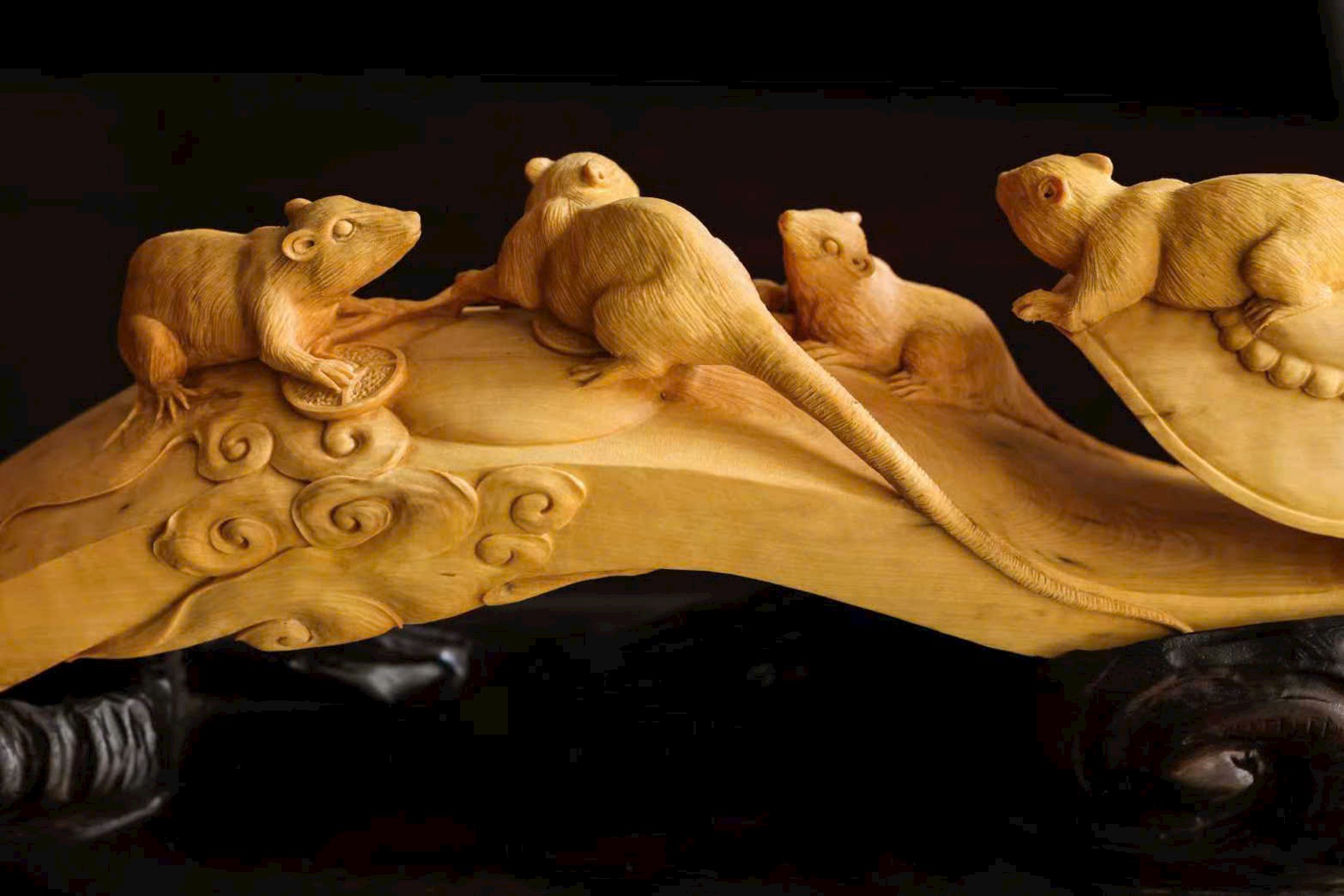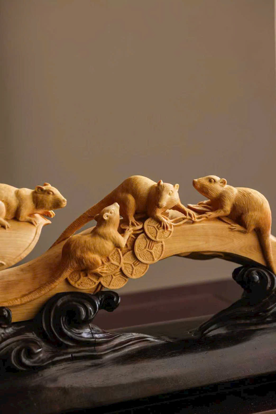Tác phẩm được chạm khắc liền khối từ một khúc gỗ ngọc dương, bố cục sắp đặt hài hòa, tầng lớp rõ ràng. Năm chú chuột được khắc họa sinh động, thần thái linh hoạt, phối hợp ăn ý, tràn đầy linh khí.