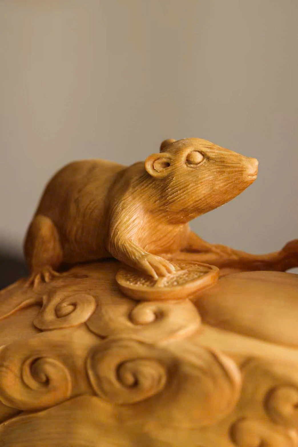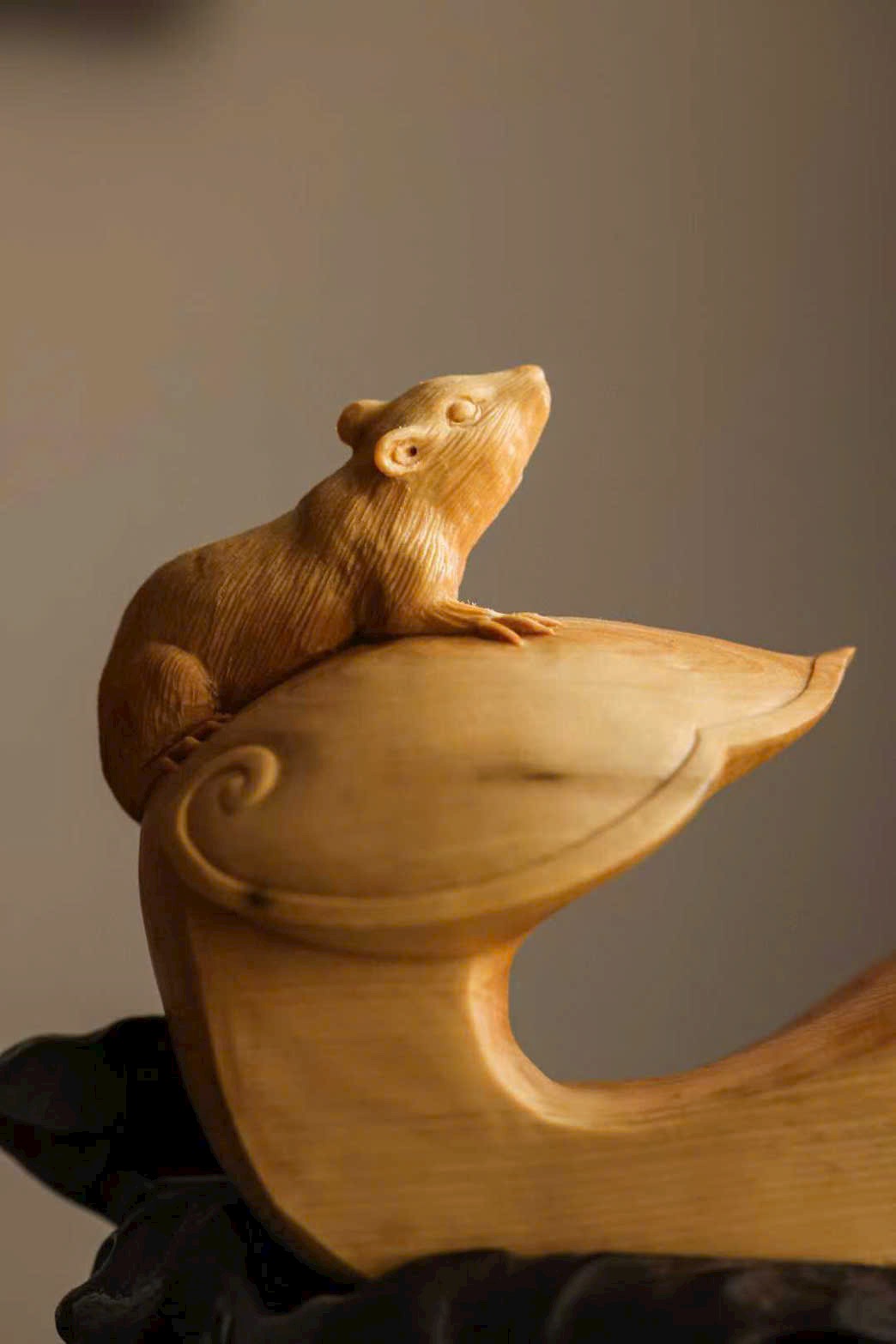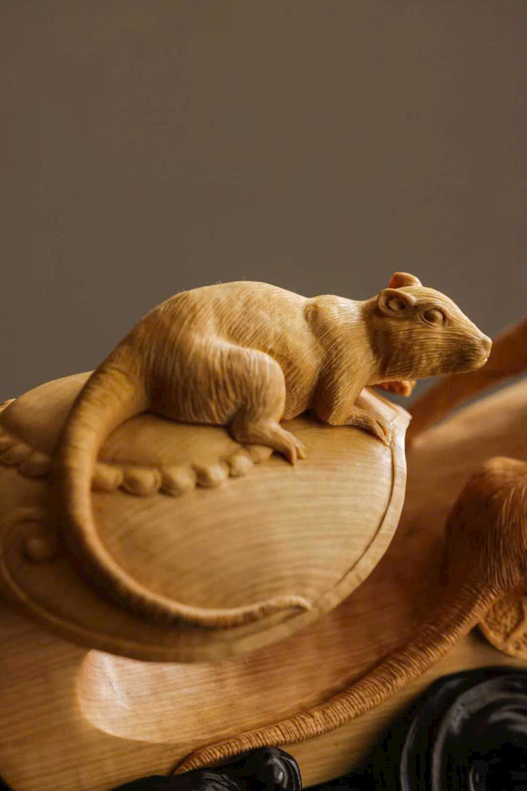 Tác phẩm được chạm khắc liền khối từ một khúc gỗ ngọc dương, bố cục sắp đặt hài hòa, tầng lớp rõ ràng. Năm chú chuột được khắc họa sinh động, thần thái linh hoạt, phối hợp ăn ý, tràn đầy linh khí.