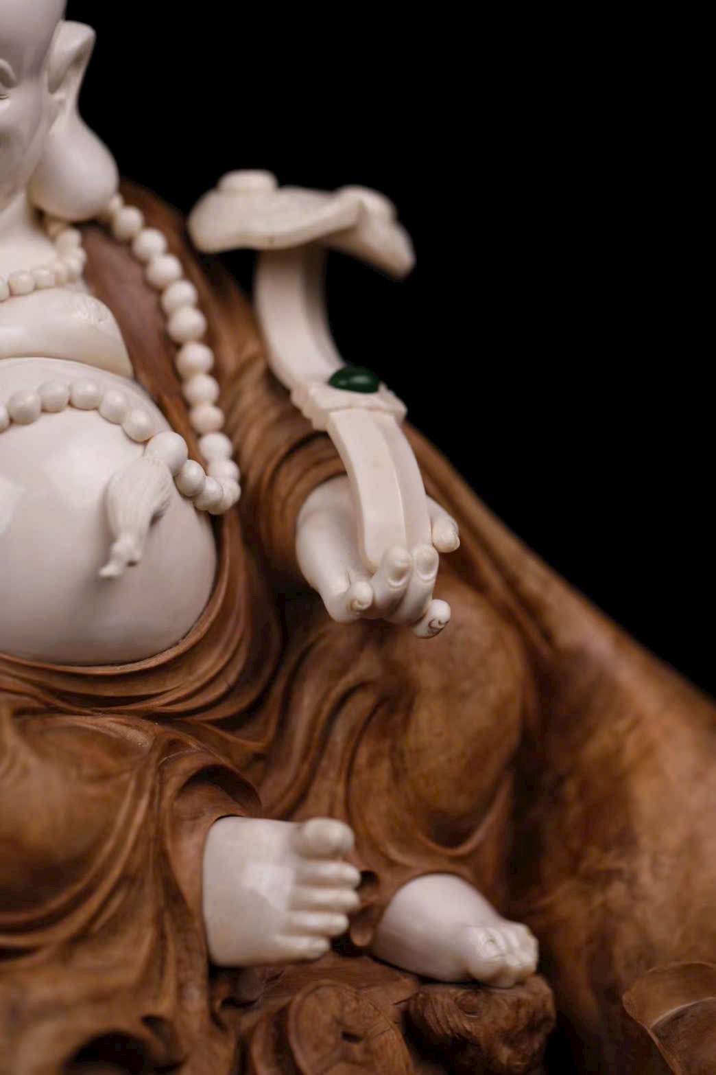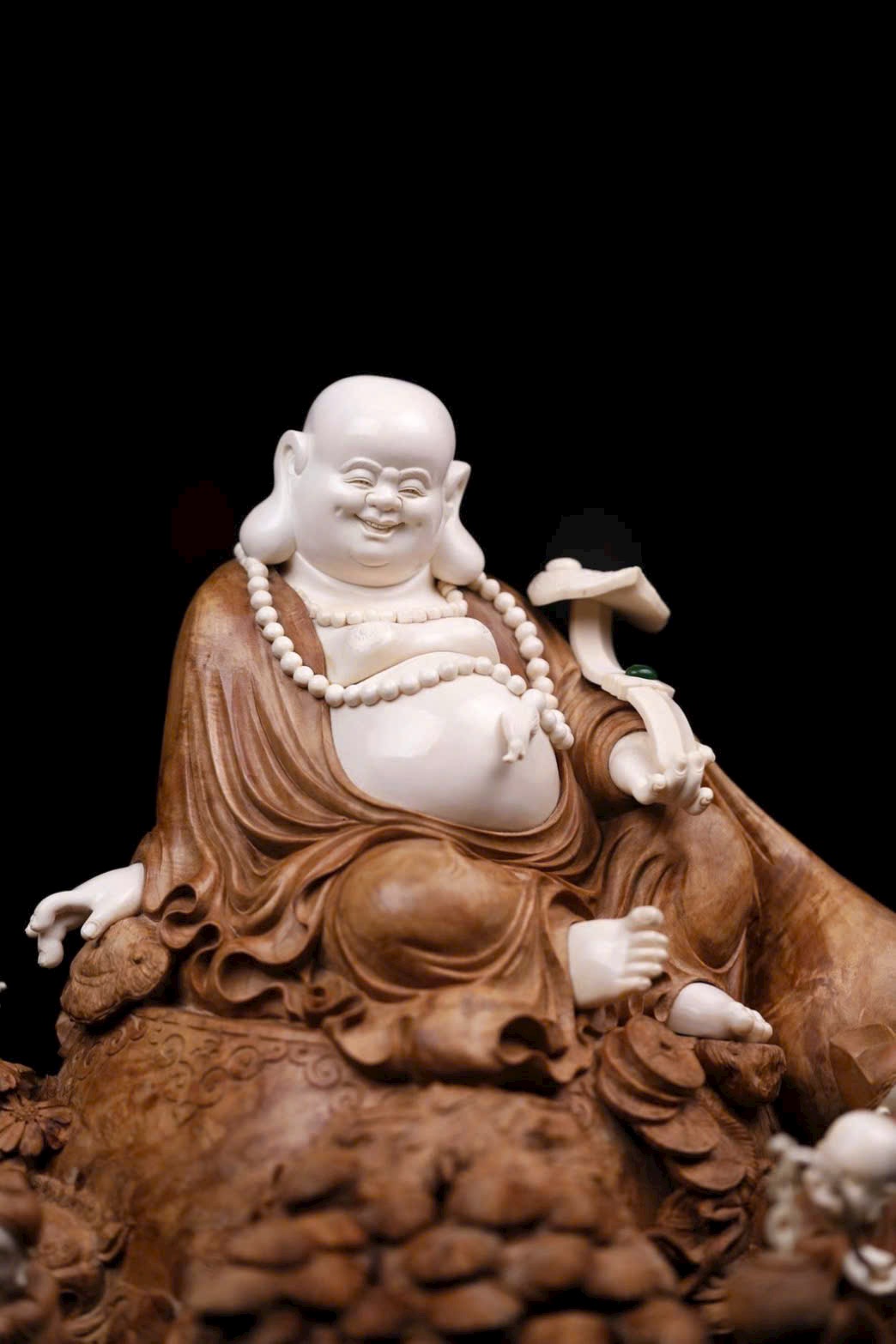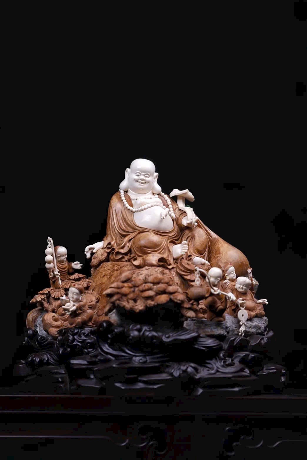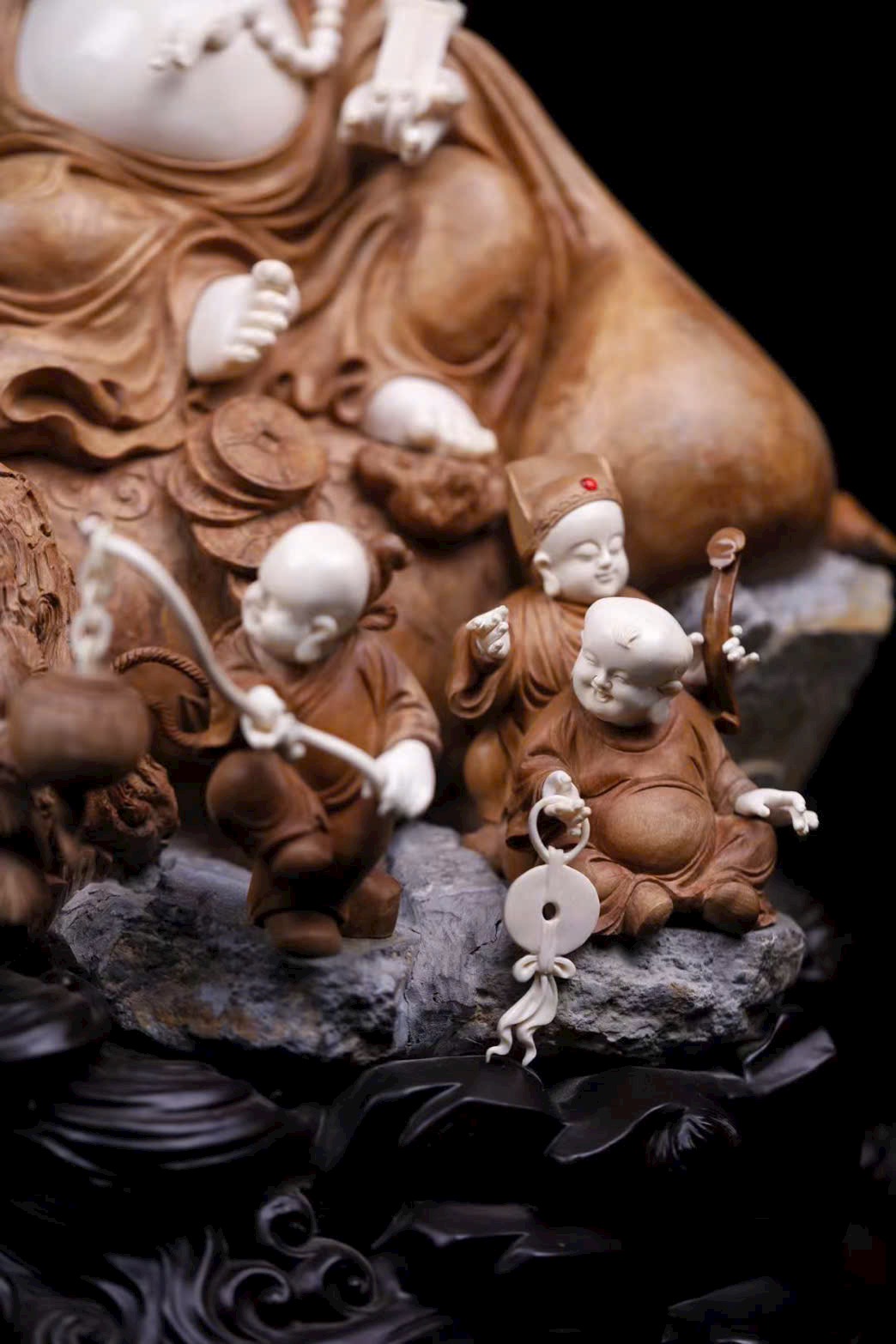• Chất liệu: Gỗ Lão Sơn Đàn Hương, giữ nguyên hình đá tự nhiên làm đế; nạm ngà voi ma mút tạo hình Di Lặc: bụng trần, cười tươi, chuỗi hạt rủ trước ngực, tay cầm Như Ý mang phúc lộc.