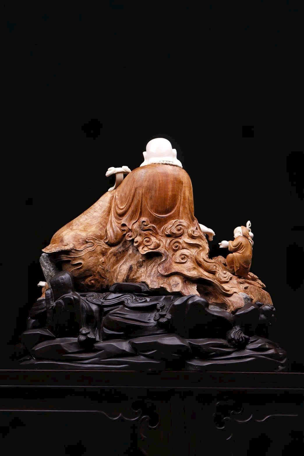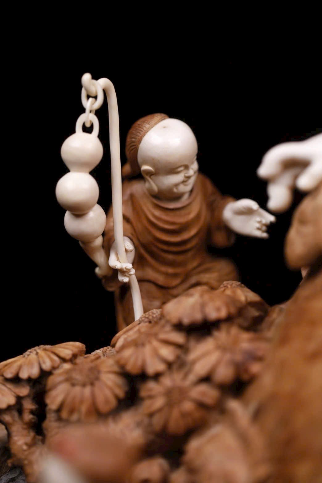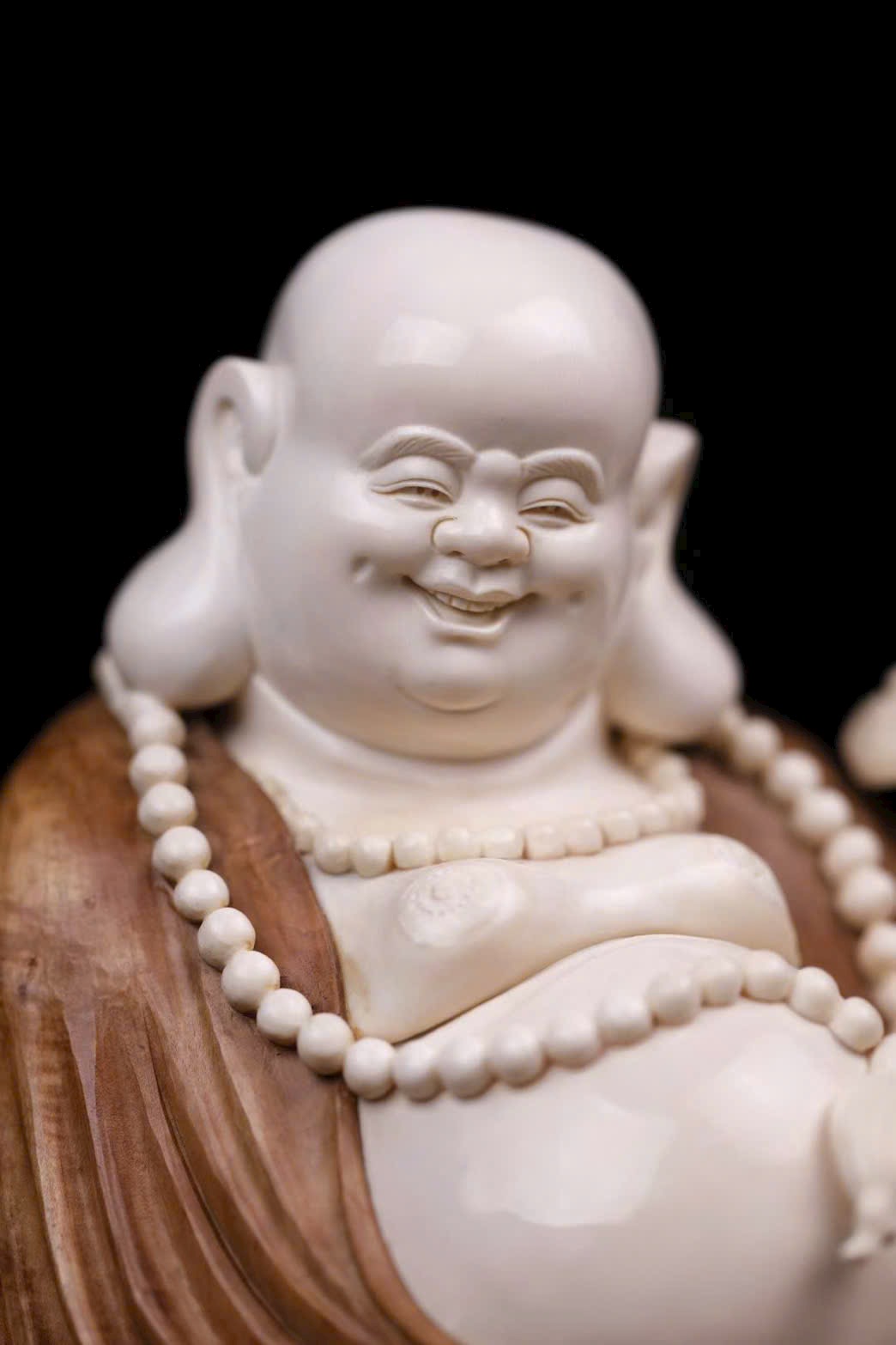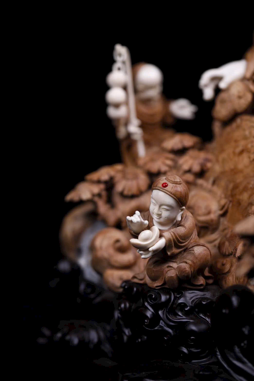 • Chất liệu: Gỗ Lão Sơn Đàn Hương, giữ nguyên hình đá tự nhiên làm đế; nạm ngà voi ma mút tạo hình Di Lặc: bụng trần, cười tươi, chuỗi hạt rủ trước ngực, tay cầm Như Ý mang phúc lộc.