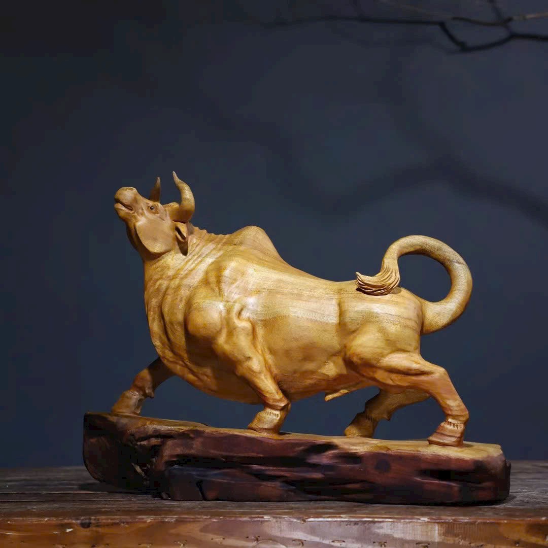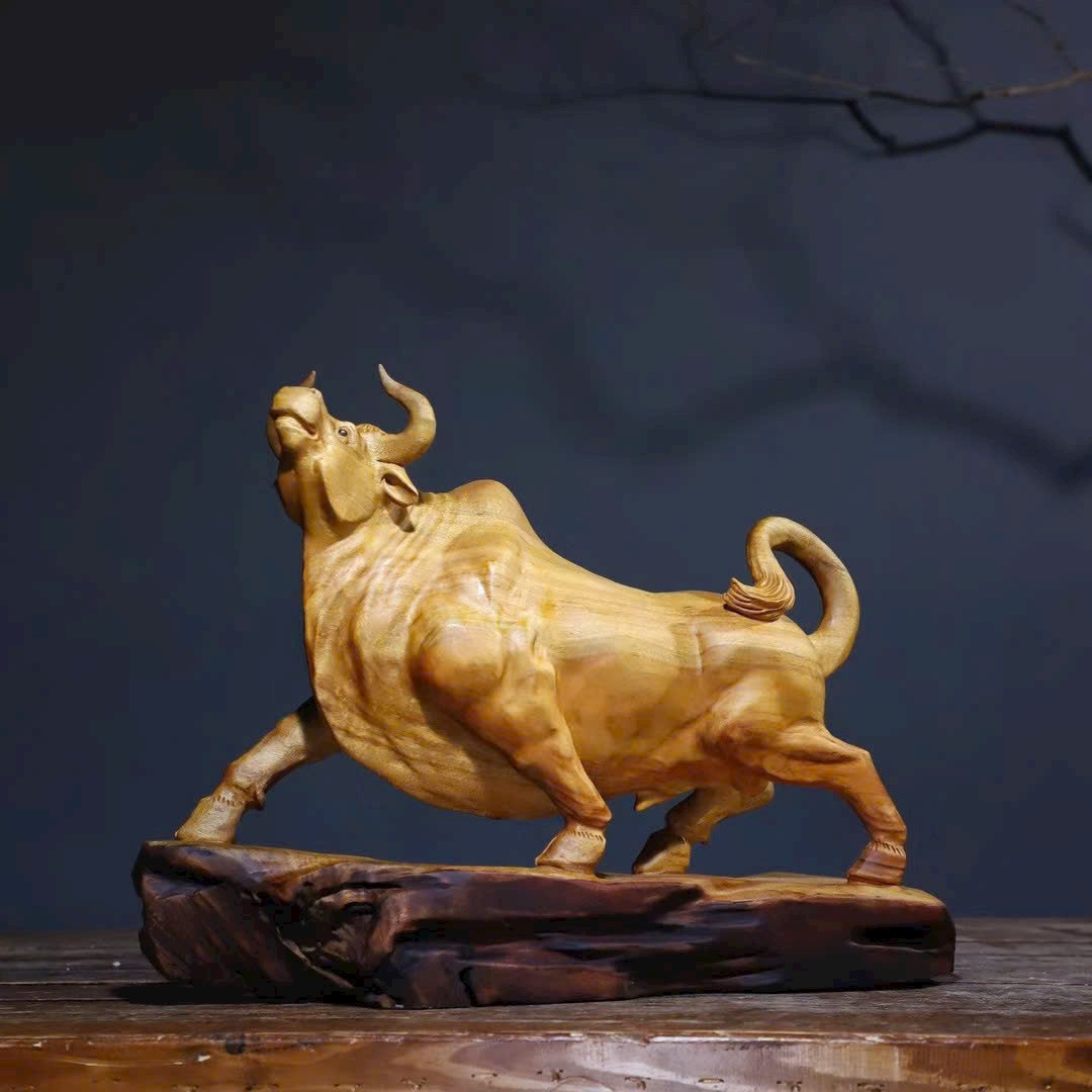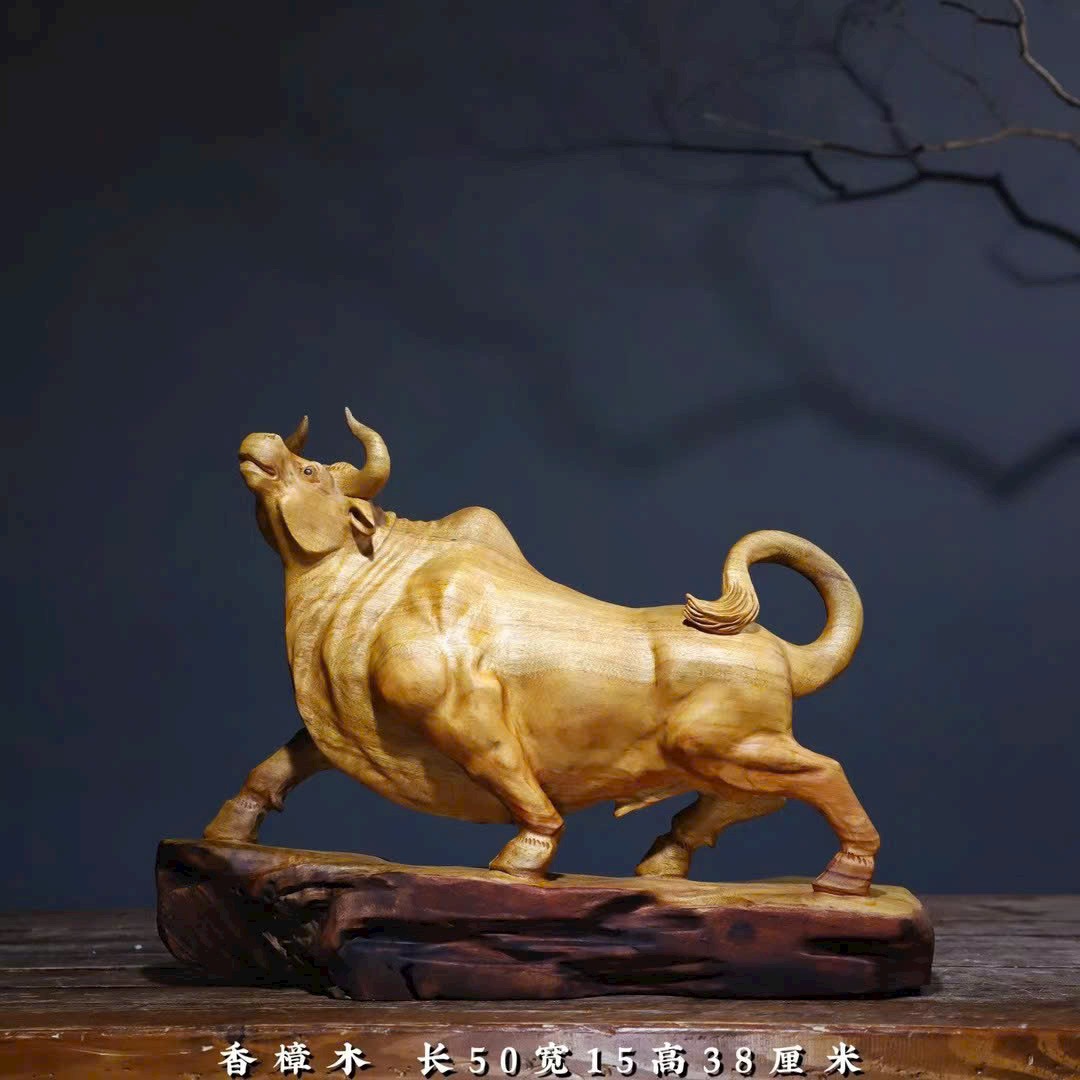 Tác phẩm gỗ long não chạm khắc hình trâu với thần thái mạnh mẽ, dáng thế vươn cao, tượng trưng cho khí thế bứt phá – may mắn – thăng tiến.