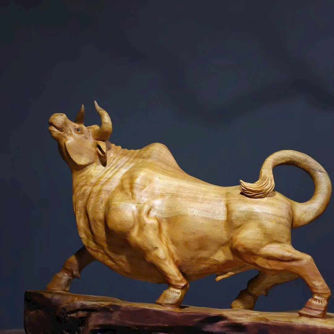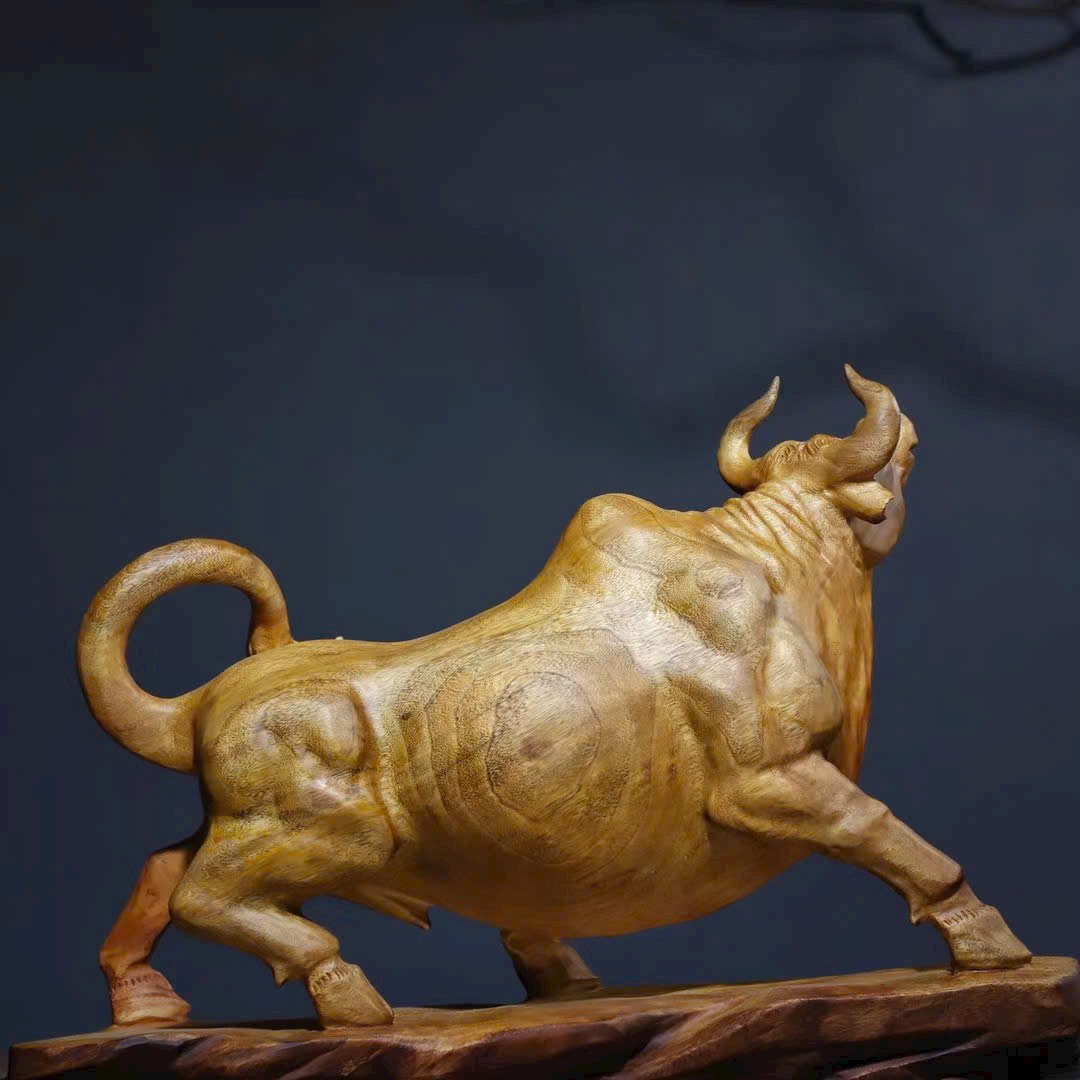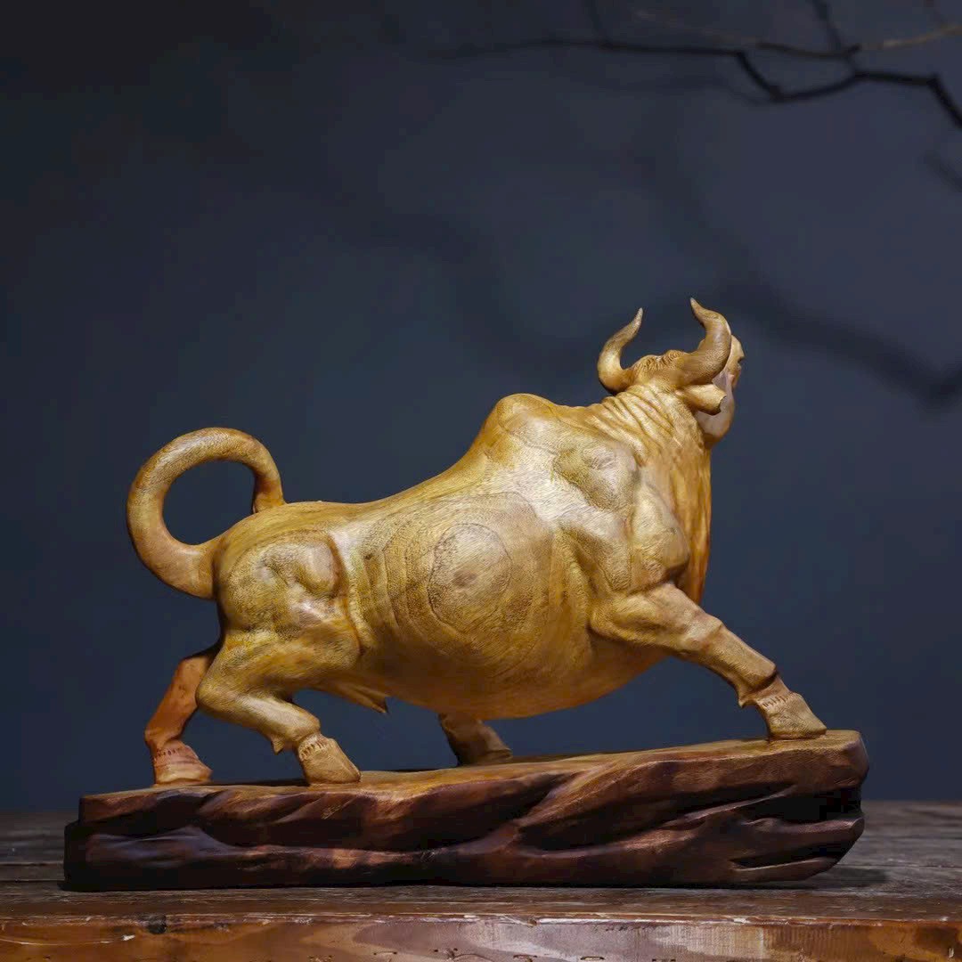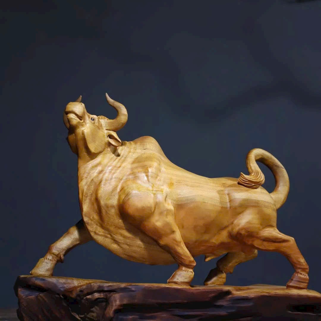 Tác phẩm gỗ long não chạm khắc hình trâu với thần thái mạnh mẽ, dáng thế vươn cao, tượng trưng cho khí thế bứt phá – may mắn – thăng tiến.