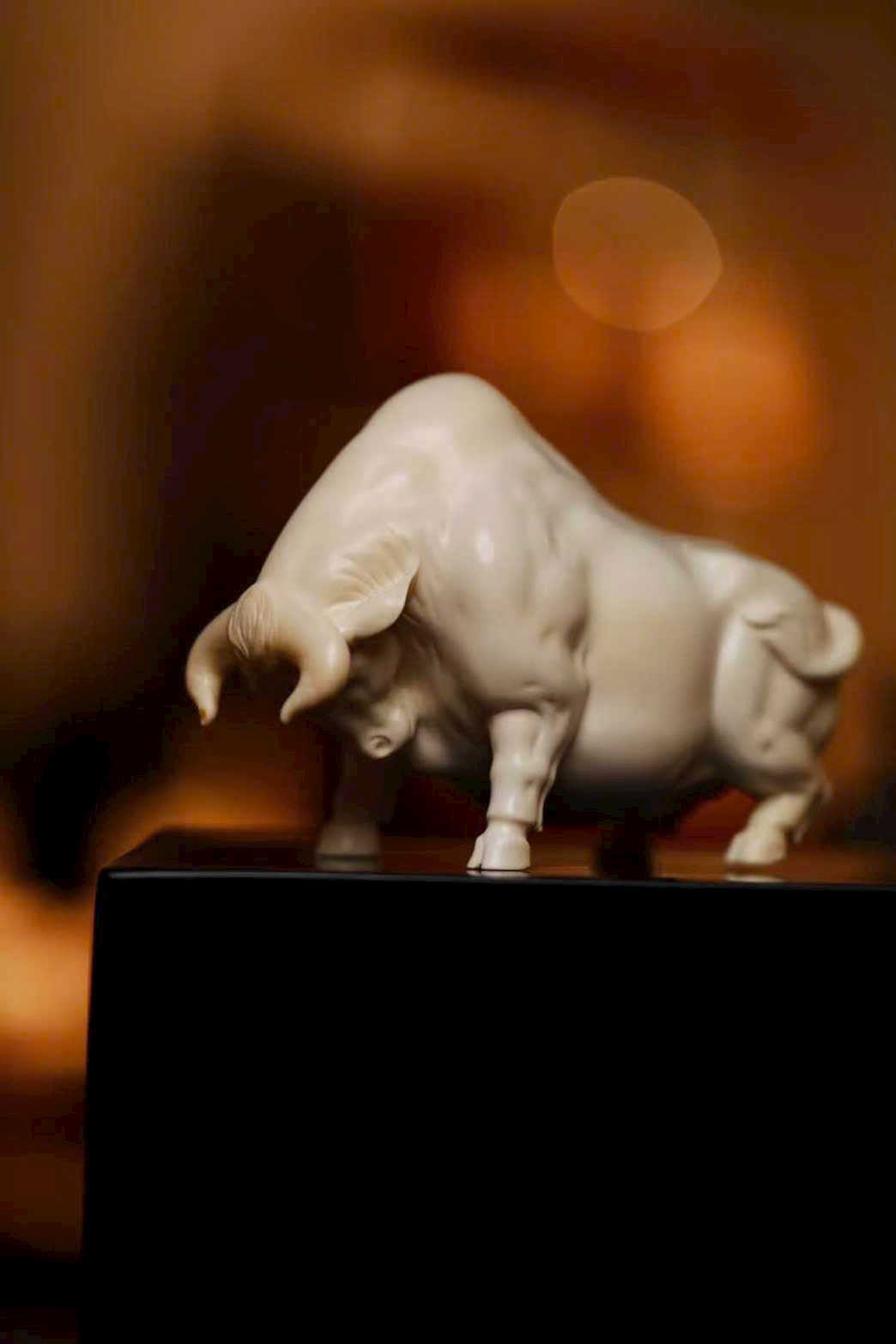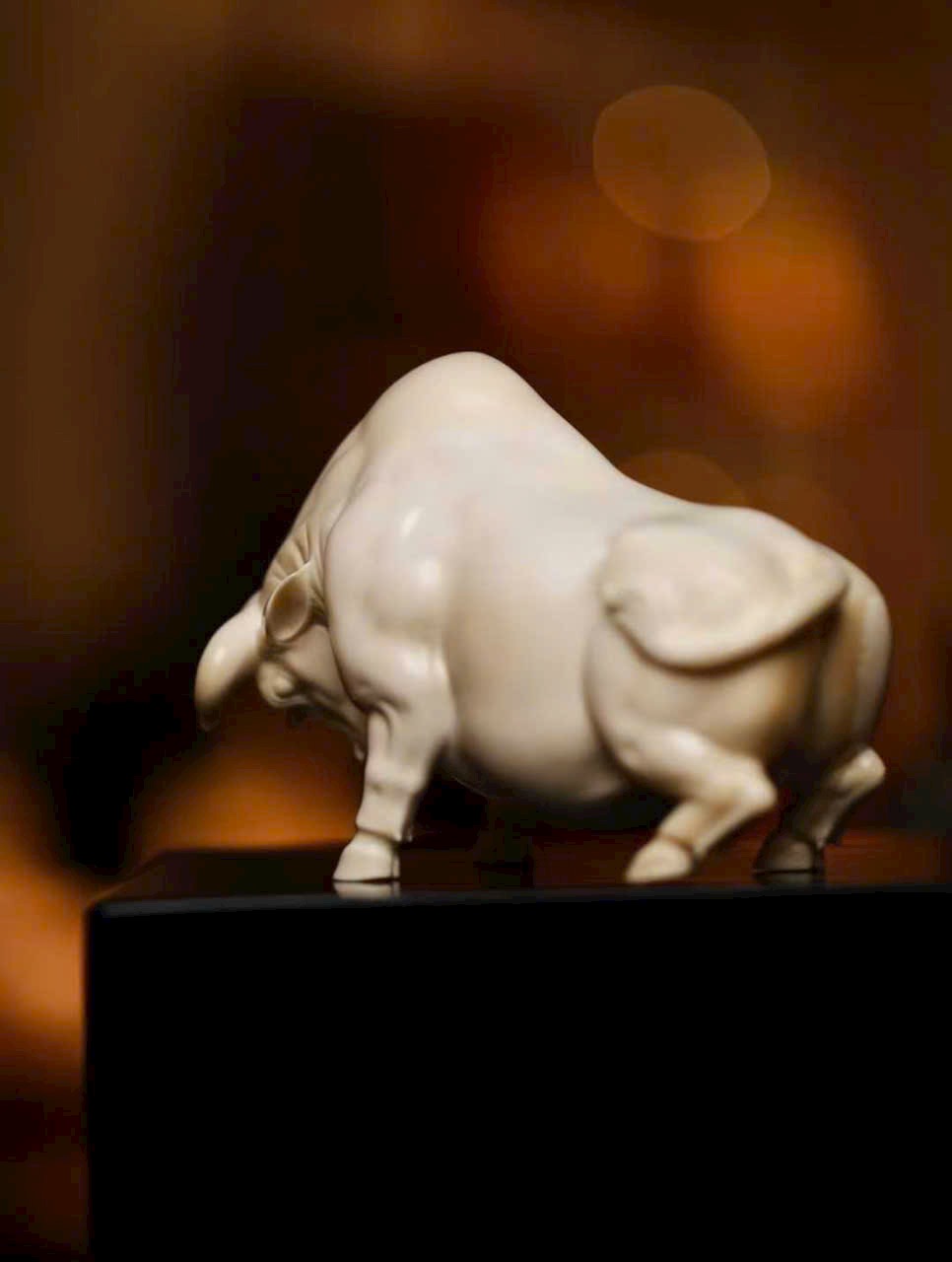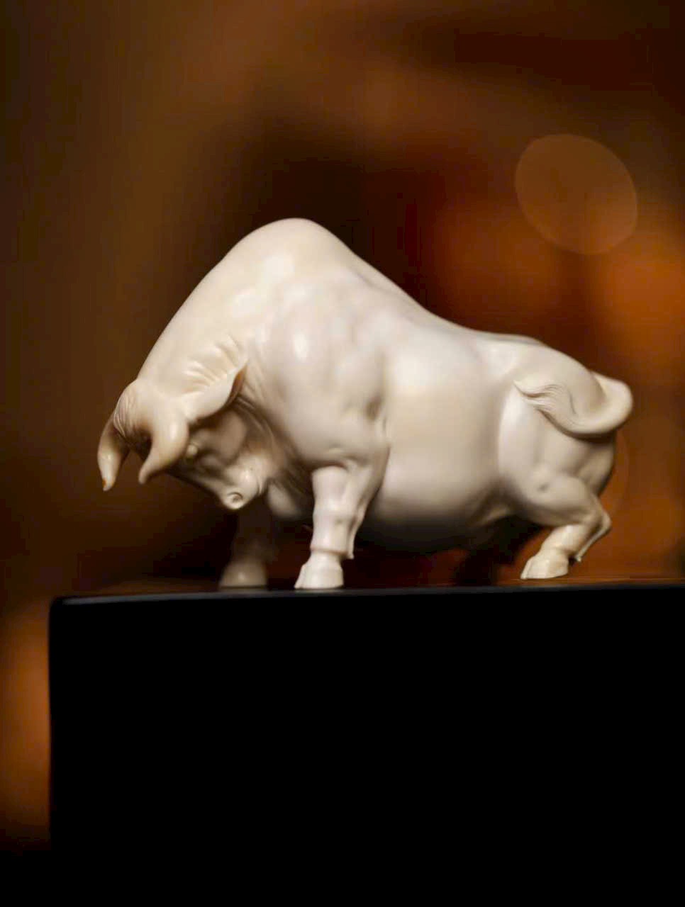 Chạm khắc tinh xảo từ nguyên khối, chất n.gà bóng nhuận trong mịn, không tì vết. Ánh ngà lưu chuyển tự nhiên, tôn lên vóc dáng rắn rỏi, cơ bắp khỏe khoắn. Dáng phúc ngưu vững chãi mà linh động, thần thái hiền hòa nhưng vẫn toát khí chất nổi bật. Bàn tay nghệ nhân danh tiếng thổi hồn vào ngà ma mút, thu nạp cát tường trong từng đường nét — xứng đáng là tác phẩm sưu tầm đẳng cấp.