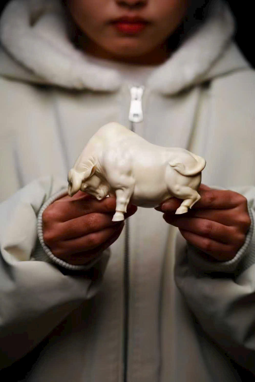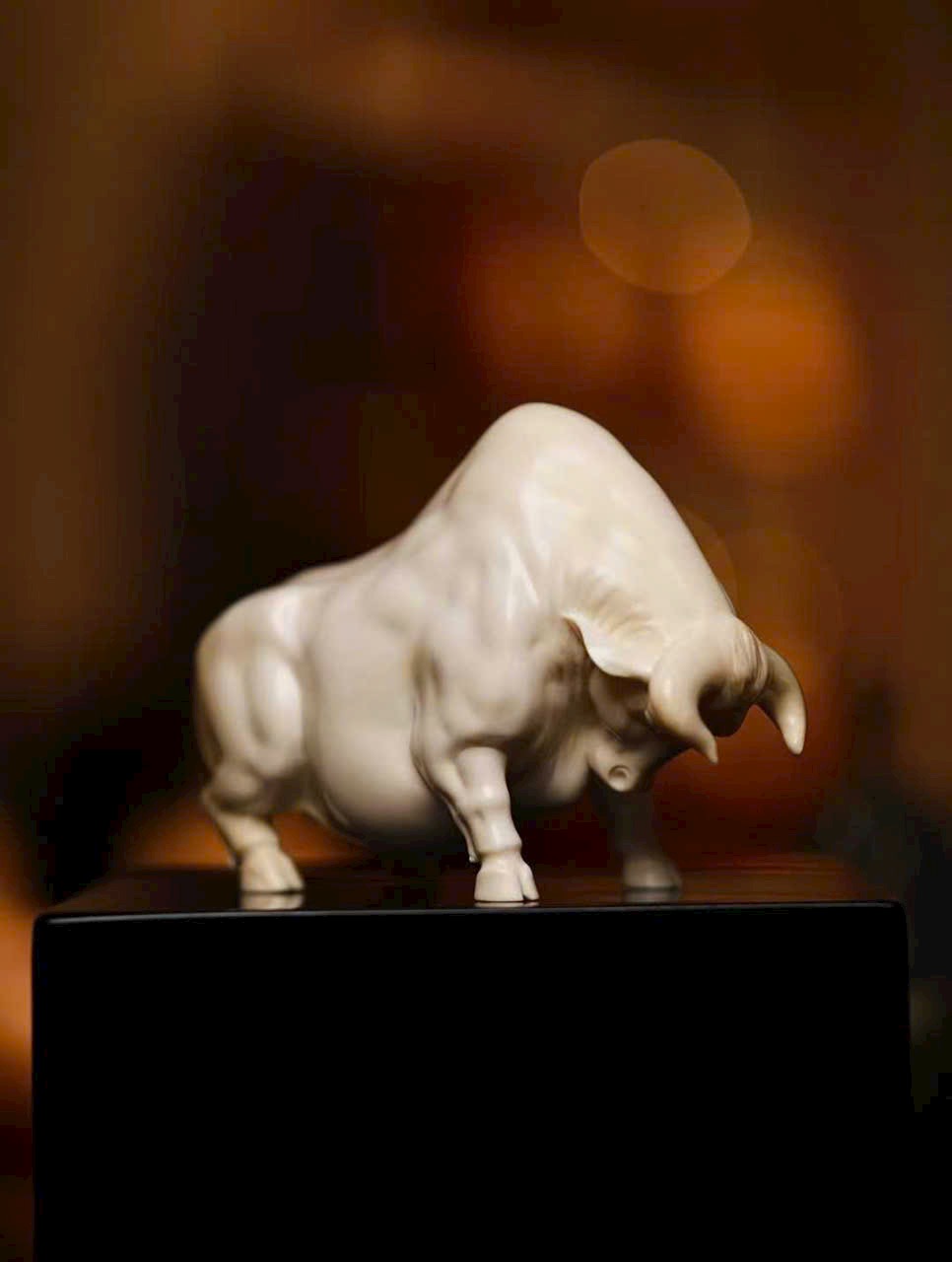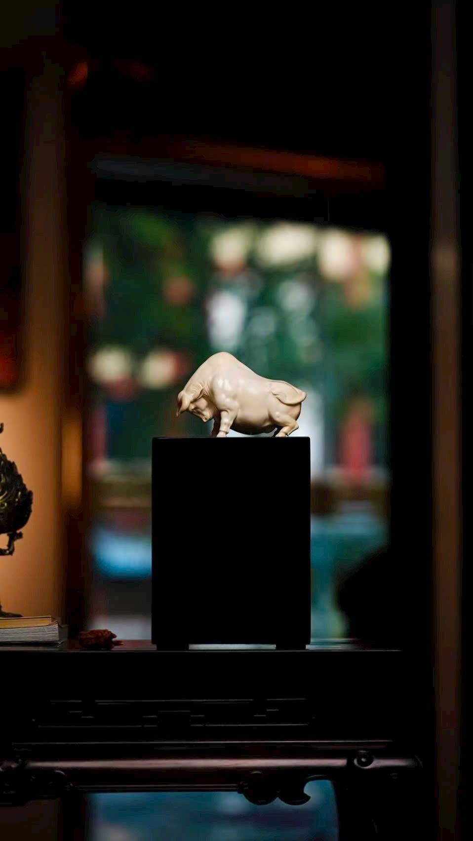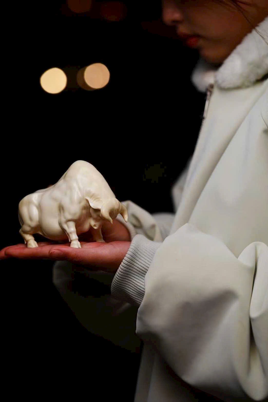 Chạm khắc tinh xảo từ nguyên khối, chất n.gà bóng nhuận trong mịn, không tì vết. Ánh ngà lưu chuyển tự nhiên, tôn lên vóc dáng rắn rỏi, cơ bắp khỏe khoắn. Dáng phúc ngưu vững chãi mà linh động, thần thái hiền hòa nhưng vẫn toát khí chất nổi bật. Bàn tay nghệ nhân danh tiếng thổi hồn vào ngà ma mút, thu nạp cát tường trong từng đường nét — xứng đáng là tác phẩm sưu tầm đẳng cấp.