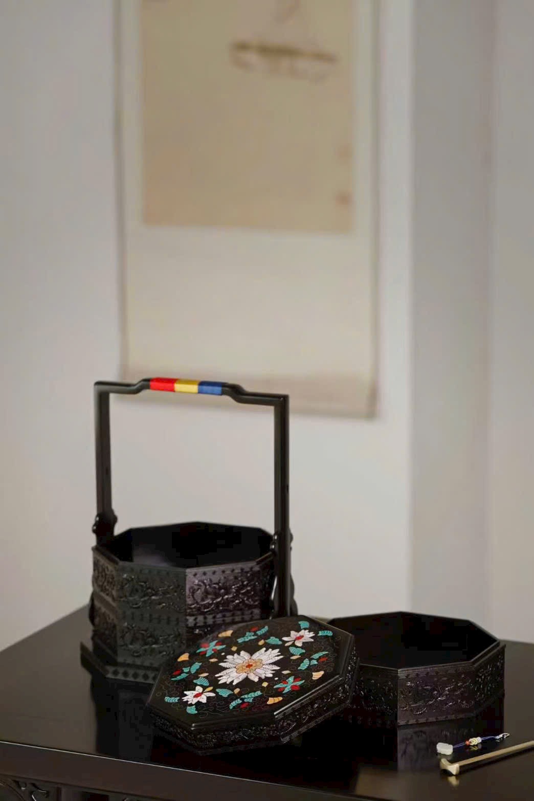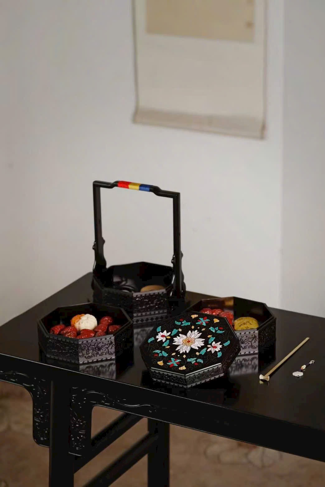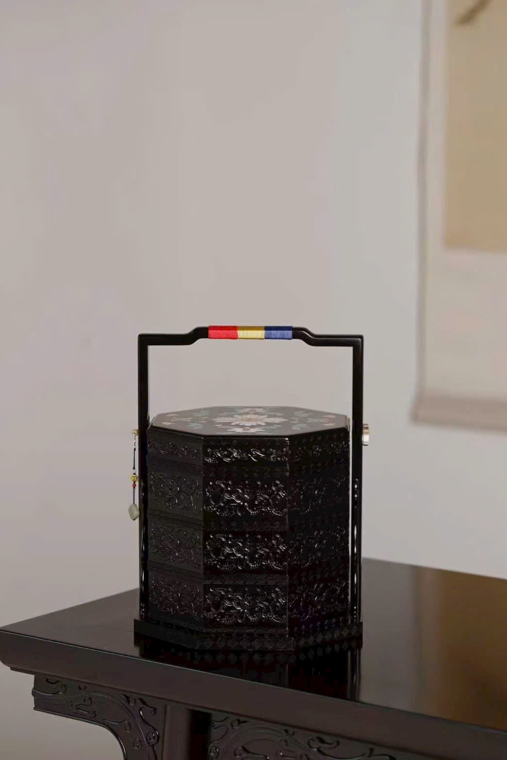 Thiết kế ba tầng, vừa đẹp mắt vừa tiện dụng; ngoài công năng lưu trữ, còn thích hợp đặt trên trà tịch để đựng trà bánh, tăng thêm phong vị tao nhã.