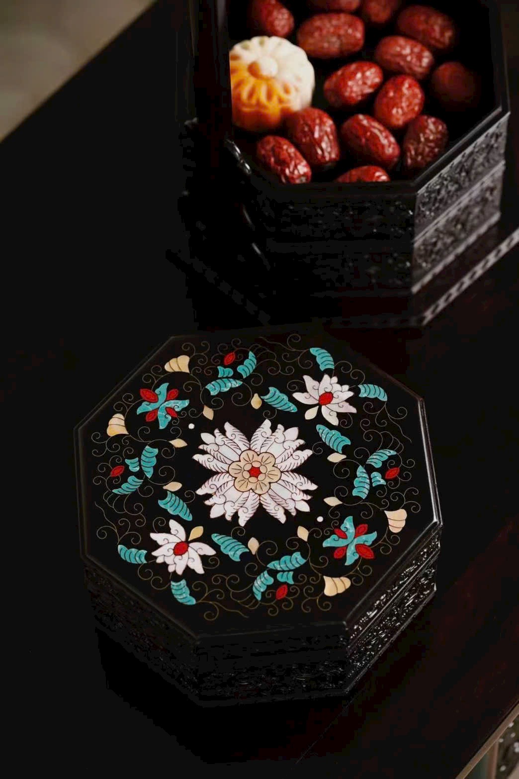 Chế tác từ gỗ tử quang đàn tuyển chọn, nắp hộp ứng dụng kỹ thuật khảm xà cừ kết hợp khảm chỉ đồng, tạo họa tiết Tây Phan Liên tinh xảo, ánh sắc hài hòa.