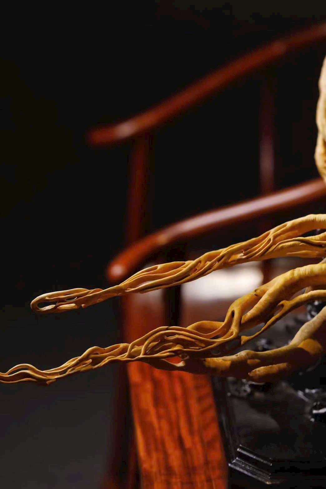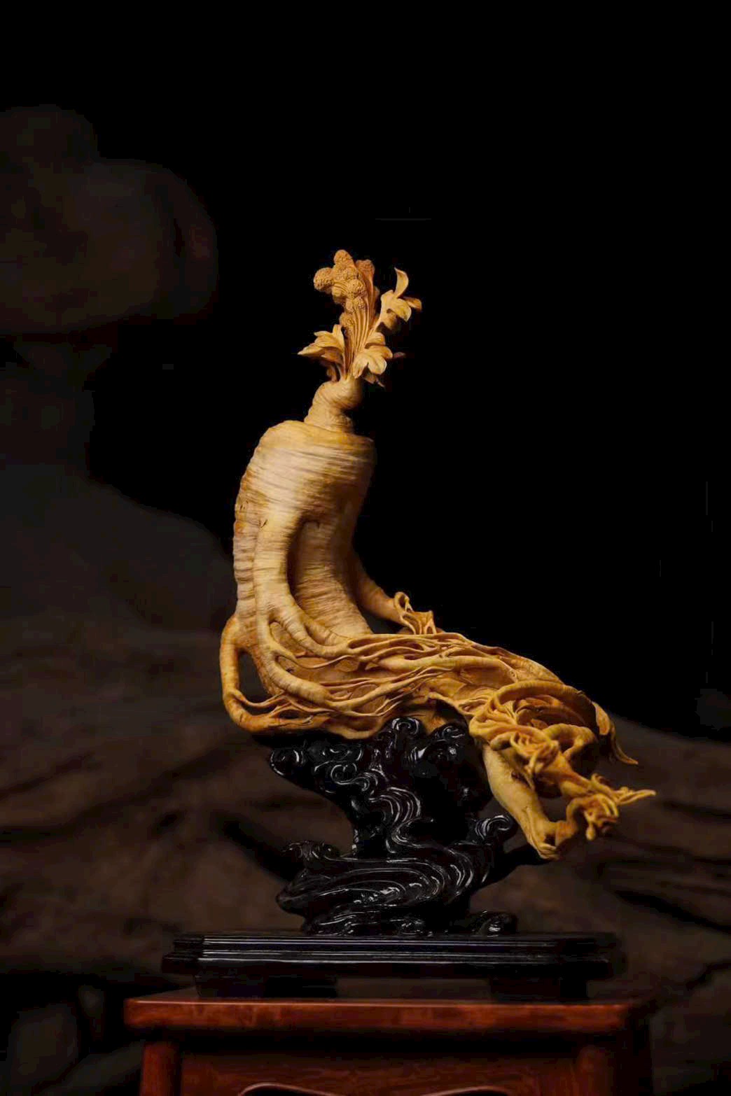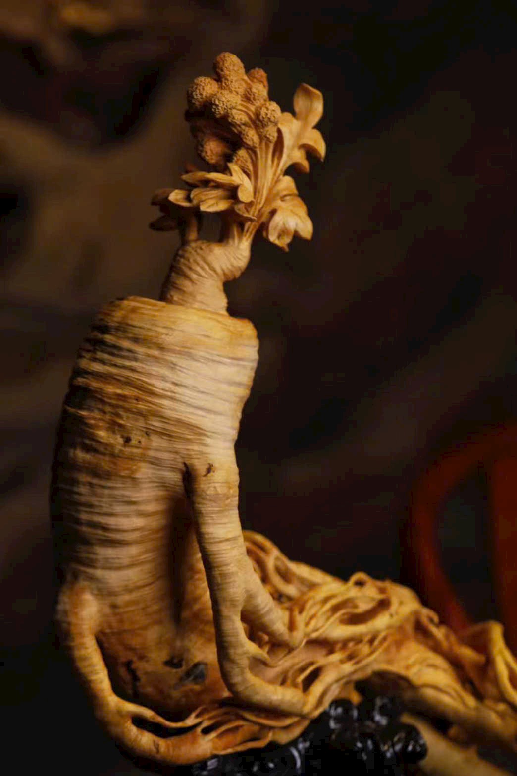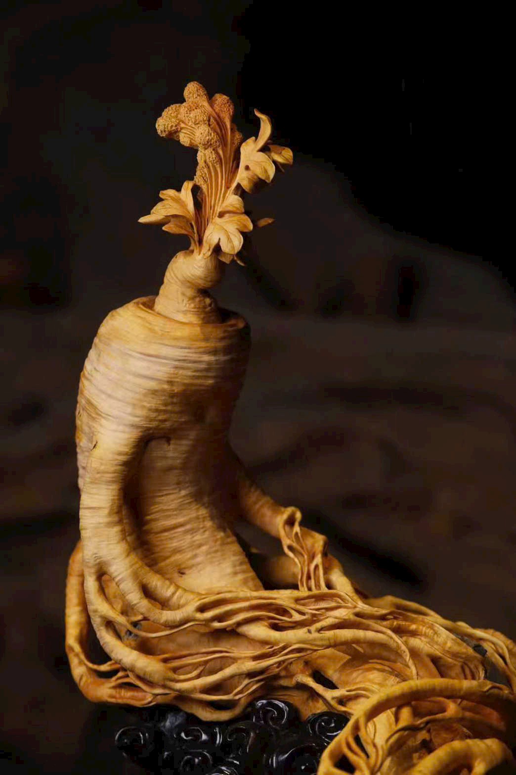 Tạc nguyên khối từ một thân gỗ, sắc hoàng nhuận mịn như mỡ đông. Đường dao tinh vi đi sâu vào từng chi tiết, rễ nhân sâm với nếp gấp tự nhiên, vừa mang khí chất cương nghị vừa ẩn nét linh động. Hình thức tả thực sống động, rễ tua cuốn quấn phóng khoáng; ý nghĩa phúc lành viên mãn, toát lên linh vận của thảo mộc. Bày nơi án thư, bàn trà thêm phần thanh nhã; làm quà biếu tặng gửi gắm lời chúc an khang cát tường.