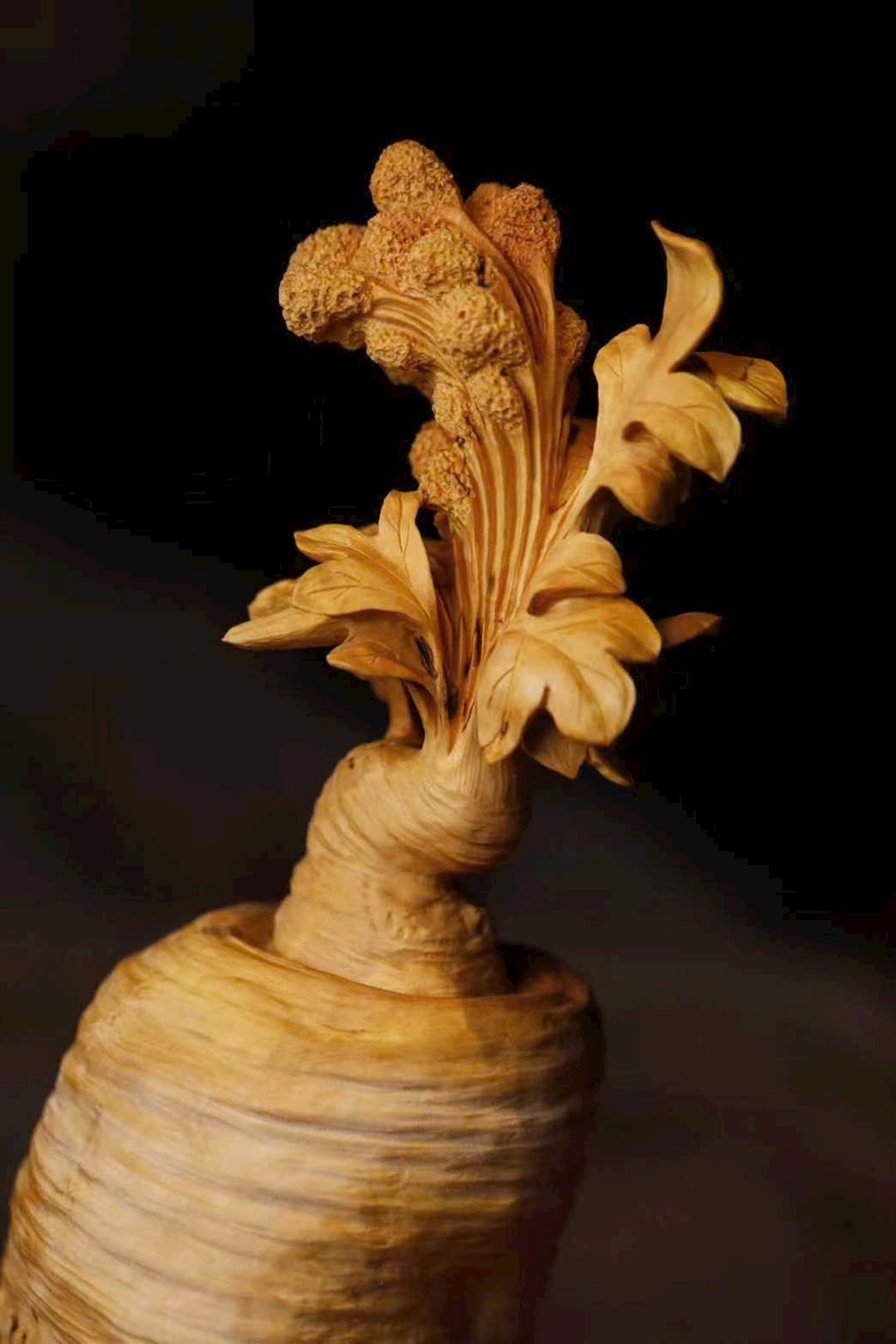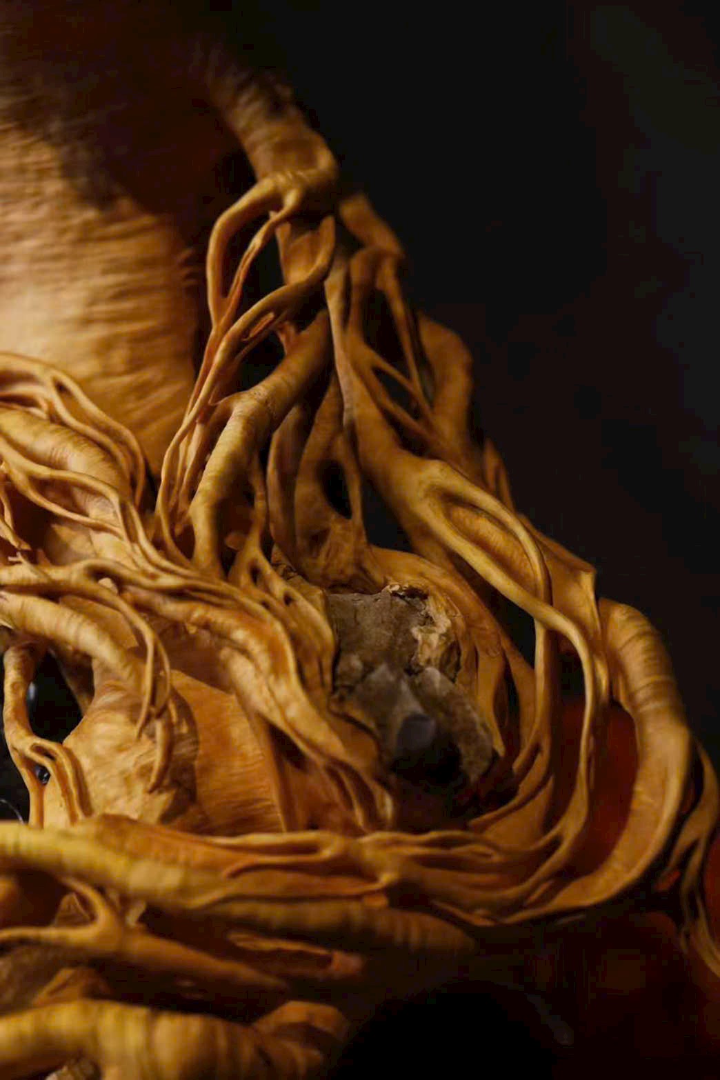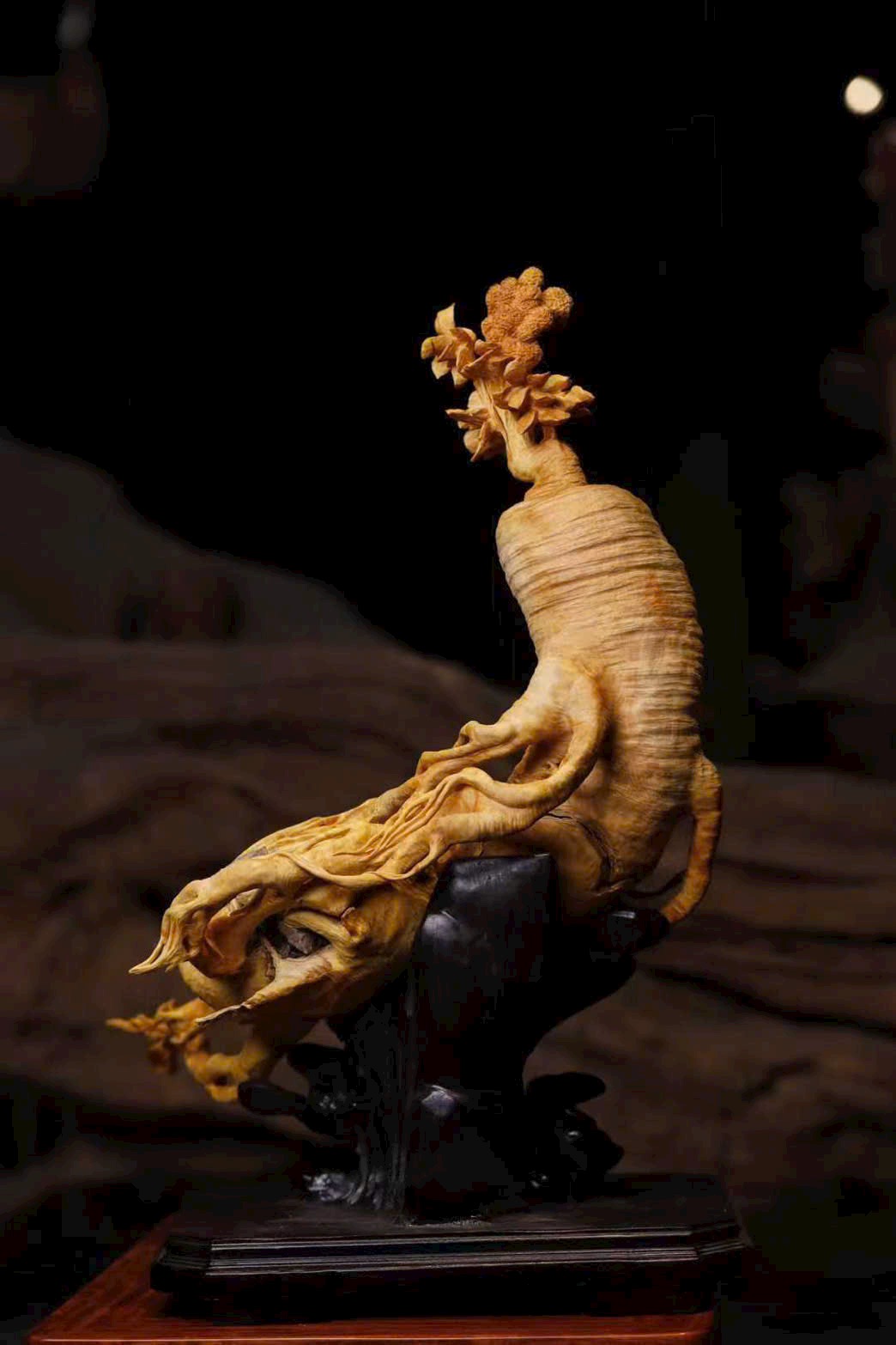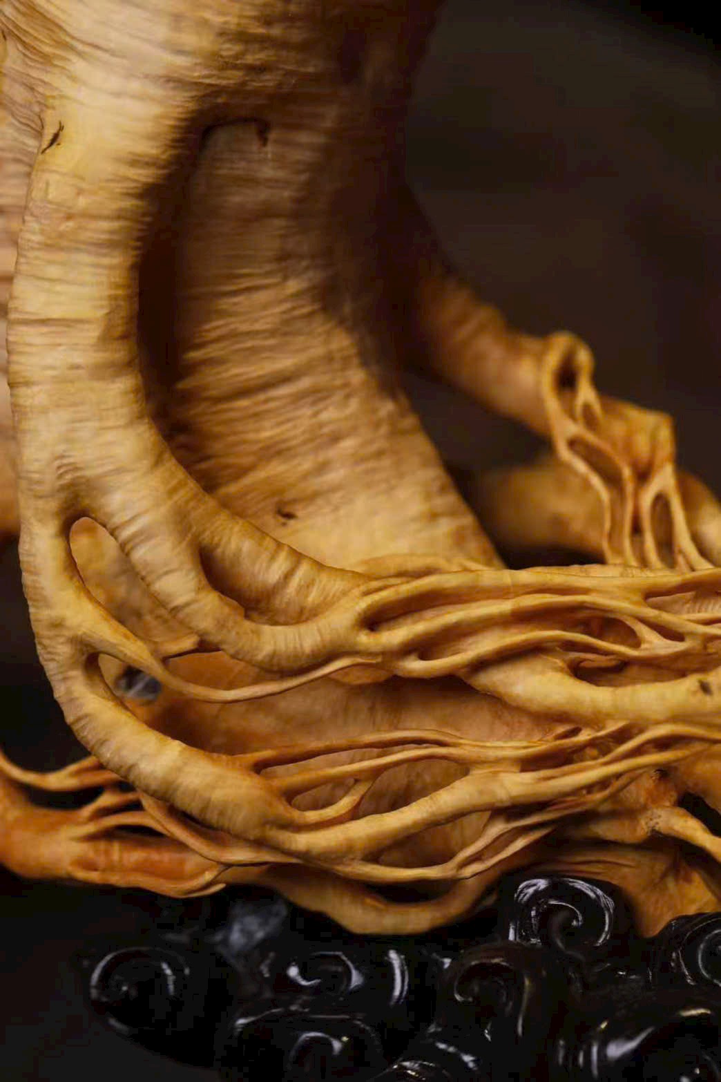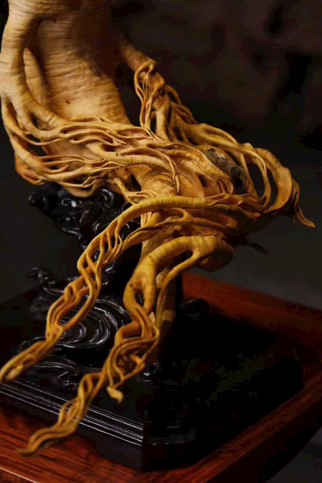 Tạc nguyên khối từ một thân gỗ, sắc hoàng nhuận mịn như mỡ đông. Đường dao tinh vi đi sâu vào từng chi tiết, rễ nhân sâm với nếp gấp tự nhiên, vừa mang khí chất cương nghị vừa ẩn nét linh động. Hình thức tả thực sống động, rễ tua cuốn quấn phóng khoáng; ý nghĩa phúc lành viên mãn, toát lên linh vận của thảo mộc. Bày nơi án thư, bàn trà thêm phần thanh nhã; làm quà biếu tặng gửi gắm lời chúc an khang cát tường.