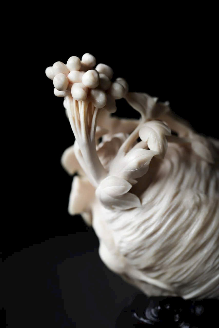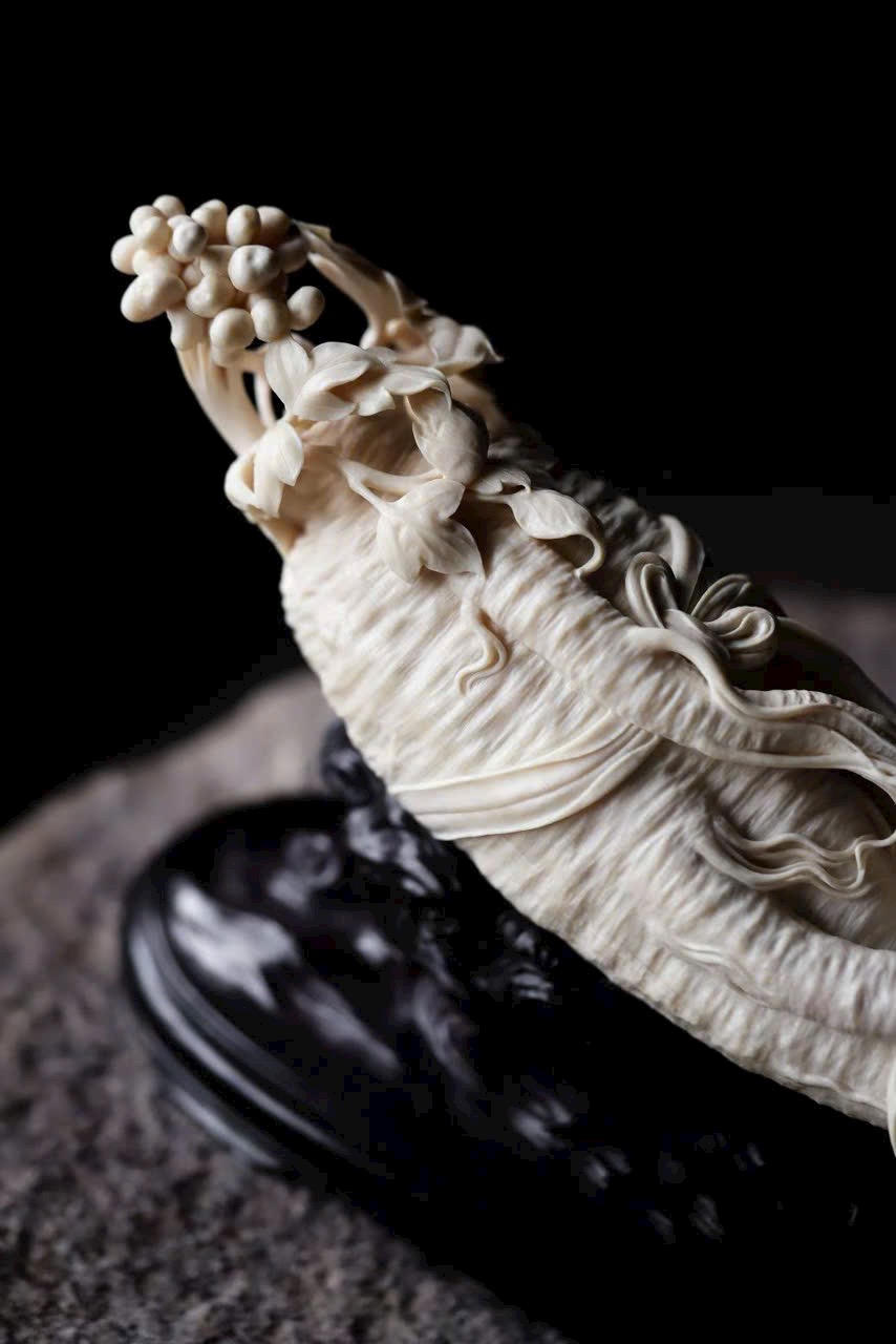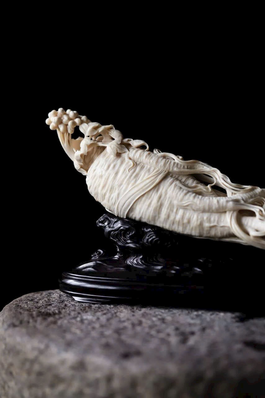 Chất n.gà sáng bóng như mỡ, theo dáng tự nhiên mà chạm khắc hình nhân sâm uốn lượn.