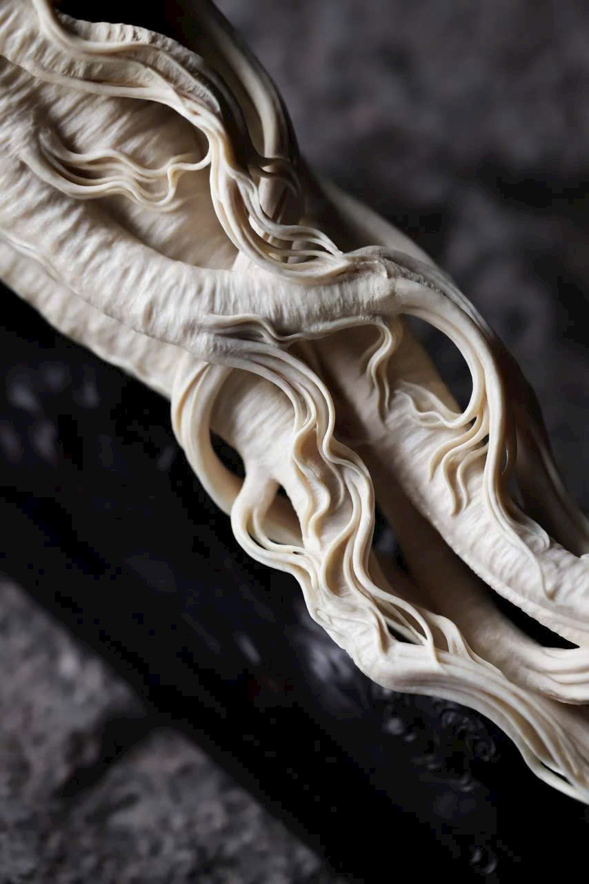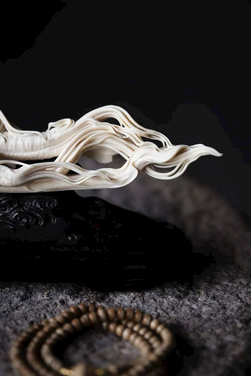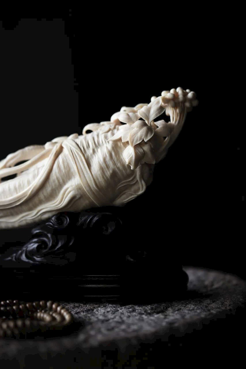 Chất n.gà sáng bóng như mỡ, theo dáng tự nhiên mà chạm khắc hình nhân sâm uốn lượn.